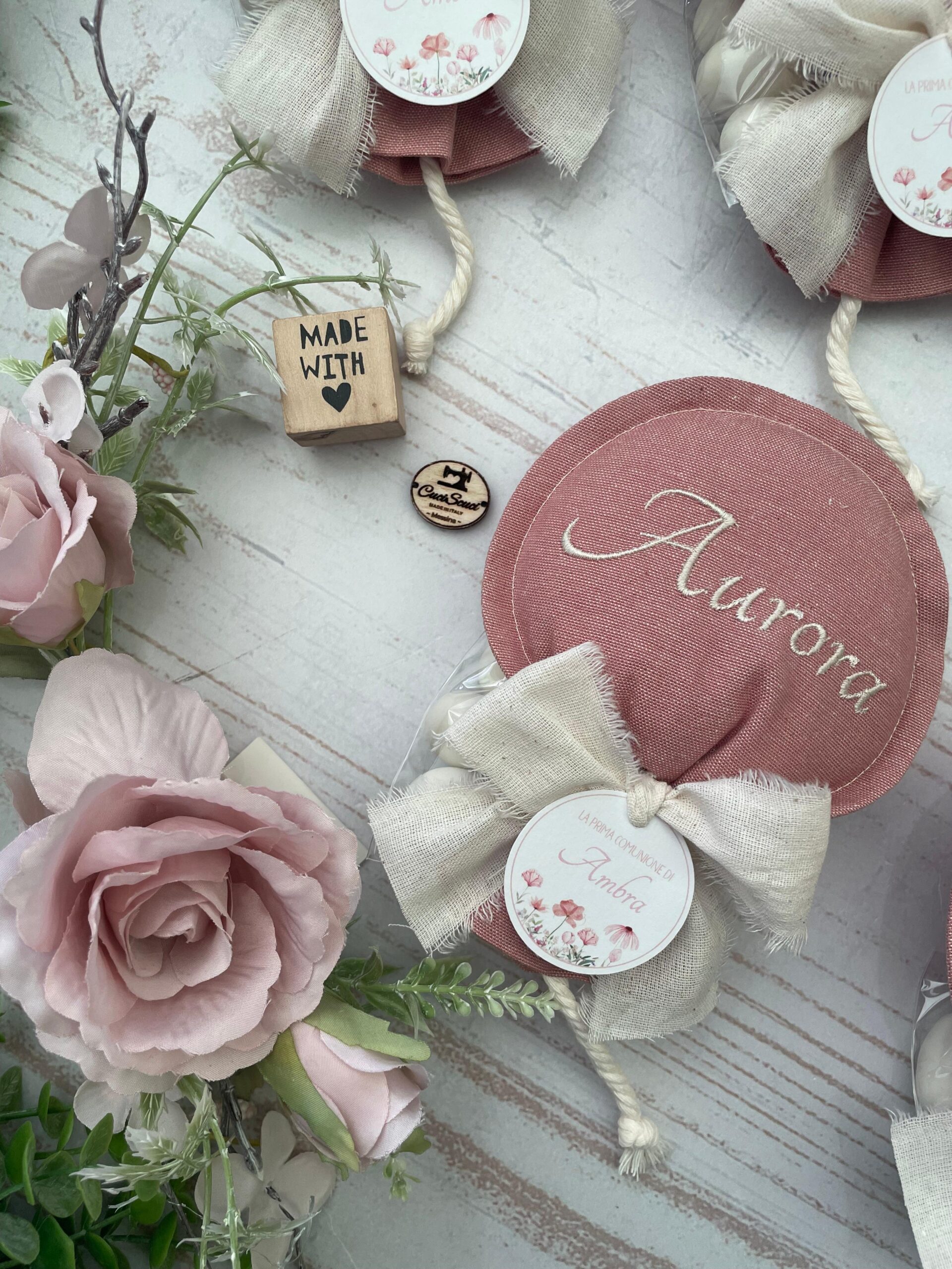 Confezionato: bomboniera pronta da donare, completa di ricamo, fiocco e confetti.