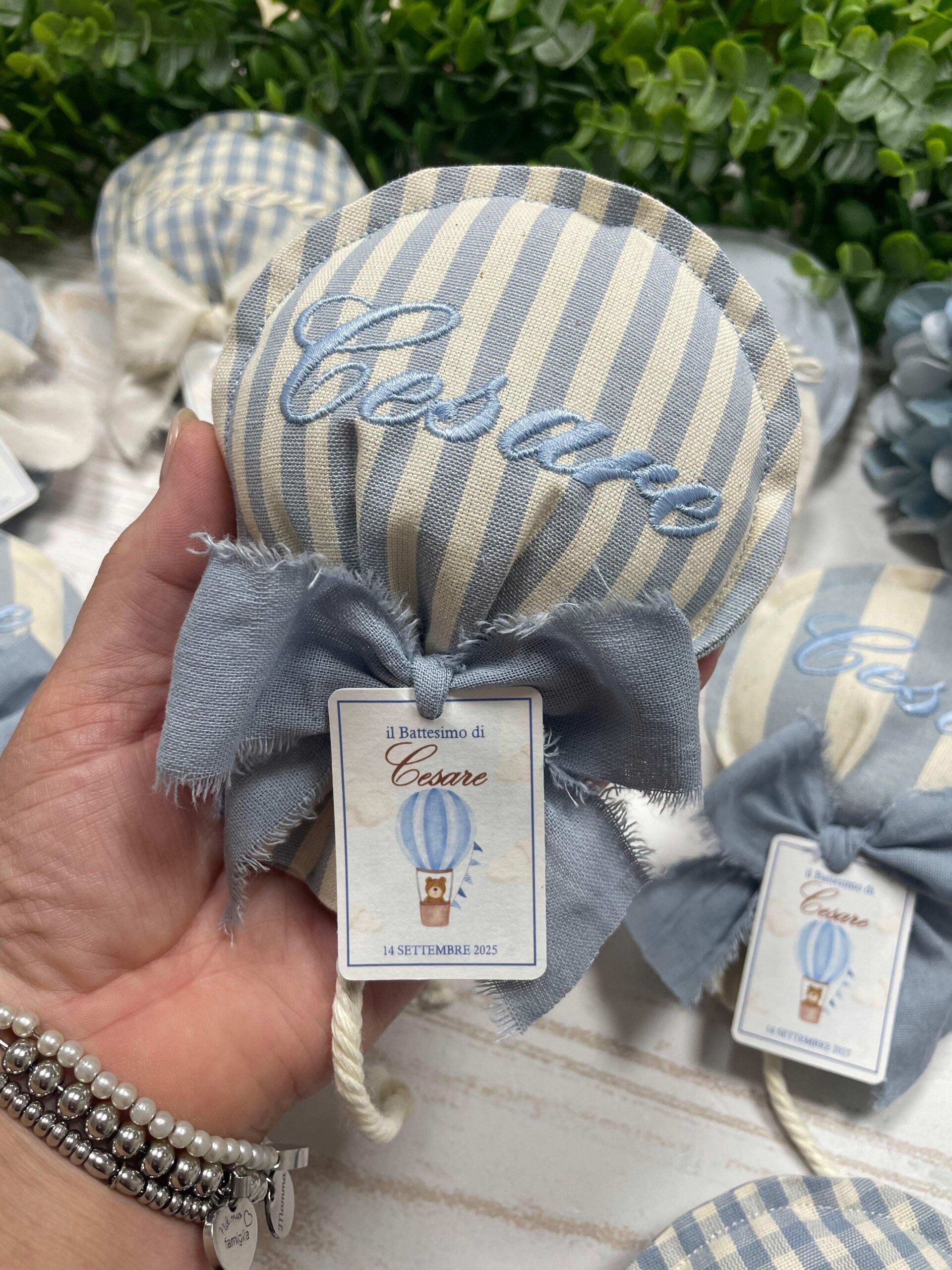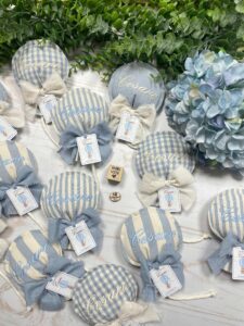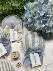 La particolare forma a palloncino nei delicati toni del nuvola, e il ricamo personalizzato con il nome del bimbo lo rendono un dono unico e speciale.