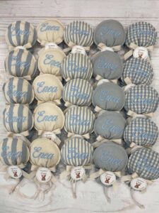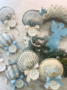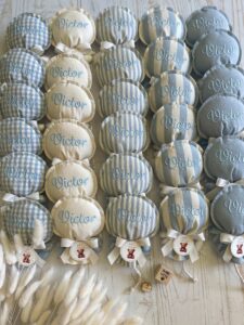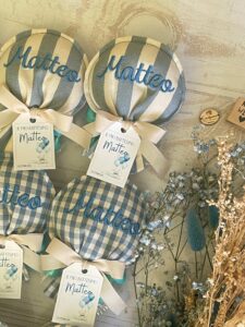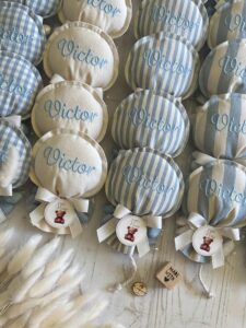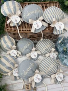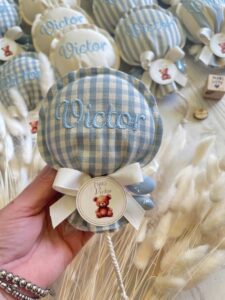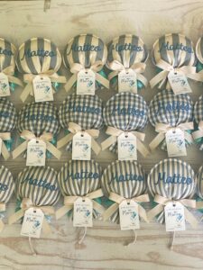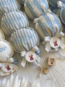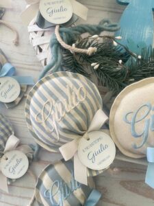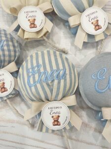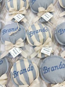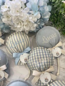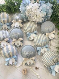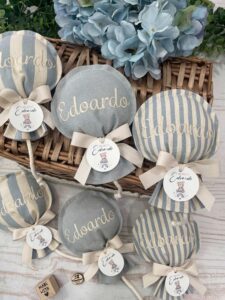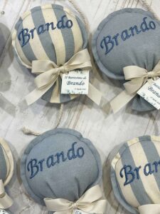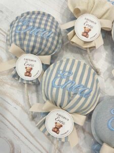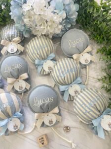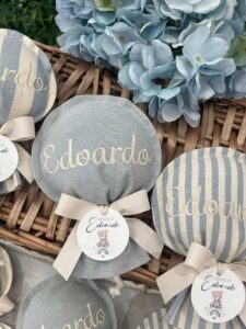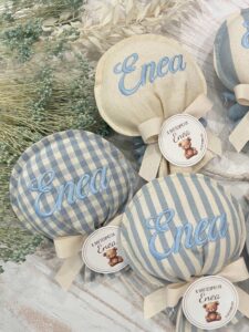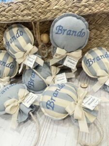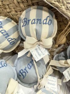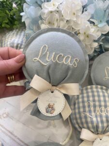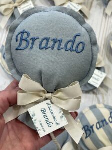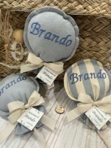 La particolare forma a palloncino e il ricamo personalizzato con il nome del bimbo lo rendono un dono unico e speciale.
