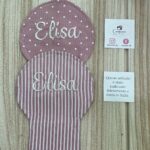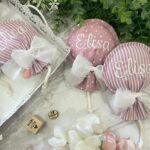 Cucito in cotone rigatino nelle delicate sfumature del rosa antico, disponibile in fantasie assortite (o a scelta), è impreziosito dal ricamo personalizzato del nome del bimbo/a, per una bomboniera unica e speciale.