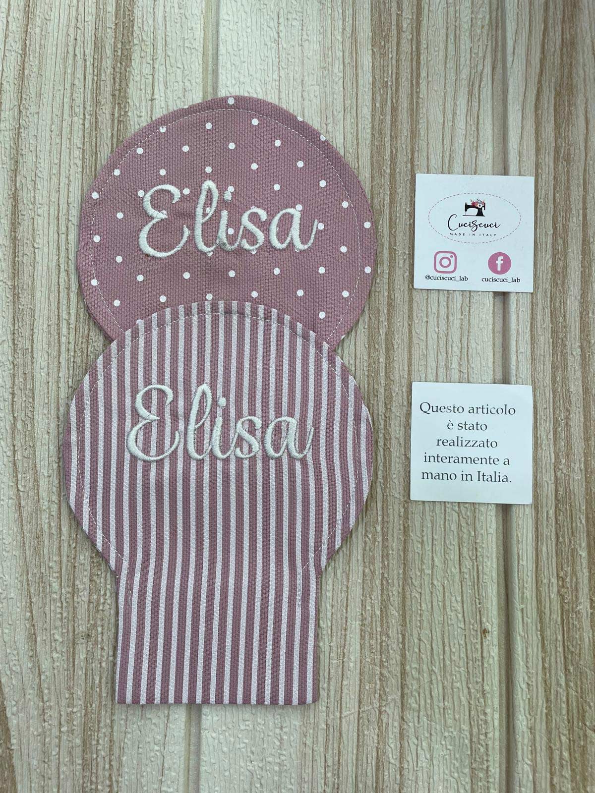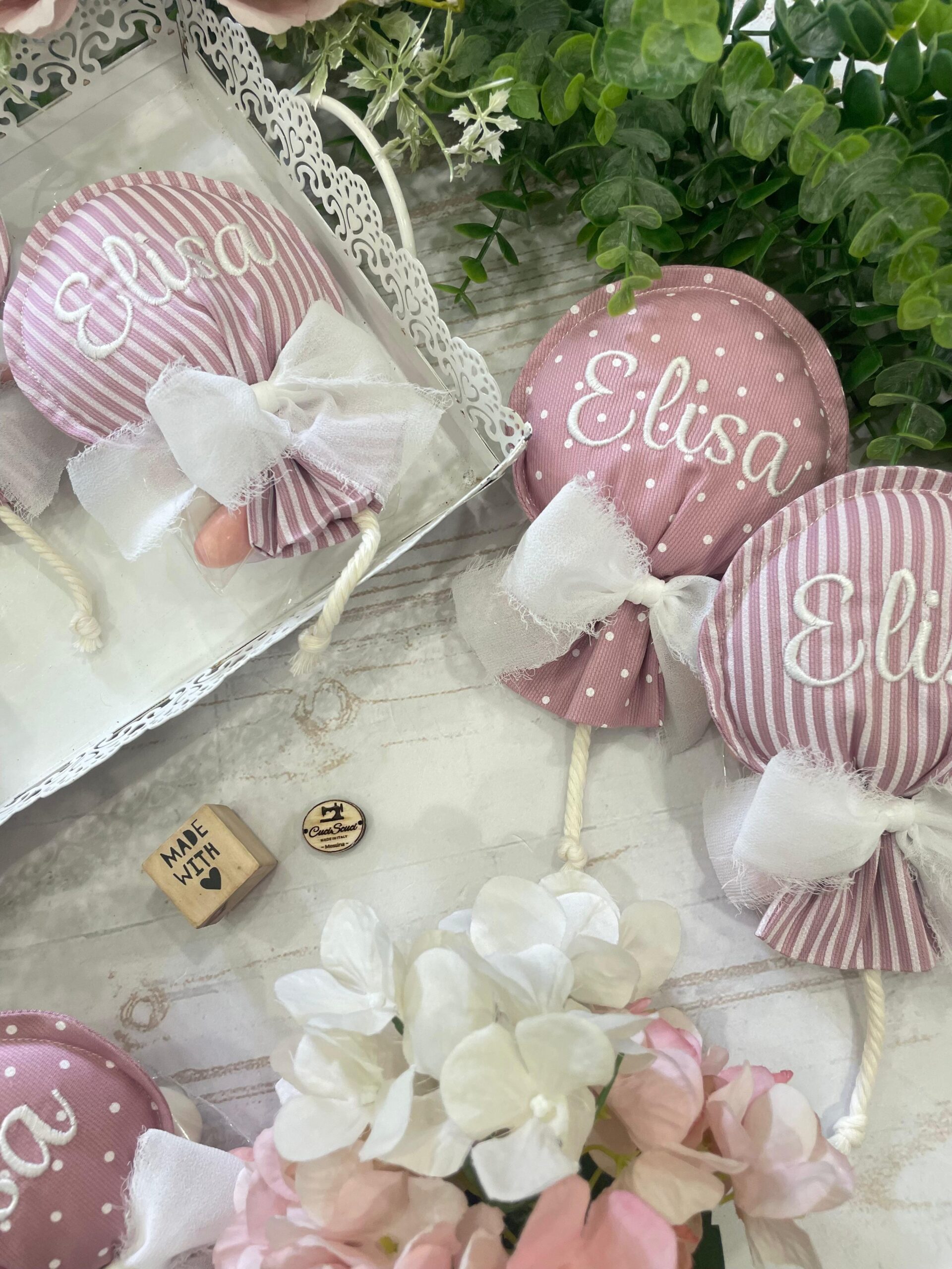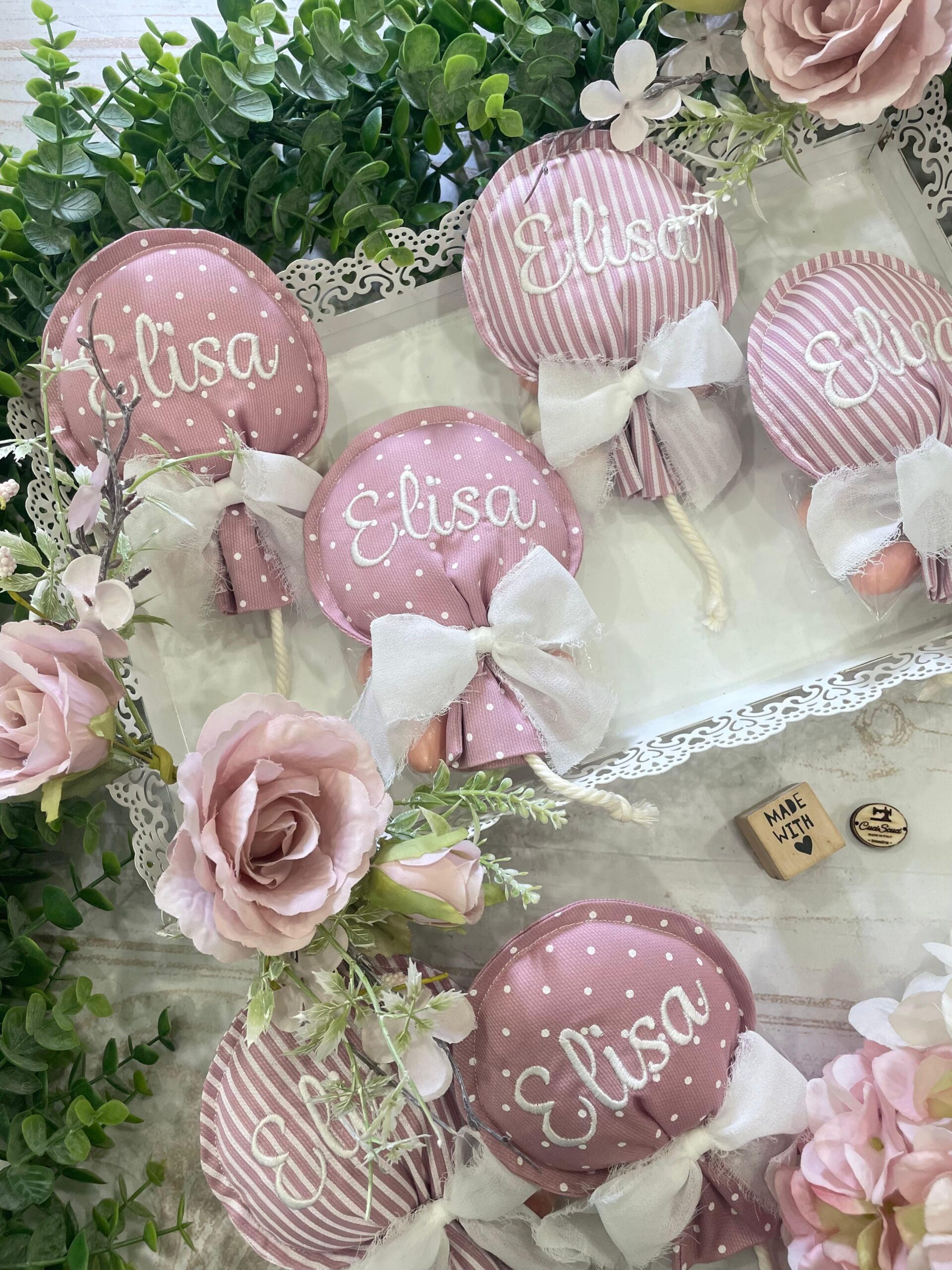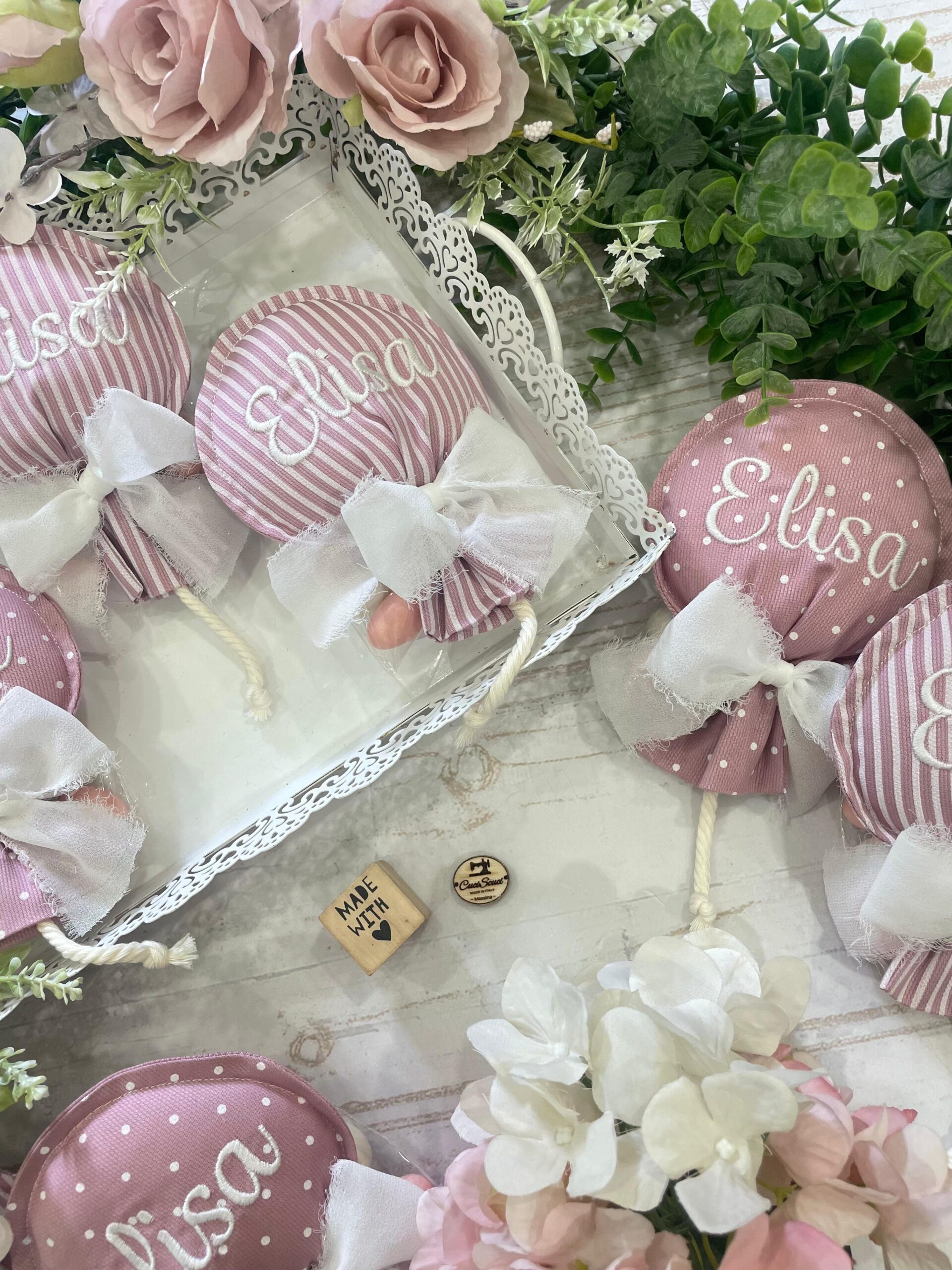 Cucito in cotone rigatino nelle delicate sfumature del rosa antico, disponibile in fantasie assortite (o a scelta), è impreziosito dal ricamo personalizzato del nome del bimbo/a, per una bomboniera unica e speciale.