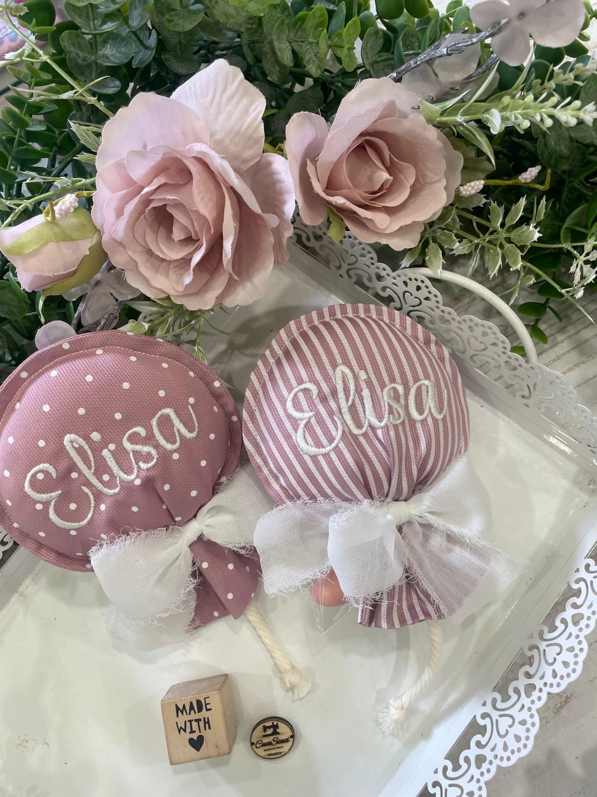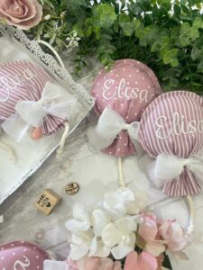 ✨ Sacchetto Artigianale Palloncino in Cotone Rigatino Rosa Antico con Nome Ricamato ✨