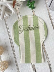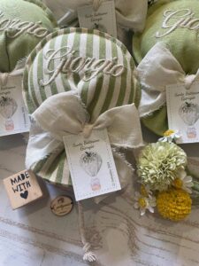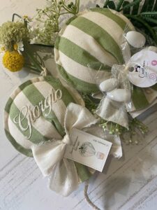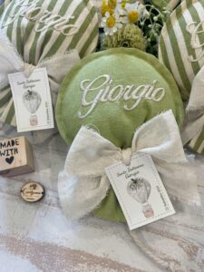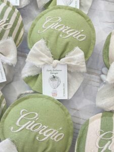 Confezionato in cotone tinto filo nei vivaci toni del verde kiwi, è impreziosito dal ricamo personalizzato del nome del bimbo/a, rendendo ogni bomboniera unica e speciale.