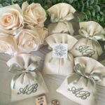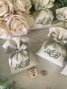 Il sacchetto, confezionato in cotone panama color panna, è impreziosito dal ricamo di due iniziali, simbolo di unicità e raffinatezza.