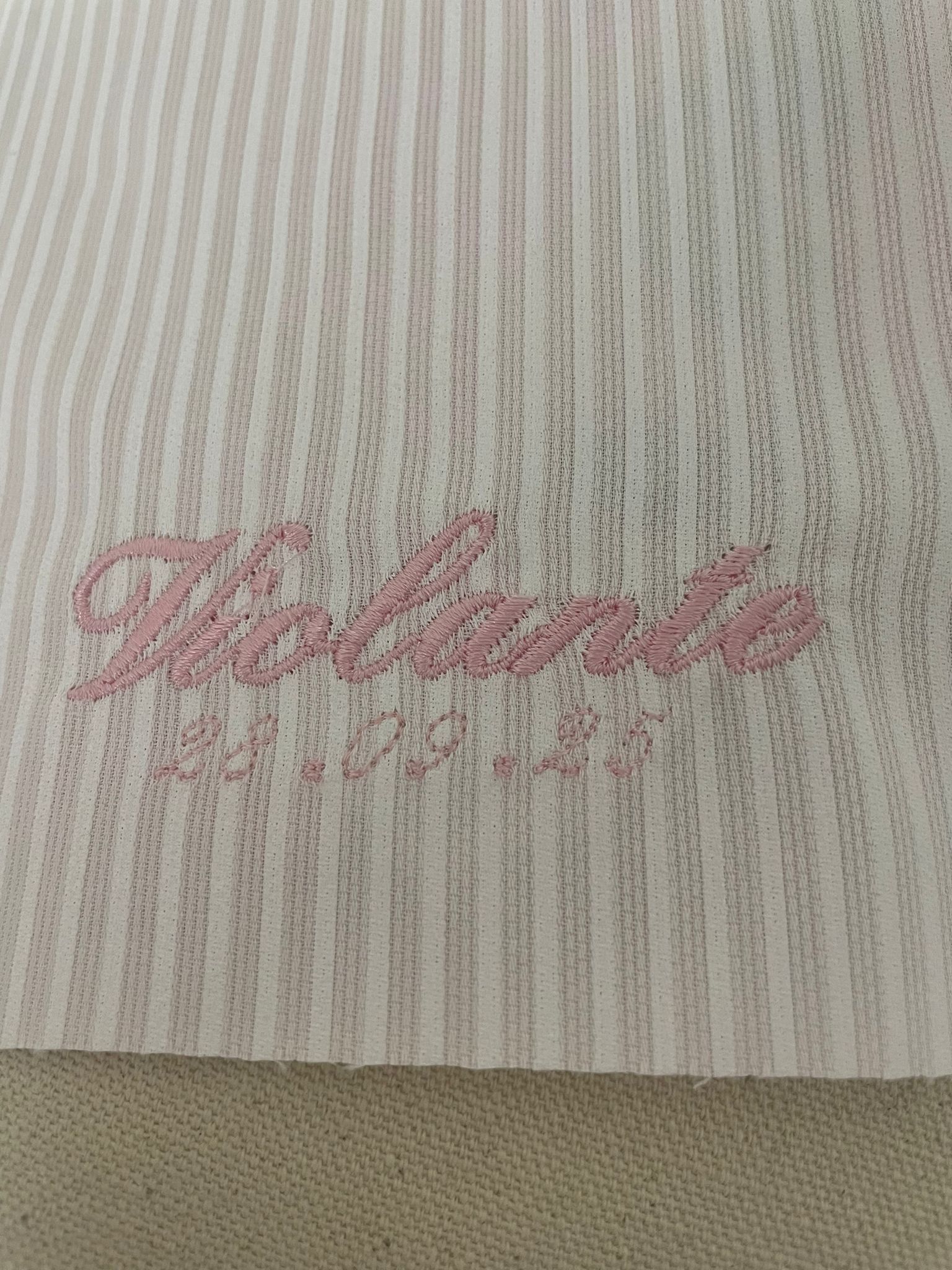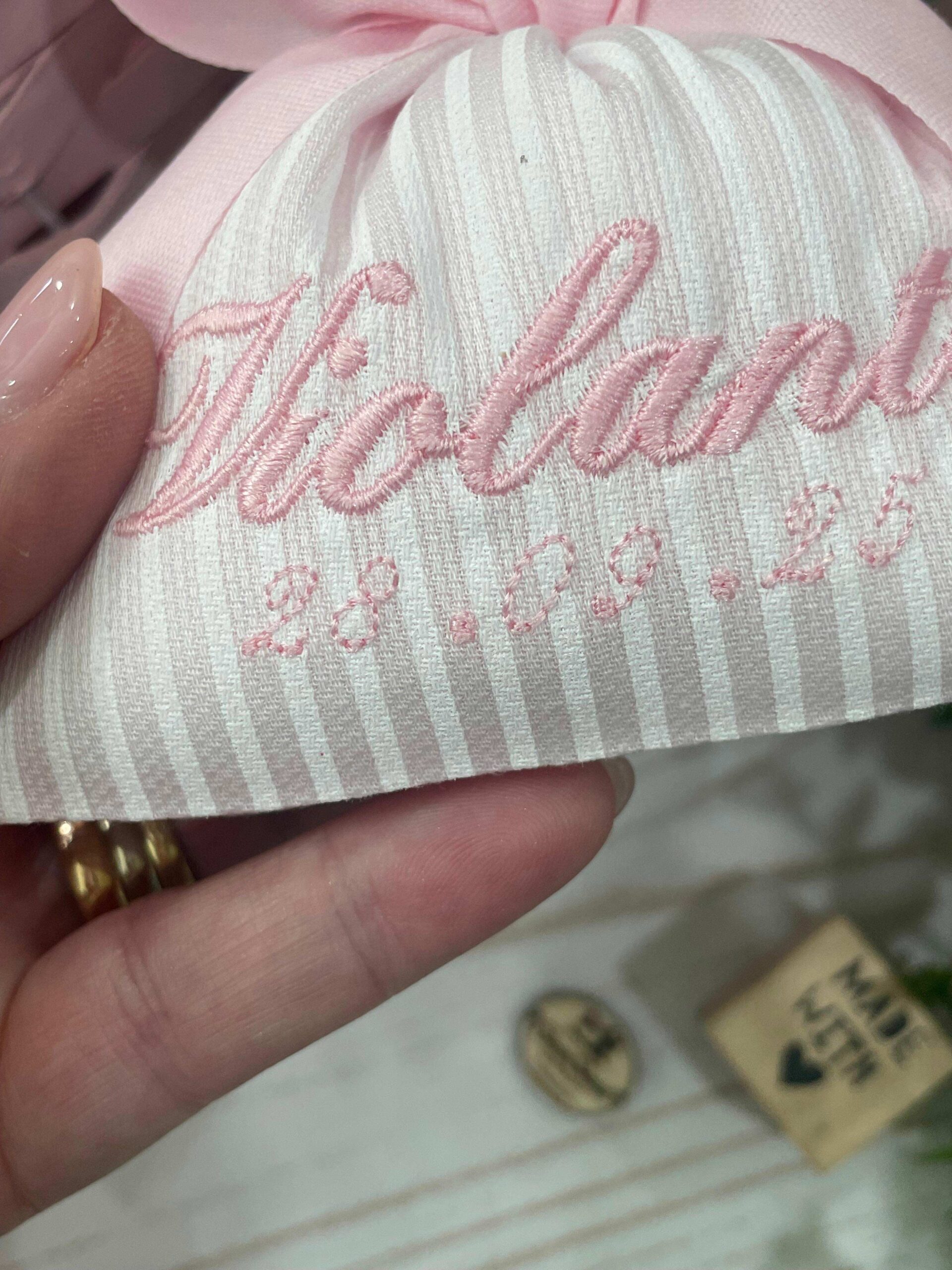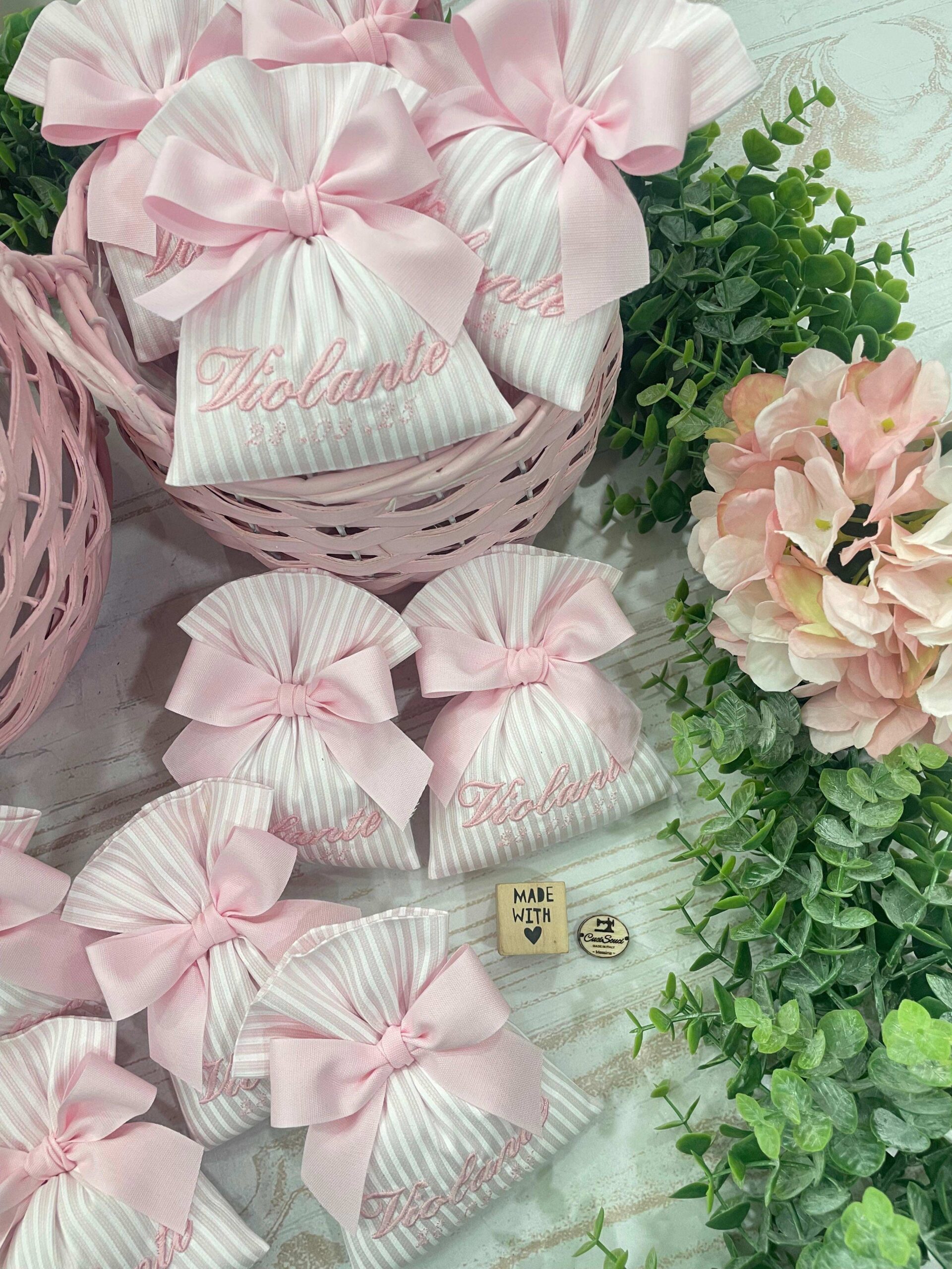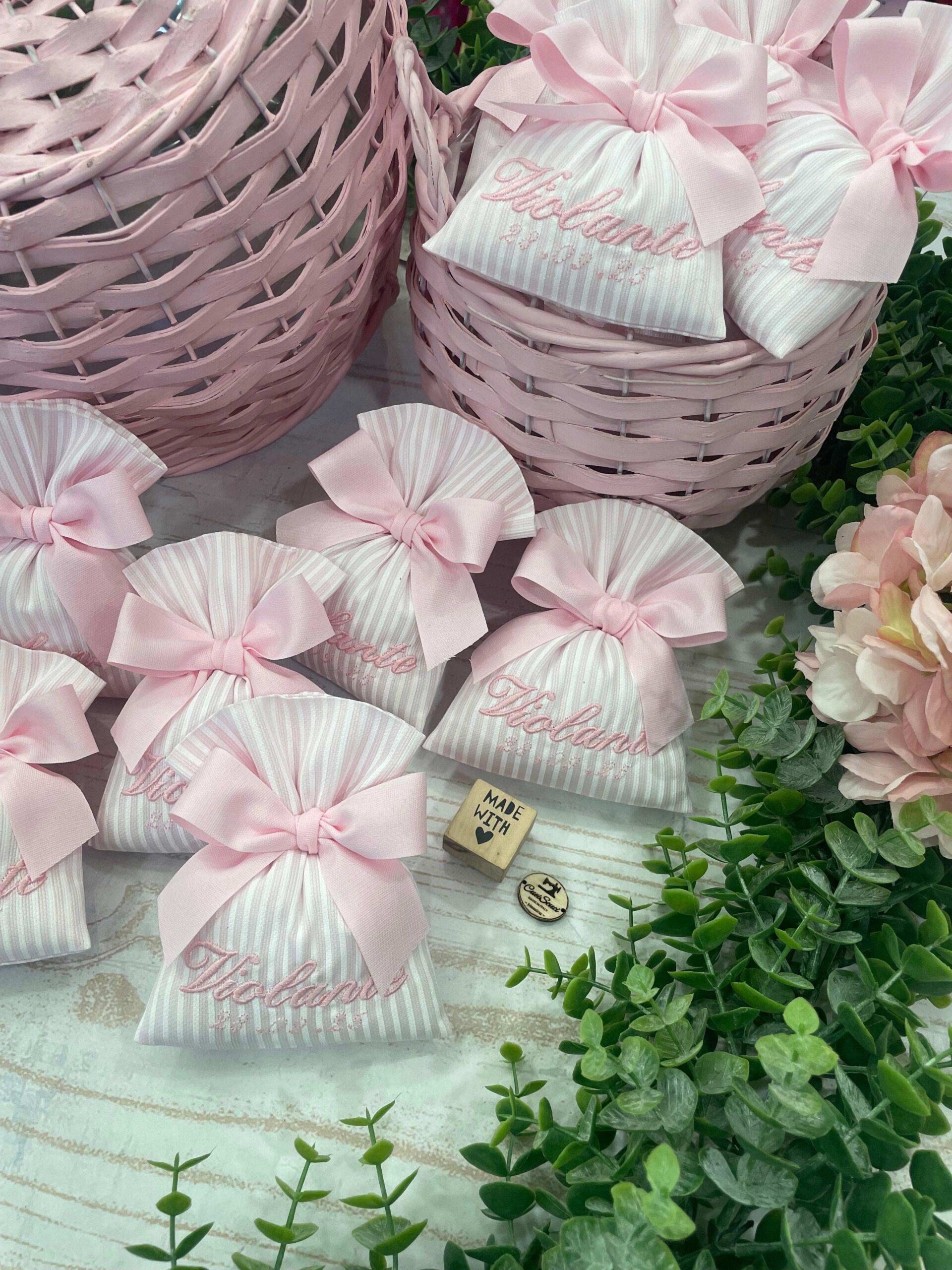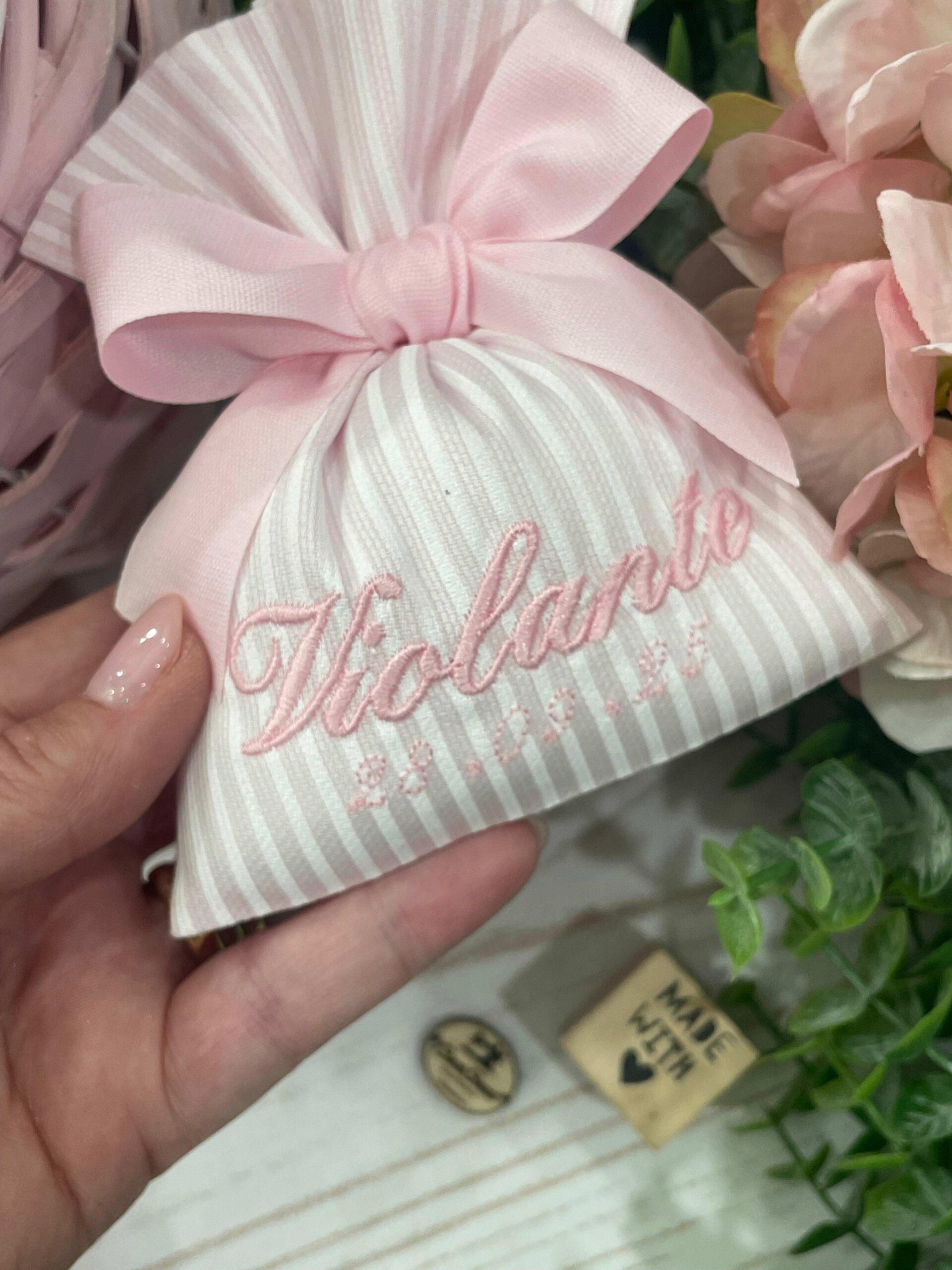 Sacchetto Sartoriale Rigatino Rosa con Ricamo Nome e Data Evento