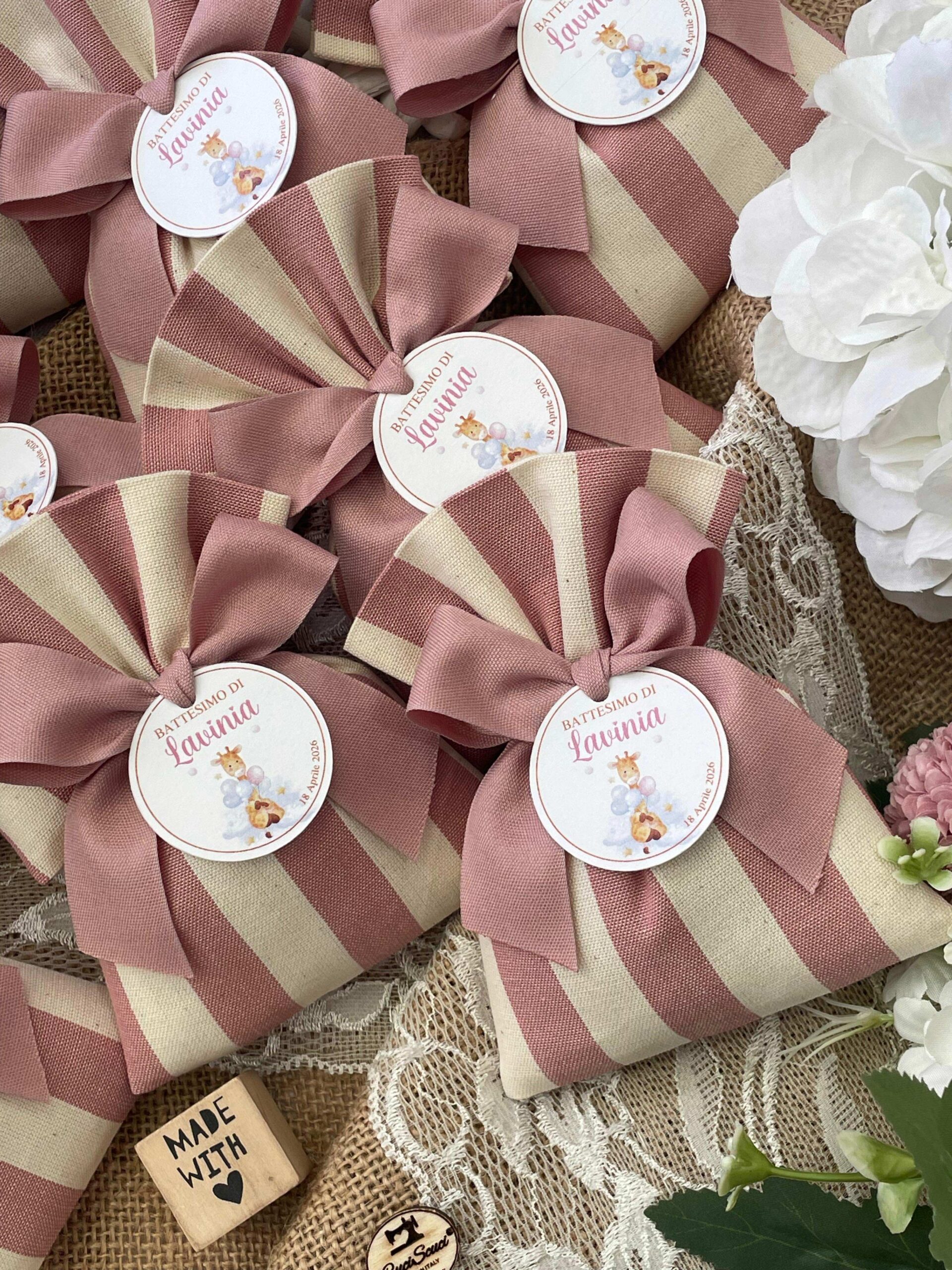 • Confezionato – bomboniera pronta da donare, con fiocco coordinato, imbottitura in ovatta e 5 confetti in busta sigillata