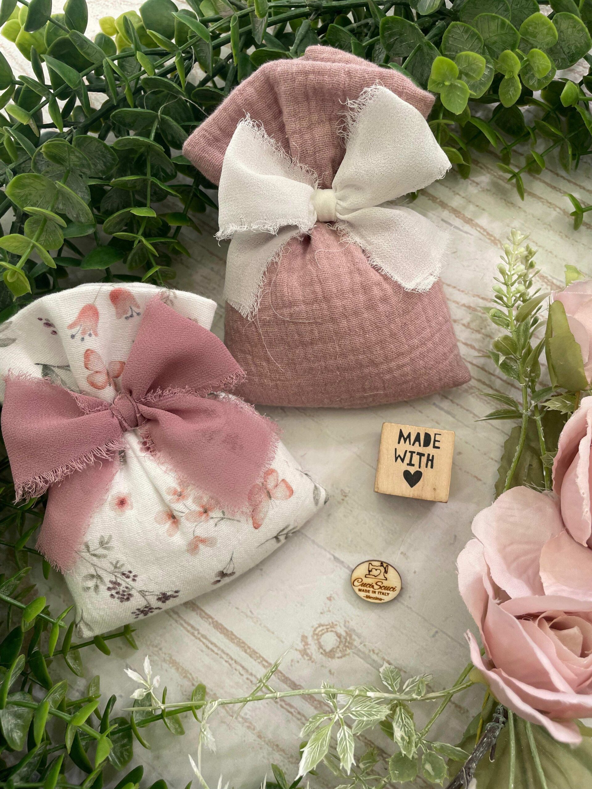 La mussola di cotone, leggera e morbida al tatto, è proposta in due raffinate varianti: tinta unita rosa antico e bianco con fantasia floreale, per una bomboniera dal gusto romantico ed elegante, capace di adattarsi armoniosamente a diversi stili di evento.