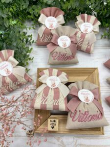 Questo sacchetto in cotone tinto filo è disponibile in fantasie assortite (o a scelta) nei delicati toni del rosa antico e del mandorla, ed è impreziosito dal ricamo personalizzato del nome, per rendere unico ogni dono.