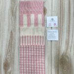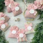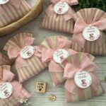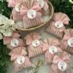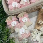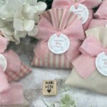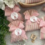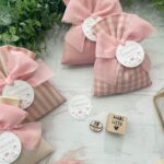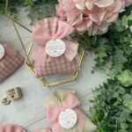 Confezionato in cotone tinto filo, disponibile in fantasie assortite o a scelta, nei delicati toni del rosa baby e del panna, questo sacchetto incarna dolcezza e raffinatezza, perfetto per le occasioni più speciali.