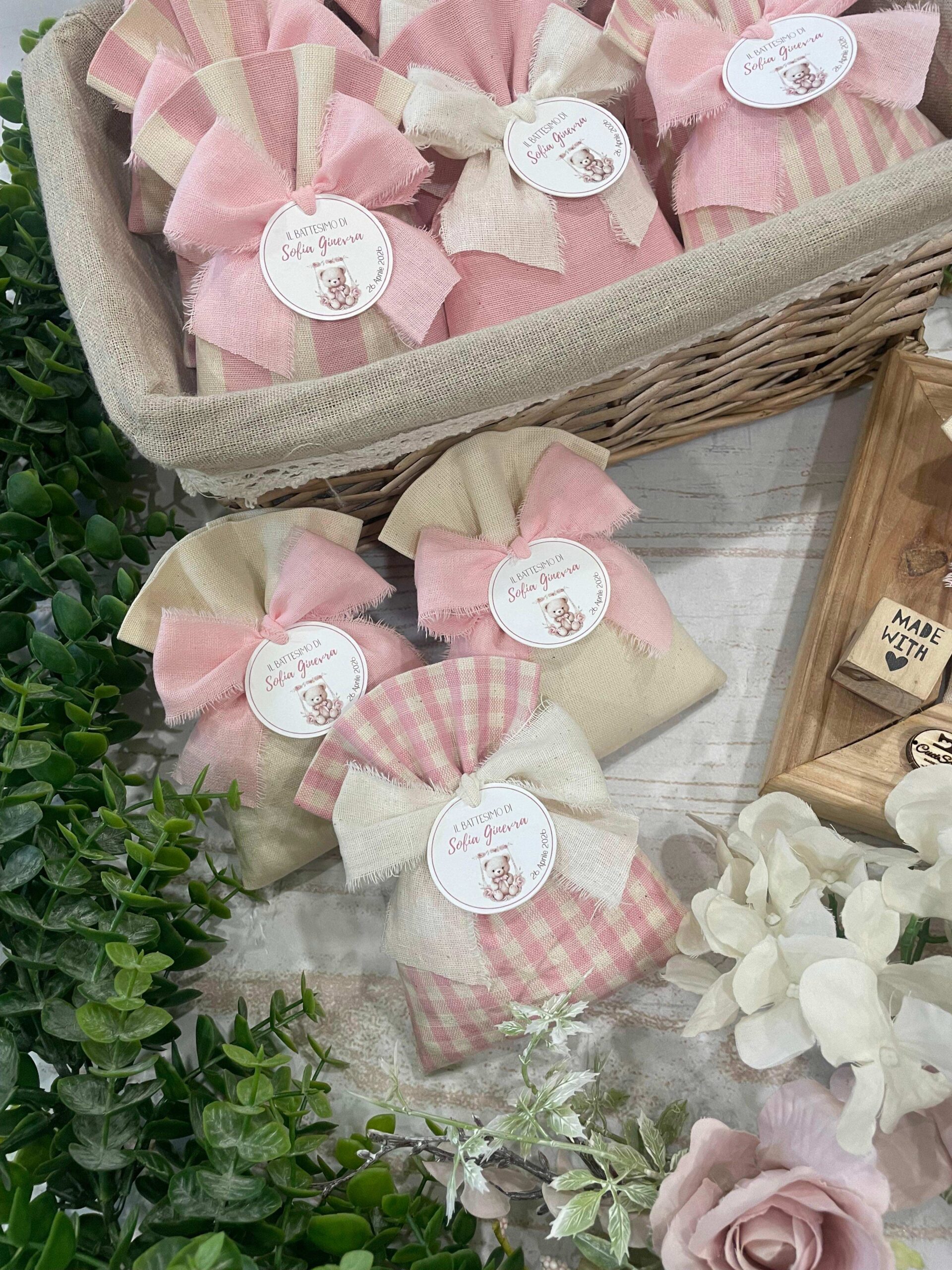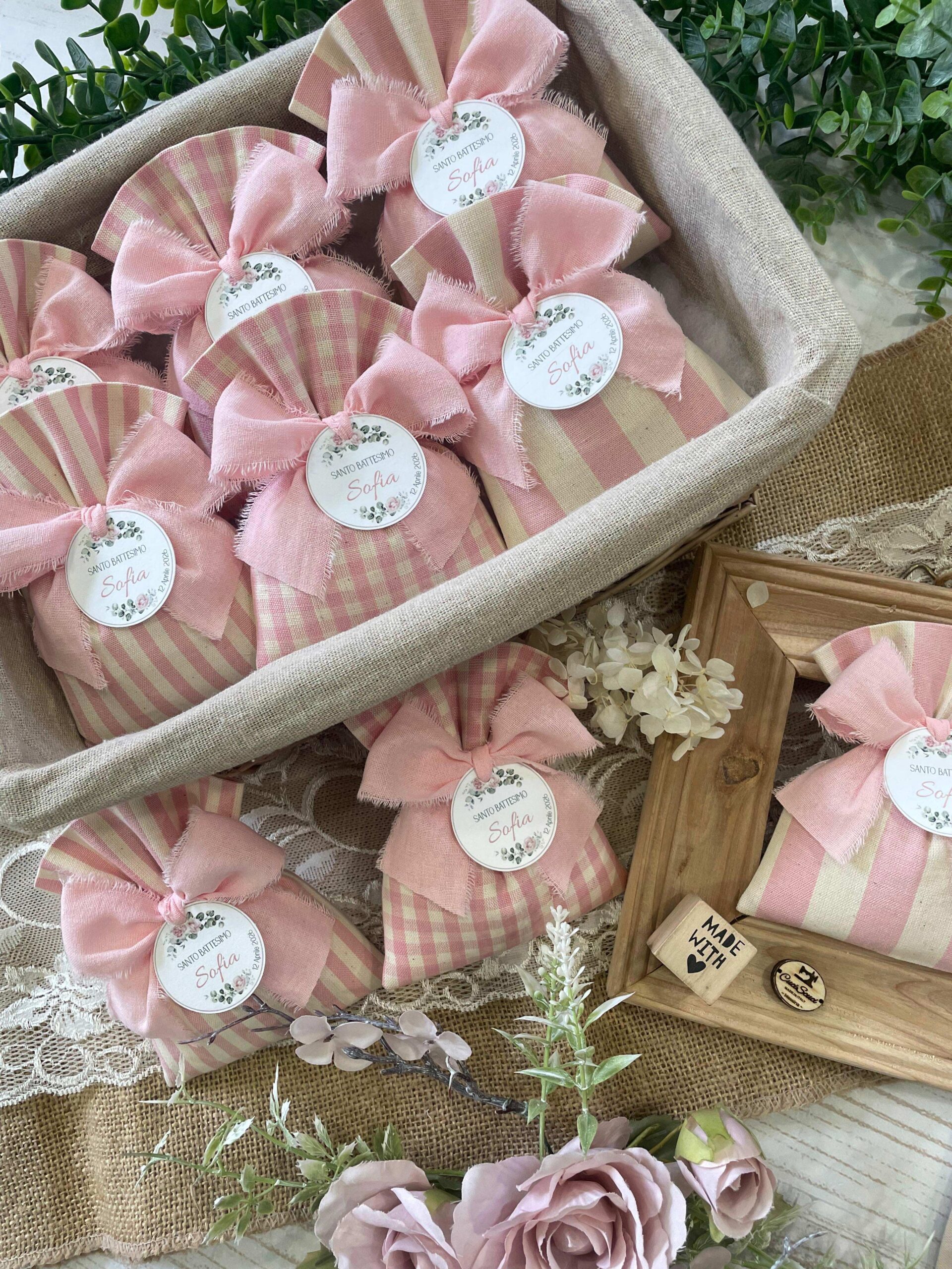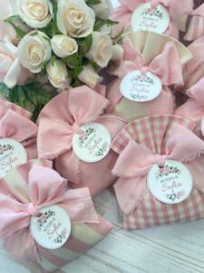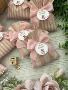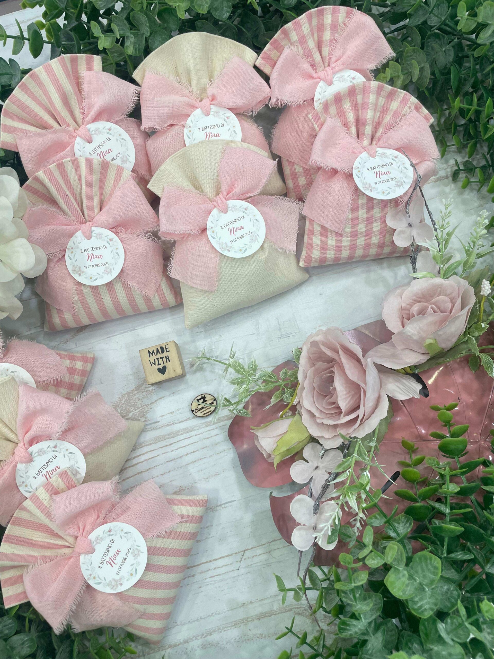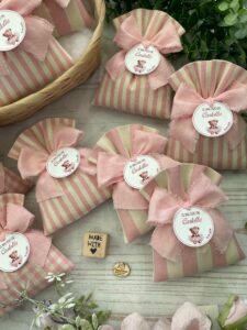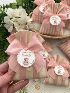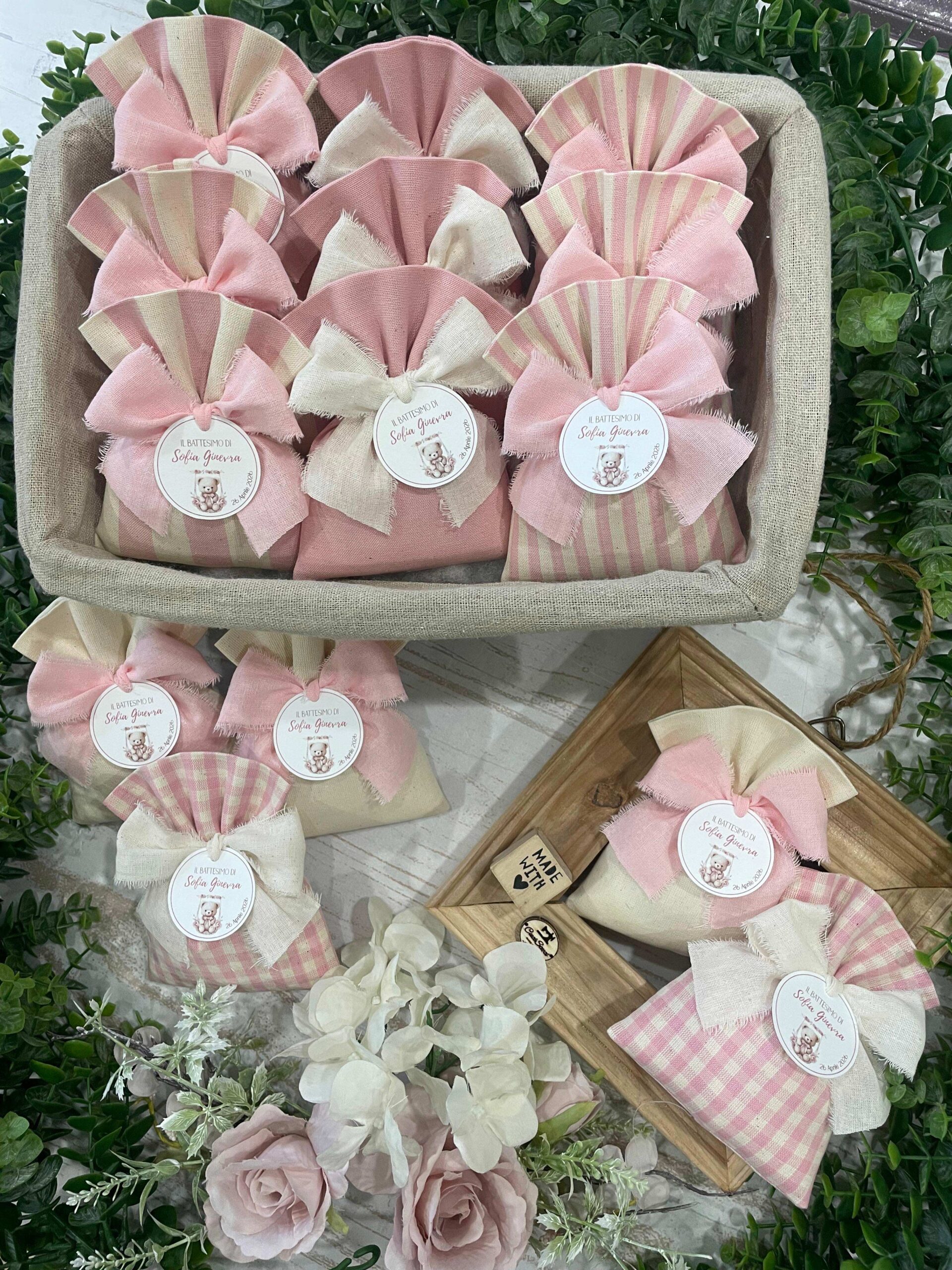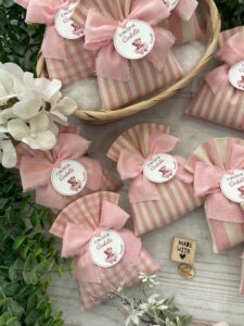Confezionato in cotone tinto filo, disponibile in fantasie assortite o a scelta, nei delicati toni del rosa baby e del panna, questo sacchetto incarna dolcezza e raffinatezza, perfetto per le occasioni più speciali.