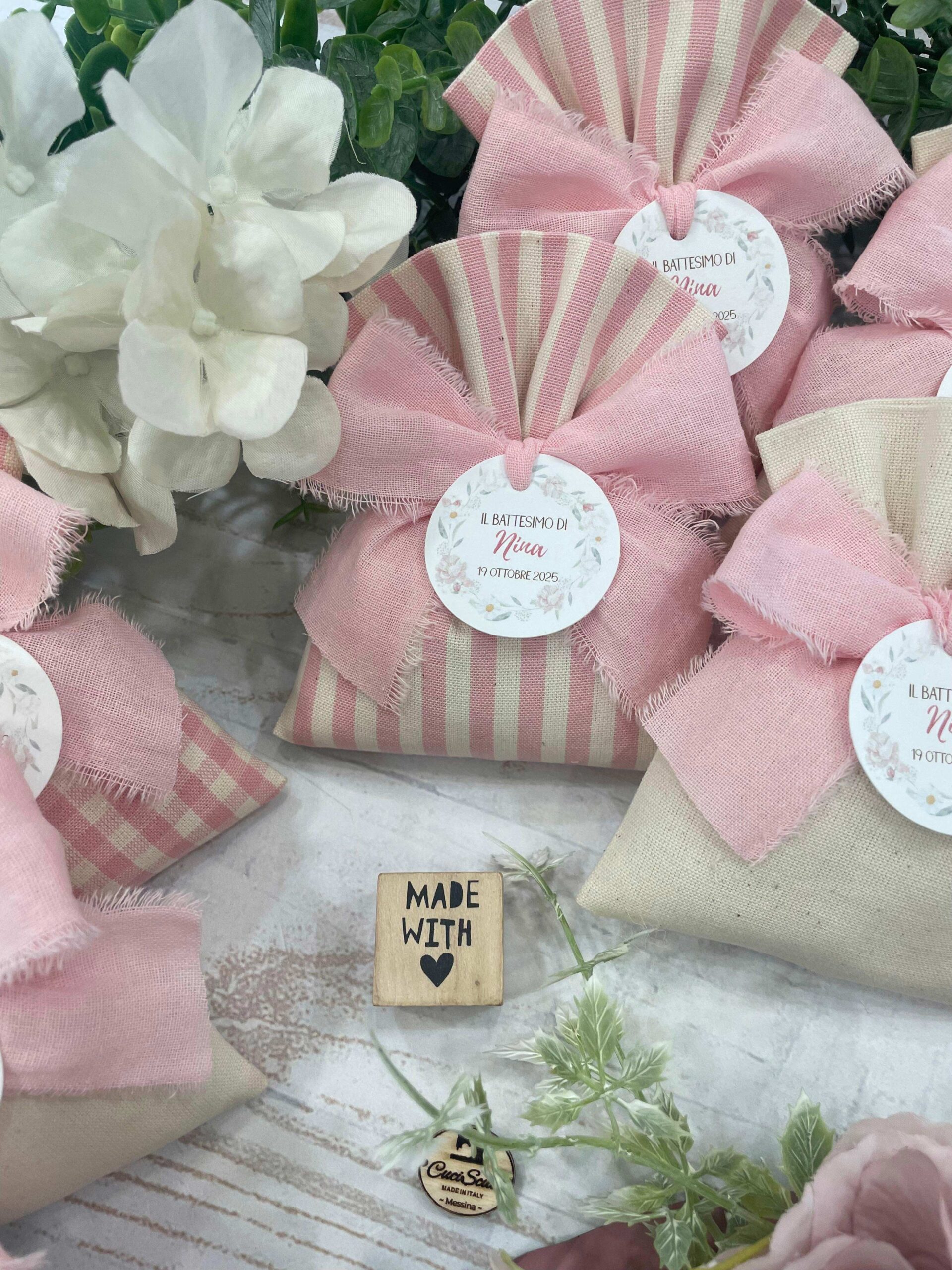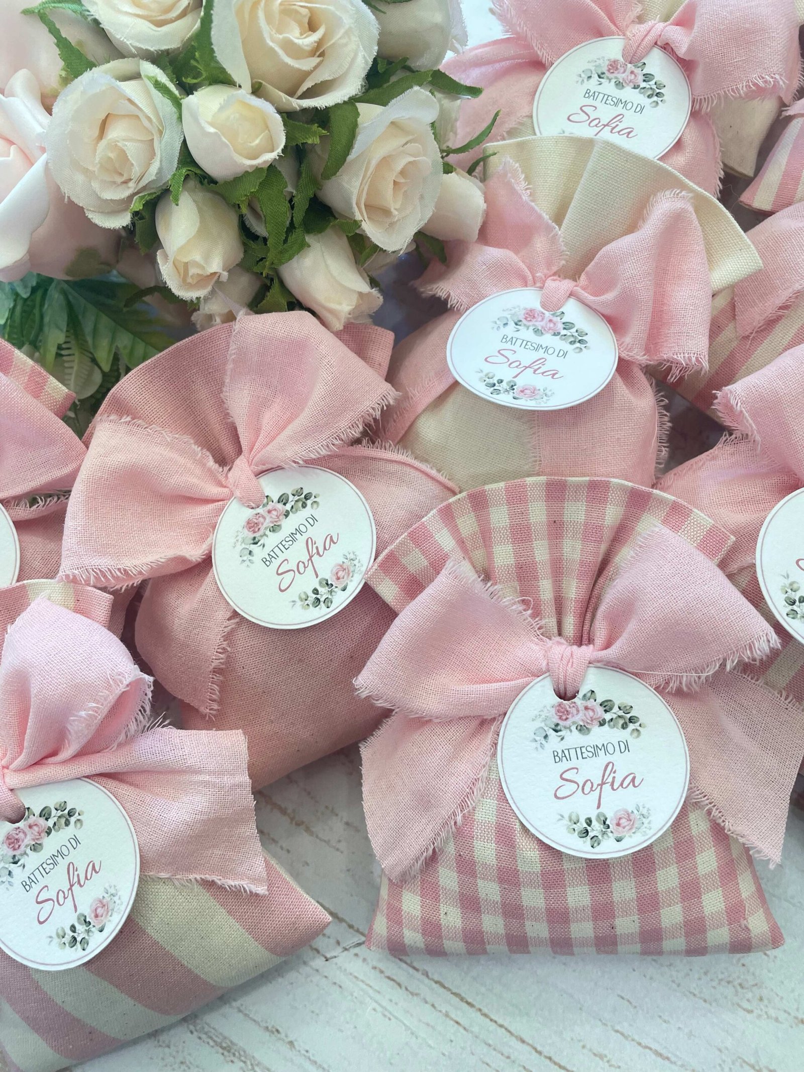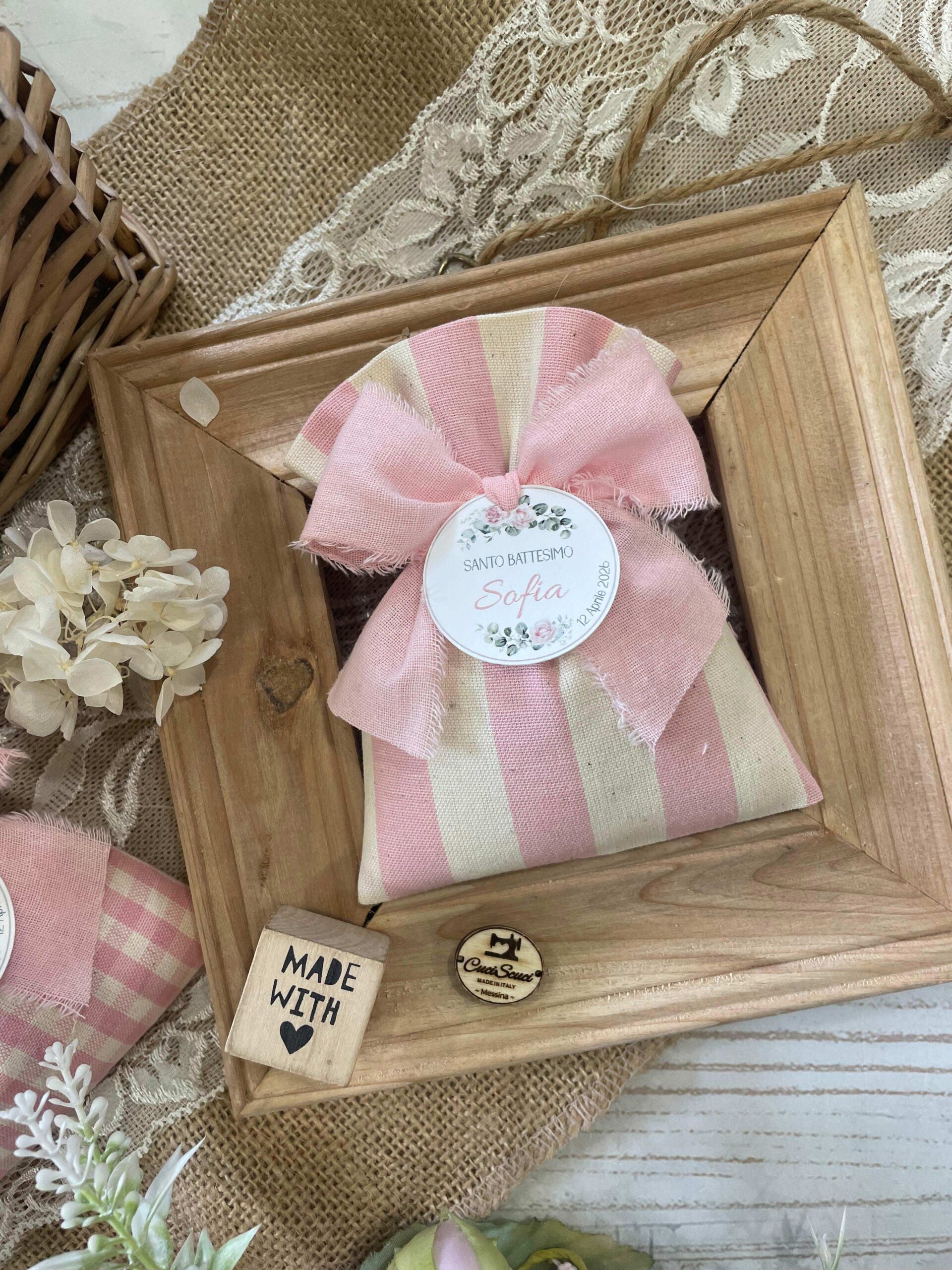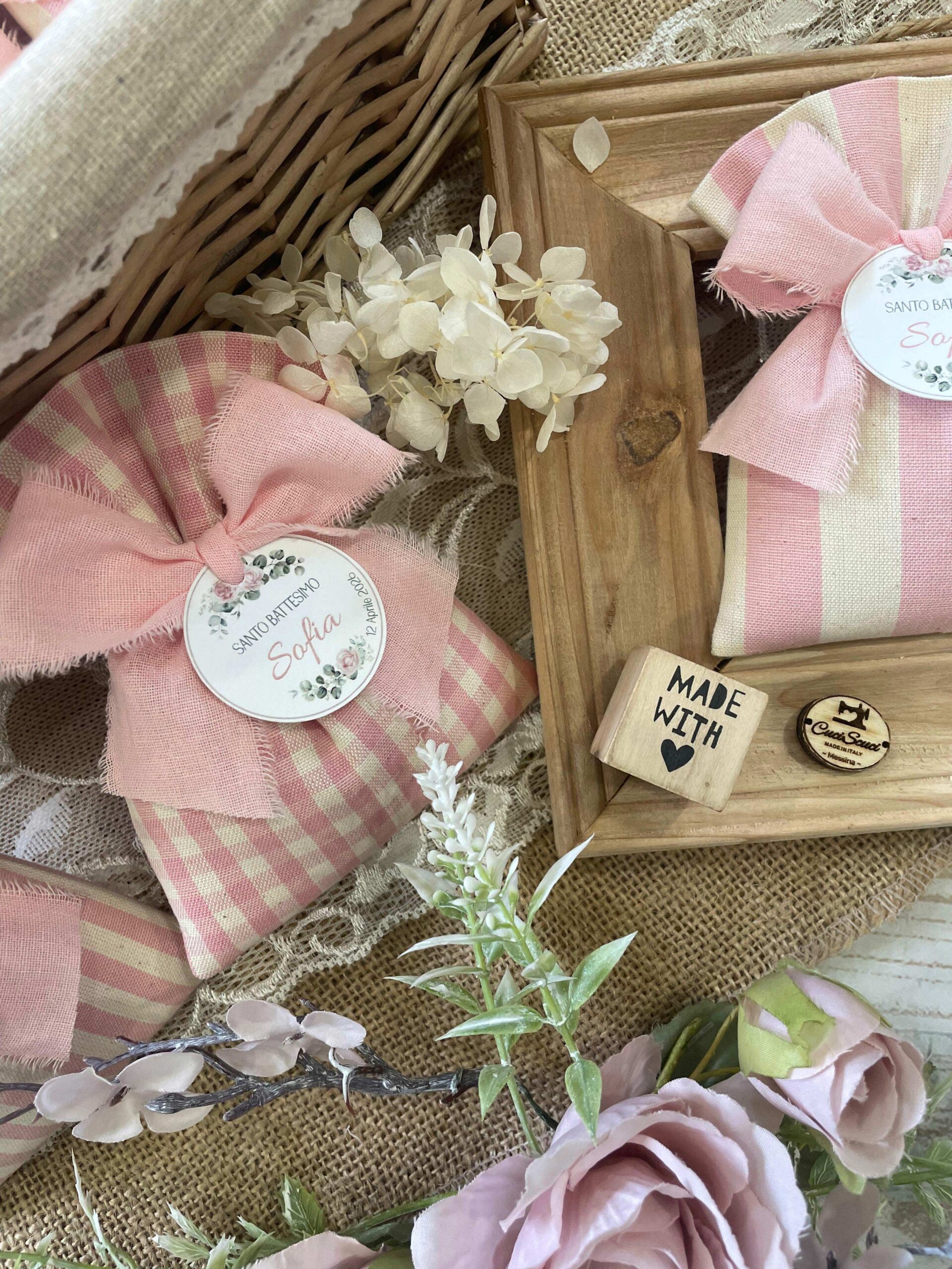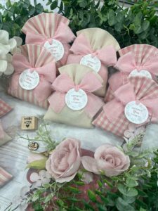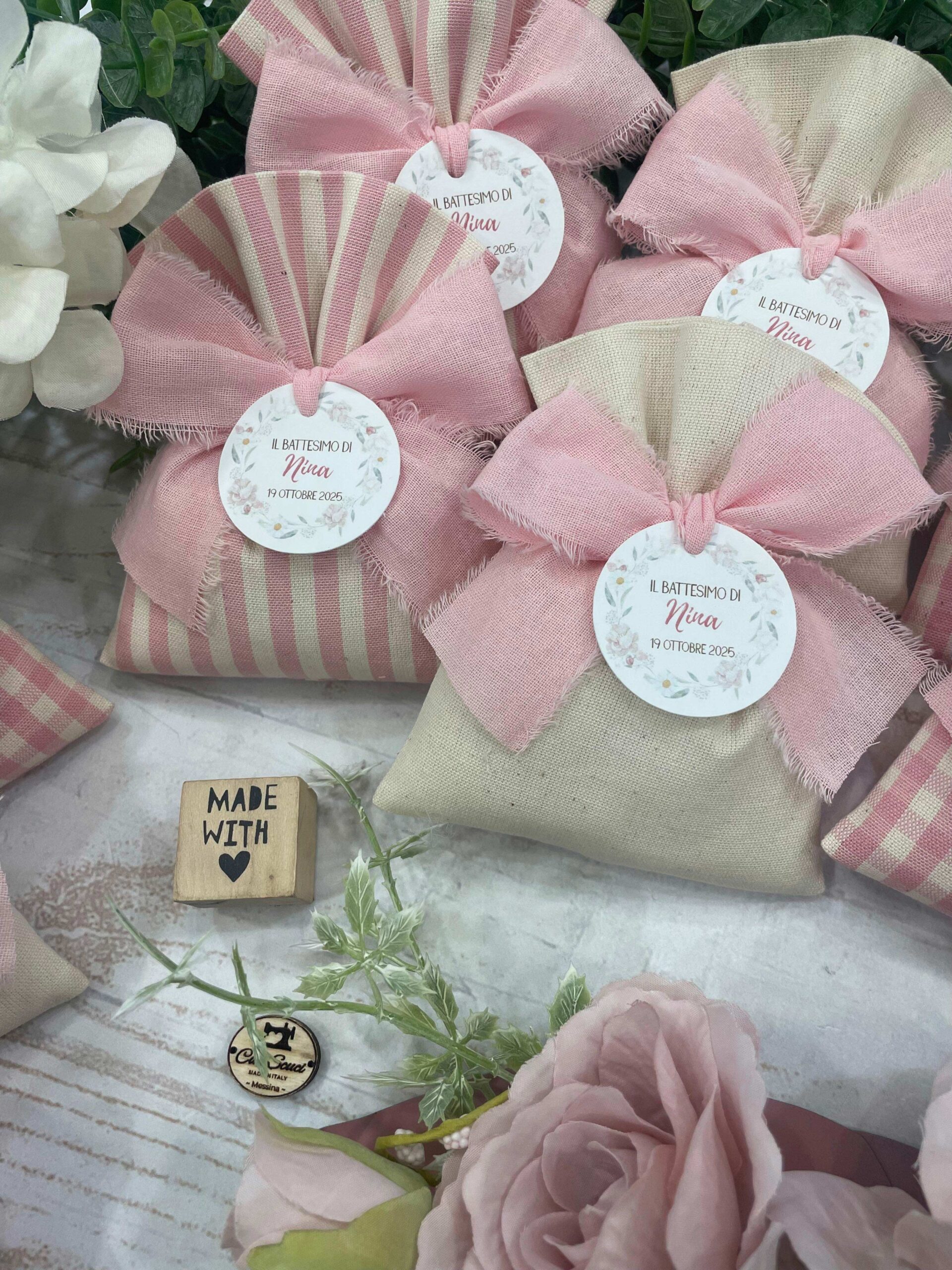 Confezionato in cotone tinto filo, disponibile in fantasie assortite o a scelta, nei delicati toni del rosa baby e del panna, questo sacchetto incarna dolcezza e raffinatezza, perfetto per le occasioni più speciali.