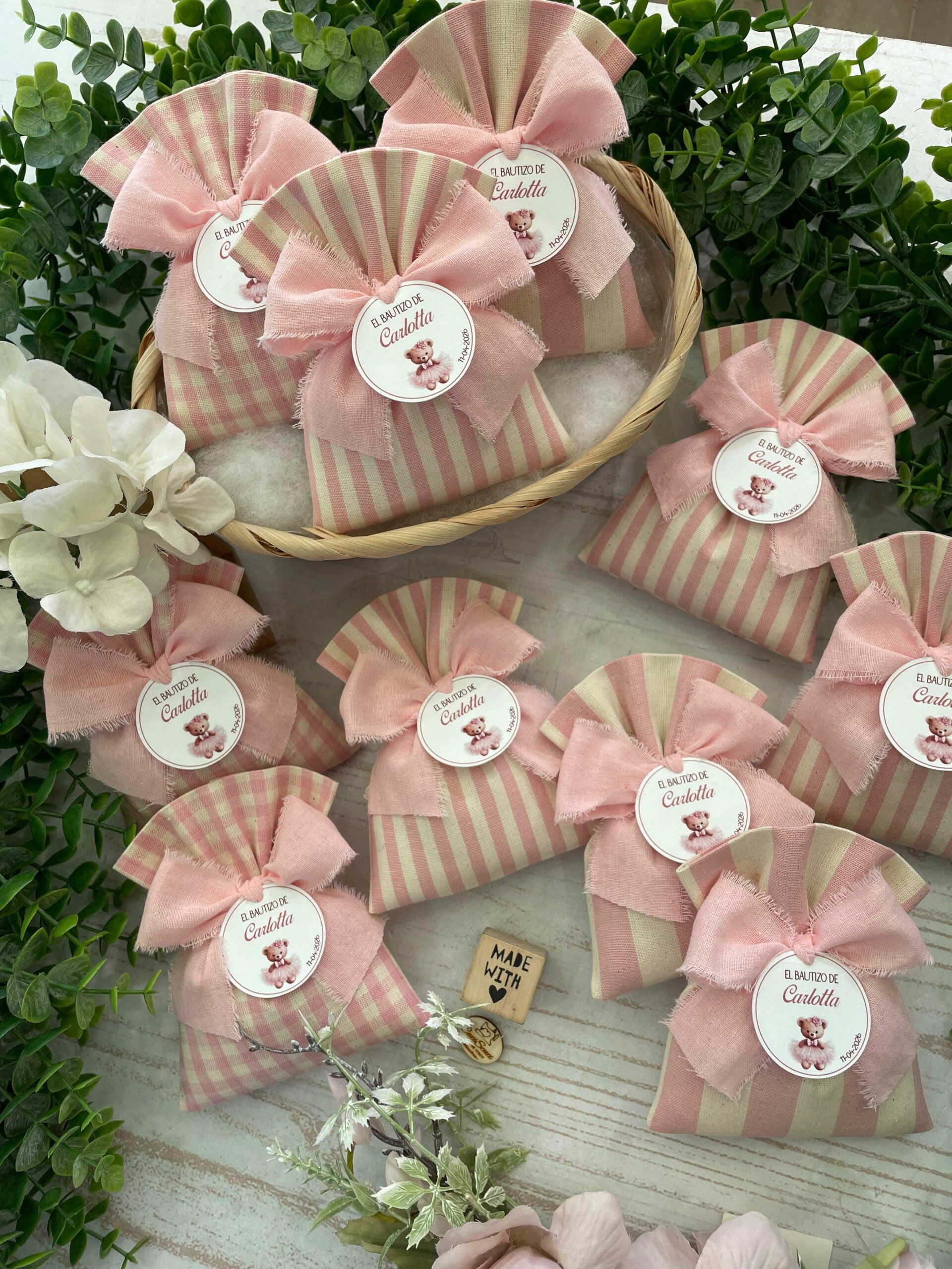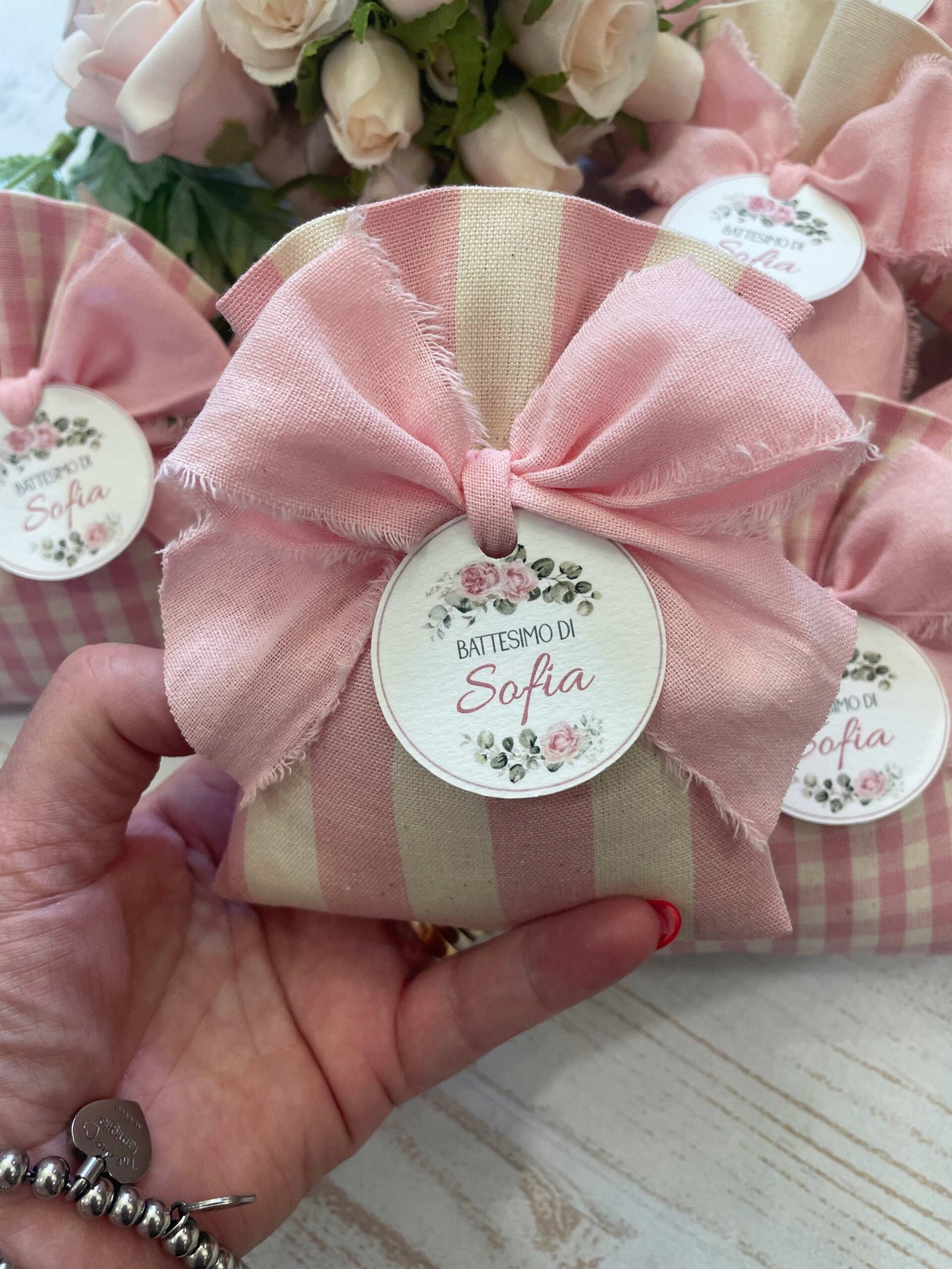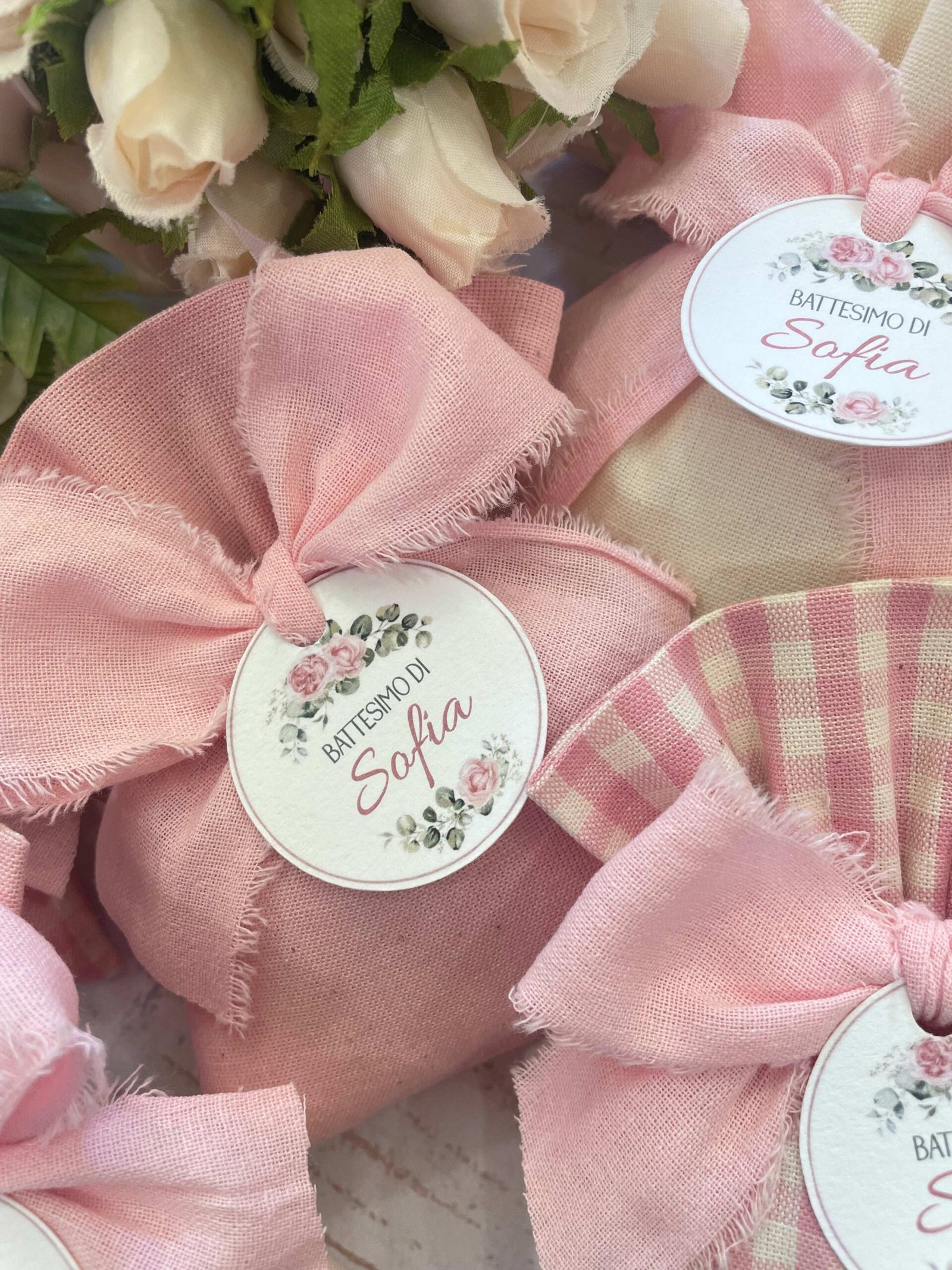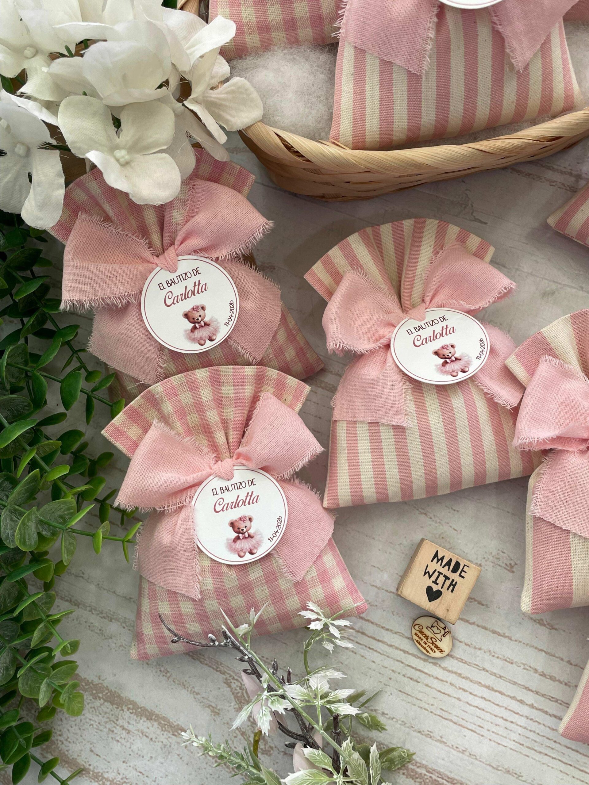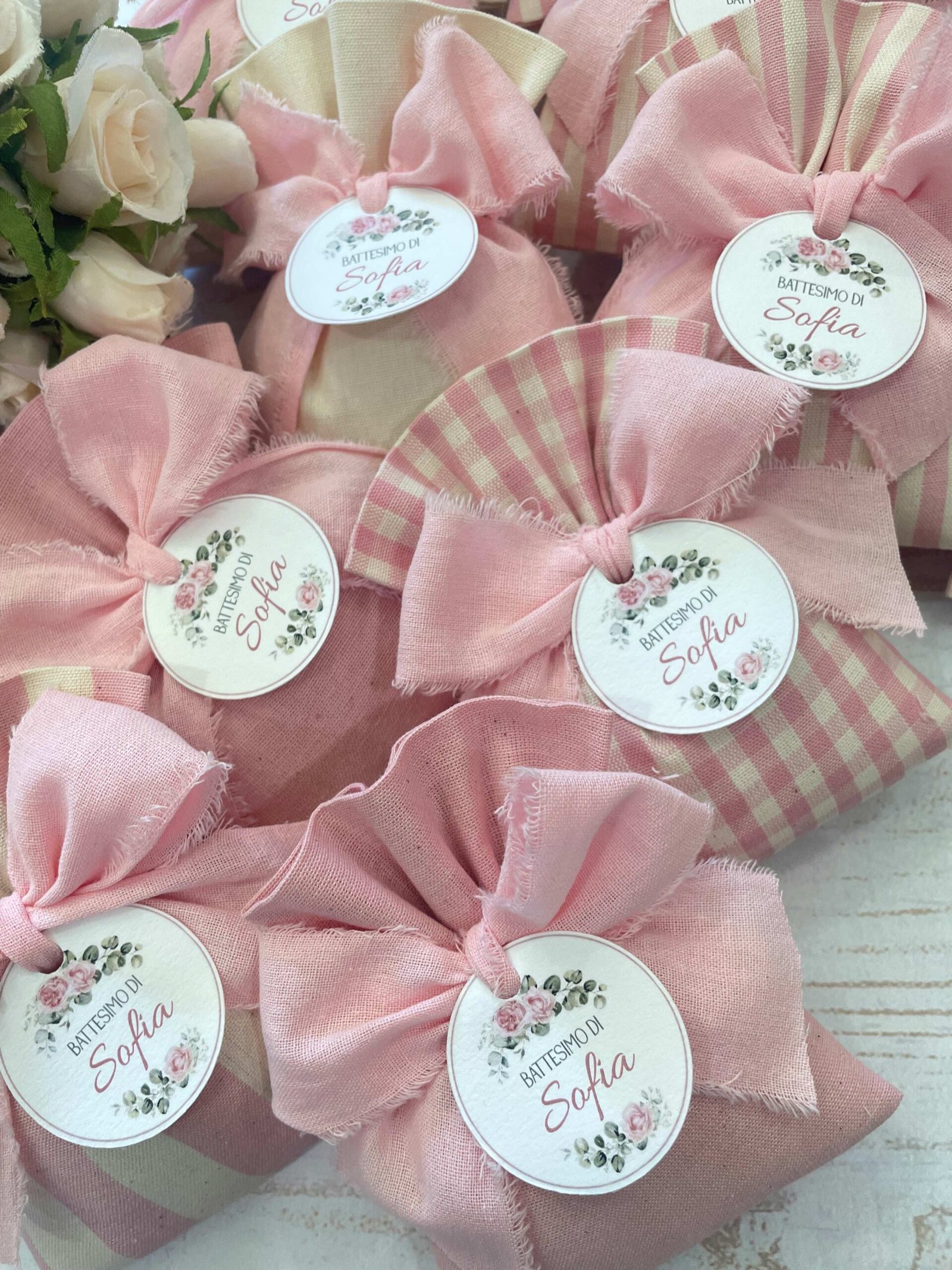 Confezionato in cotone tinto filo, disponibile in fantasie assortite o a scelta, nei delicati toni del rosa baby e del panna, questo sacchetto incarna dolcezza e raffinatezza, perfetto per le occasioni più speciali.