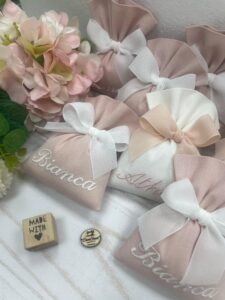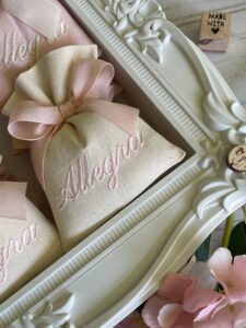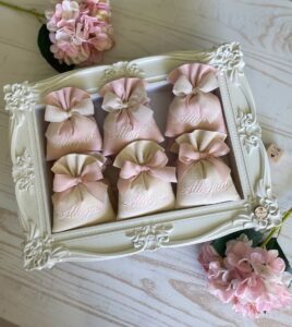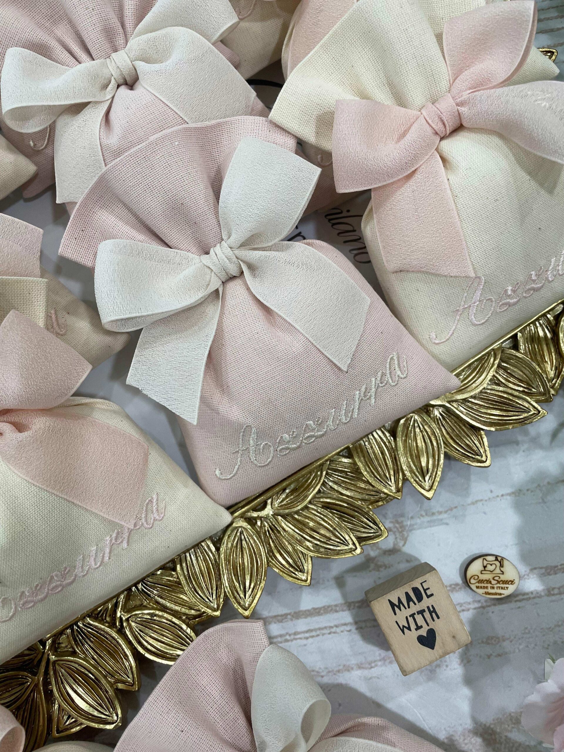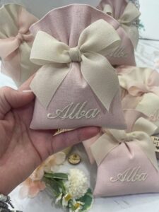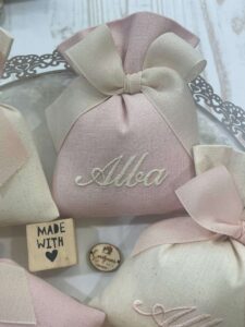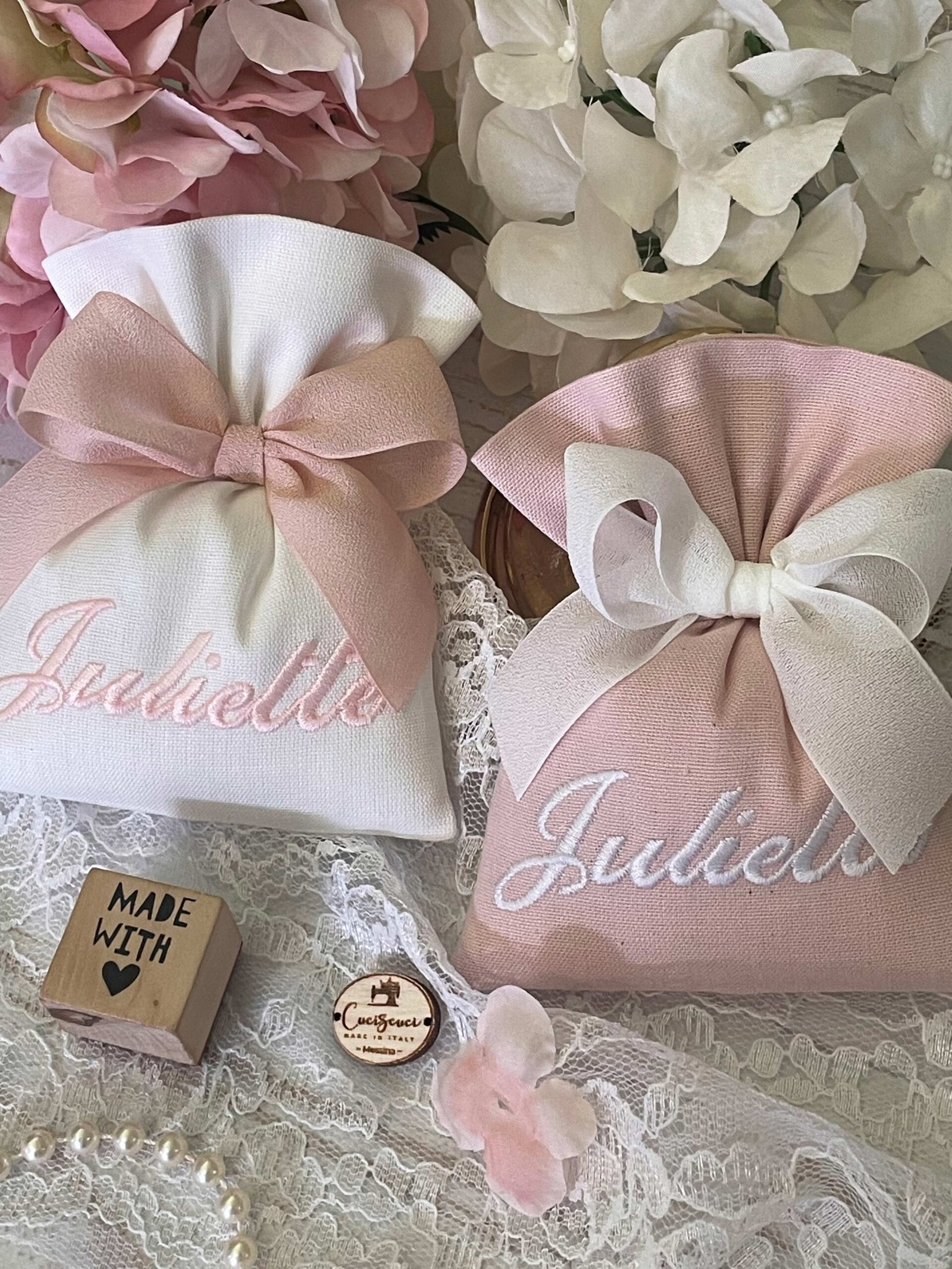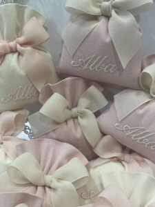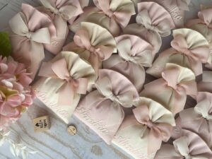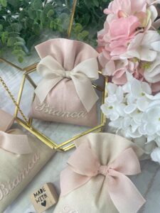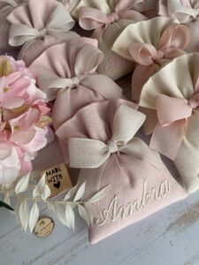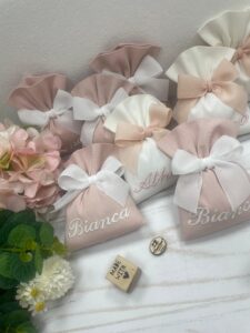 Un’elegante bomboniera artigianale, realizzata interamente a mano dalla nostra sartoria con cura e passione per i dettagli.