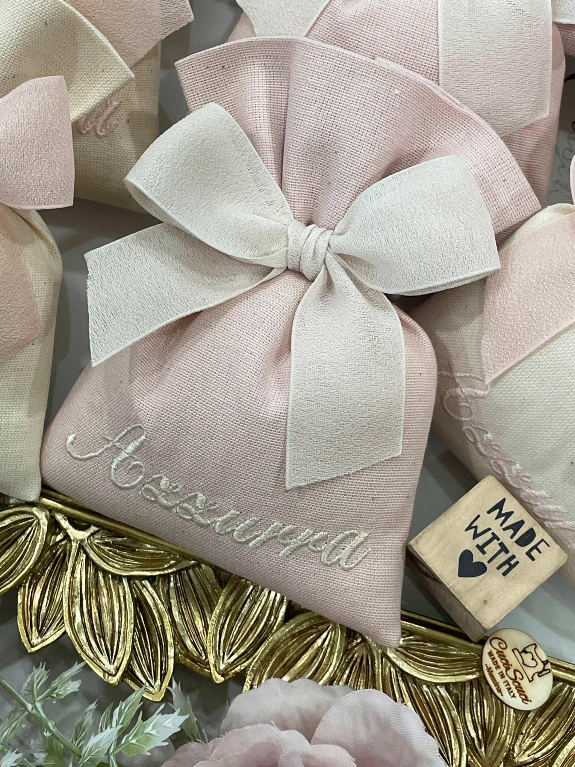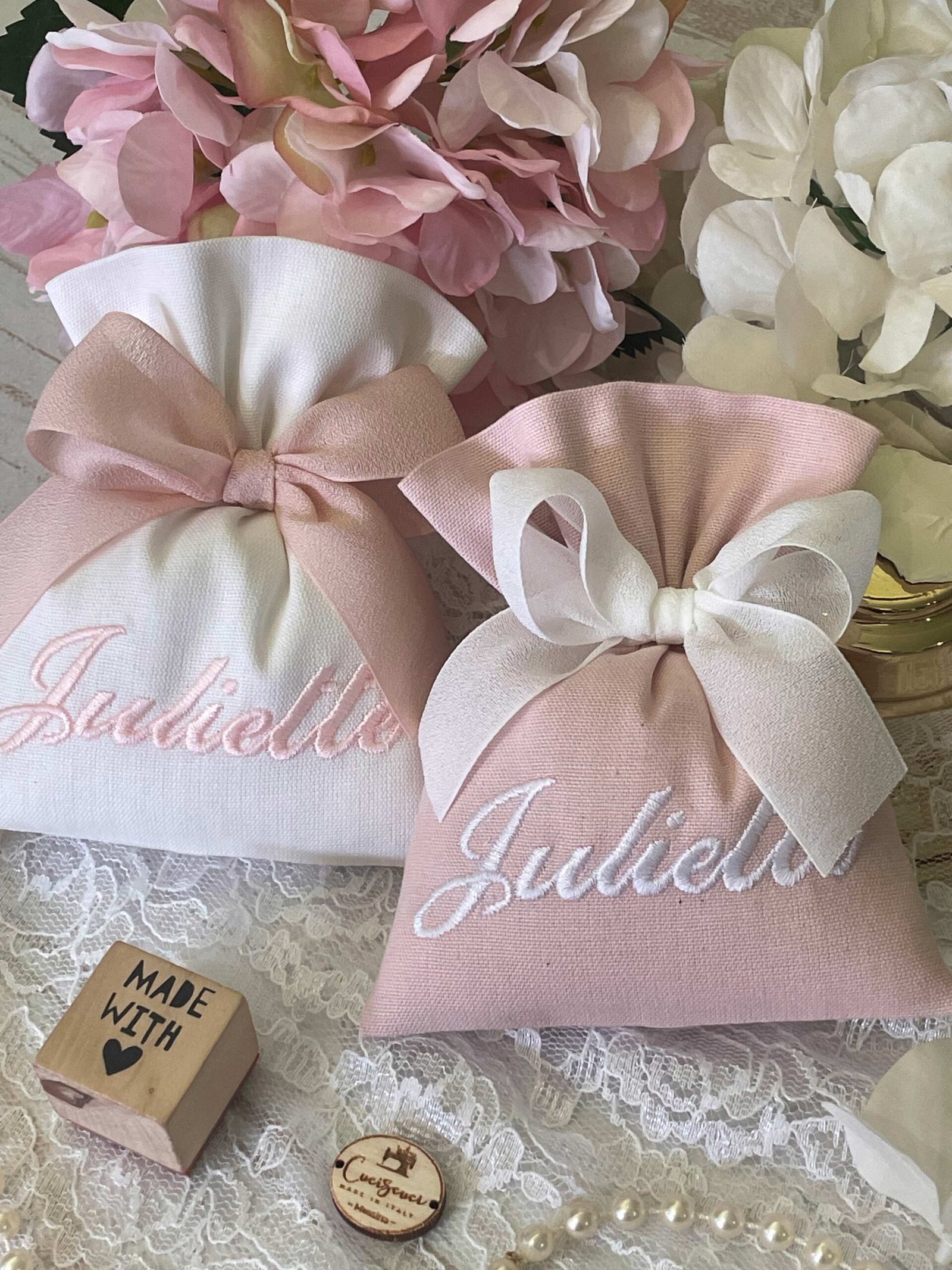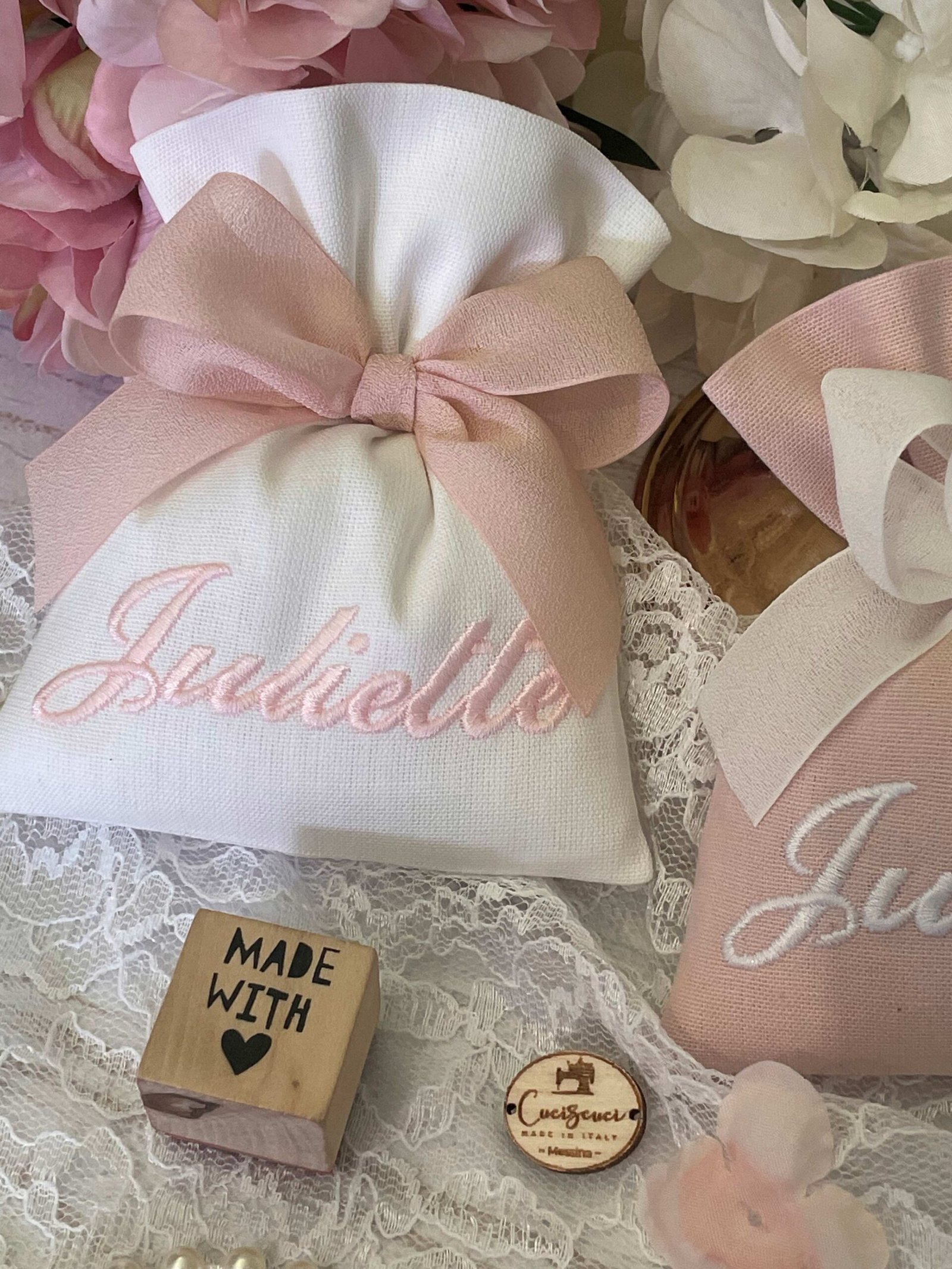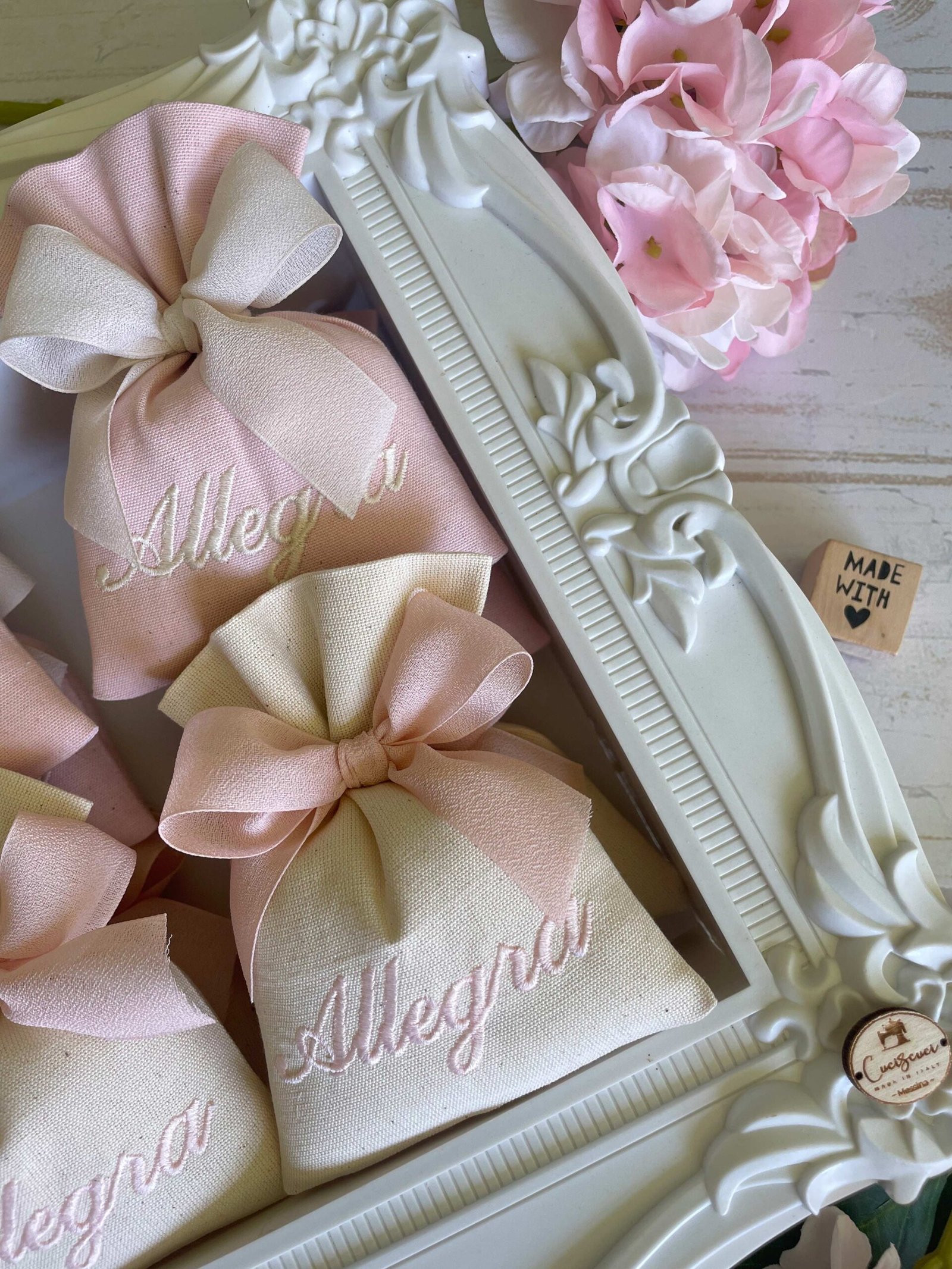 Questo sacchetto in cotone tinto filo è disponibile in due fantasie assortite (o a scelta) nei delicati toni del rosa cipria e del panna, ed è impreziosito dal ricamo personalizzato di un nome.