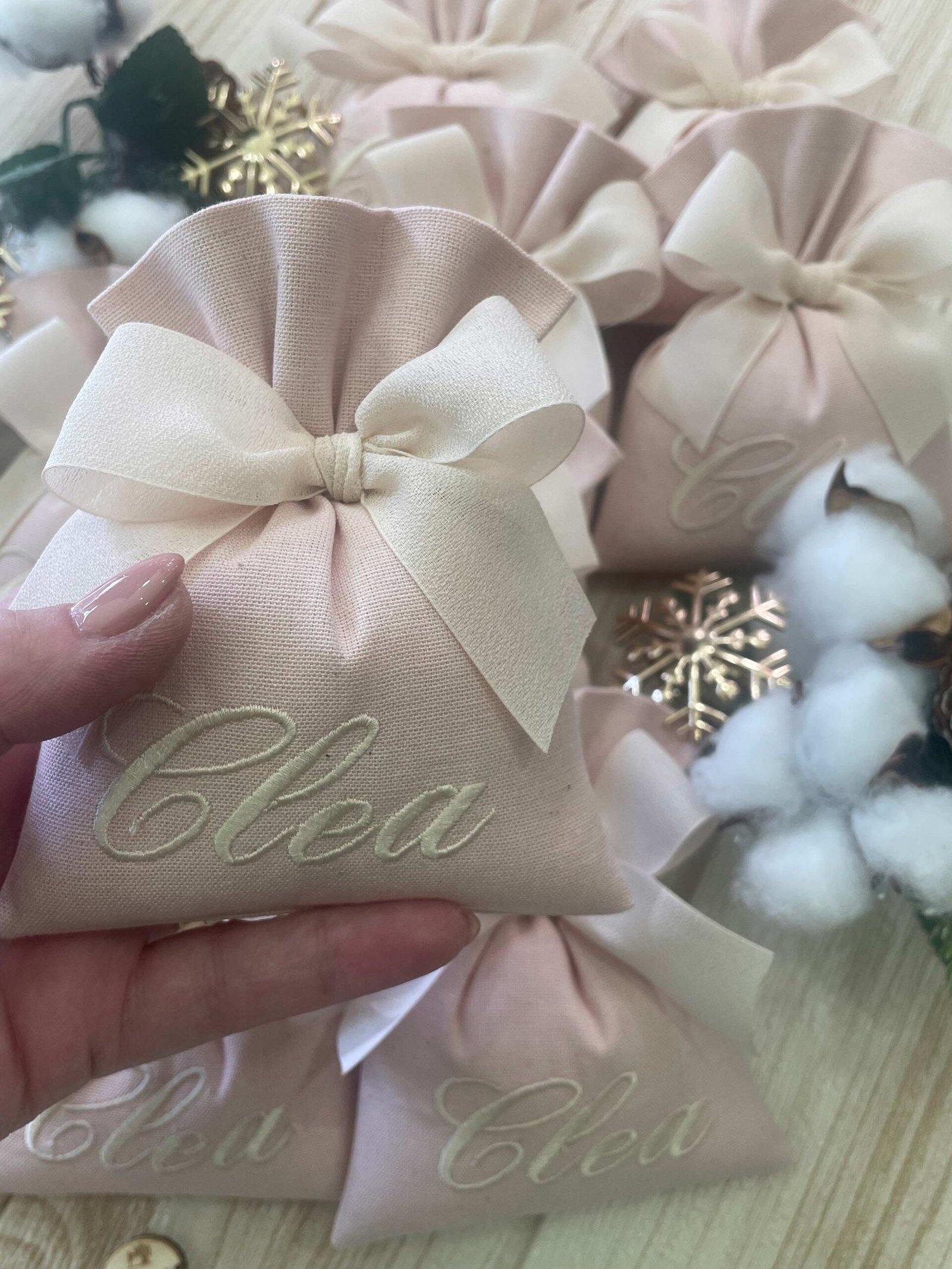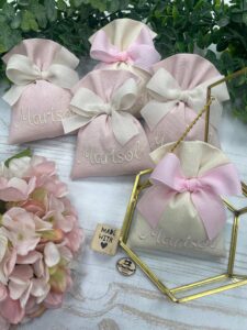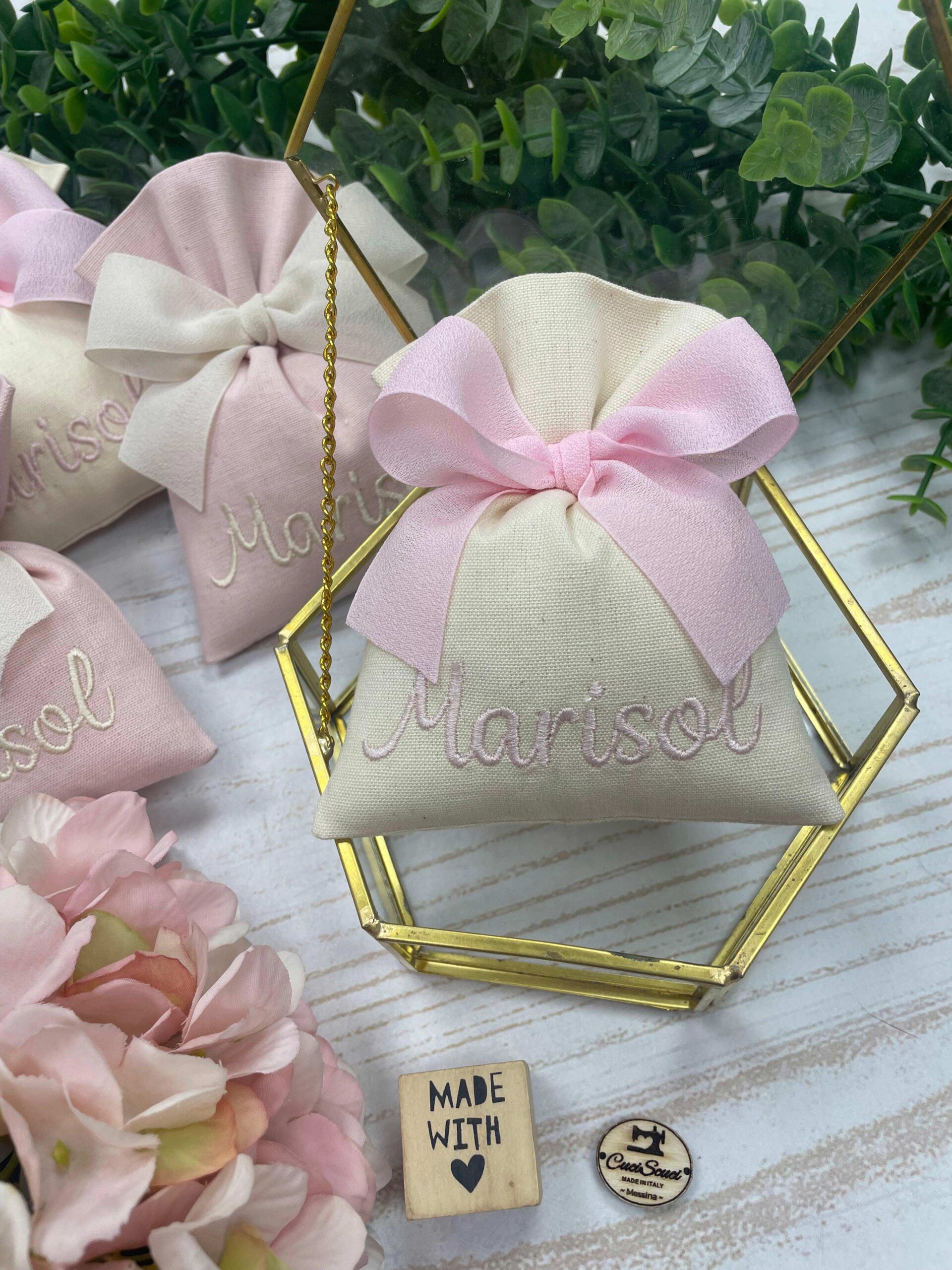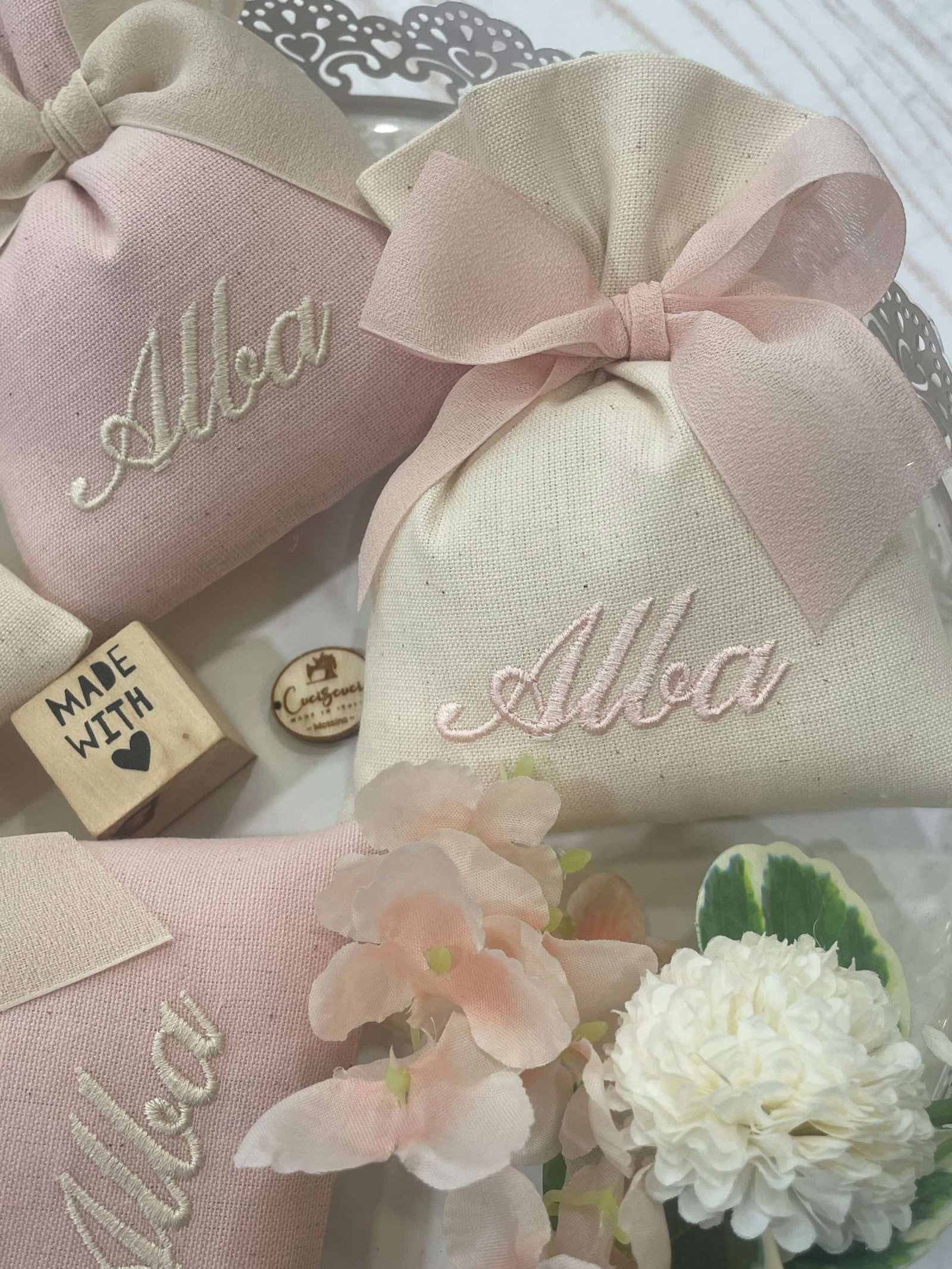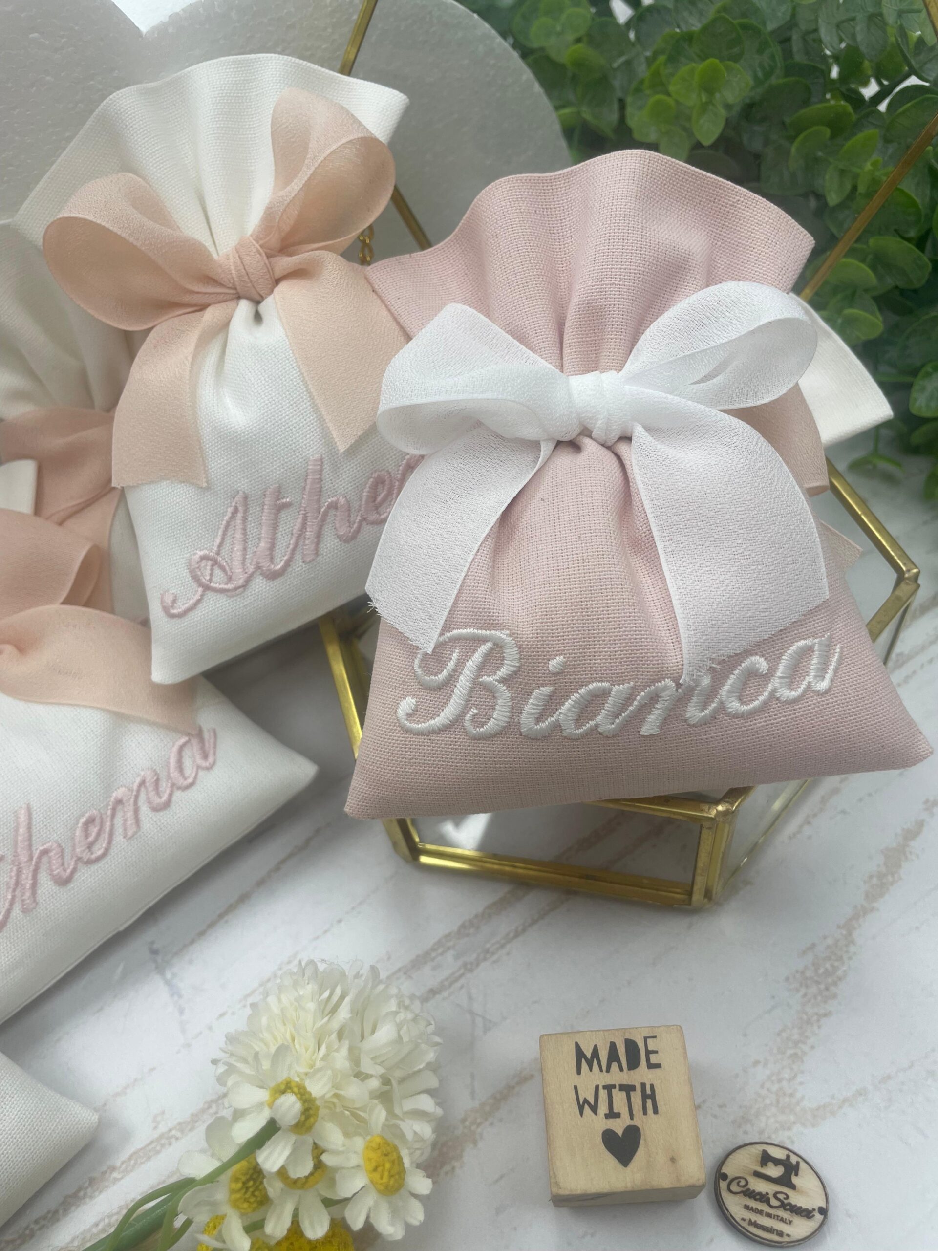 Questo sacchetto in cotone tinto filo è disponibile in due fantasie assortite (o a scelta) nei delicati toni del rosa cipria e del panna, ed è impreziosito dal ricamo personalizzato di un nome.