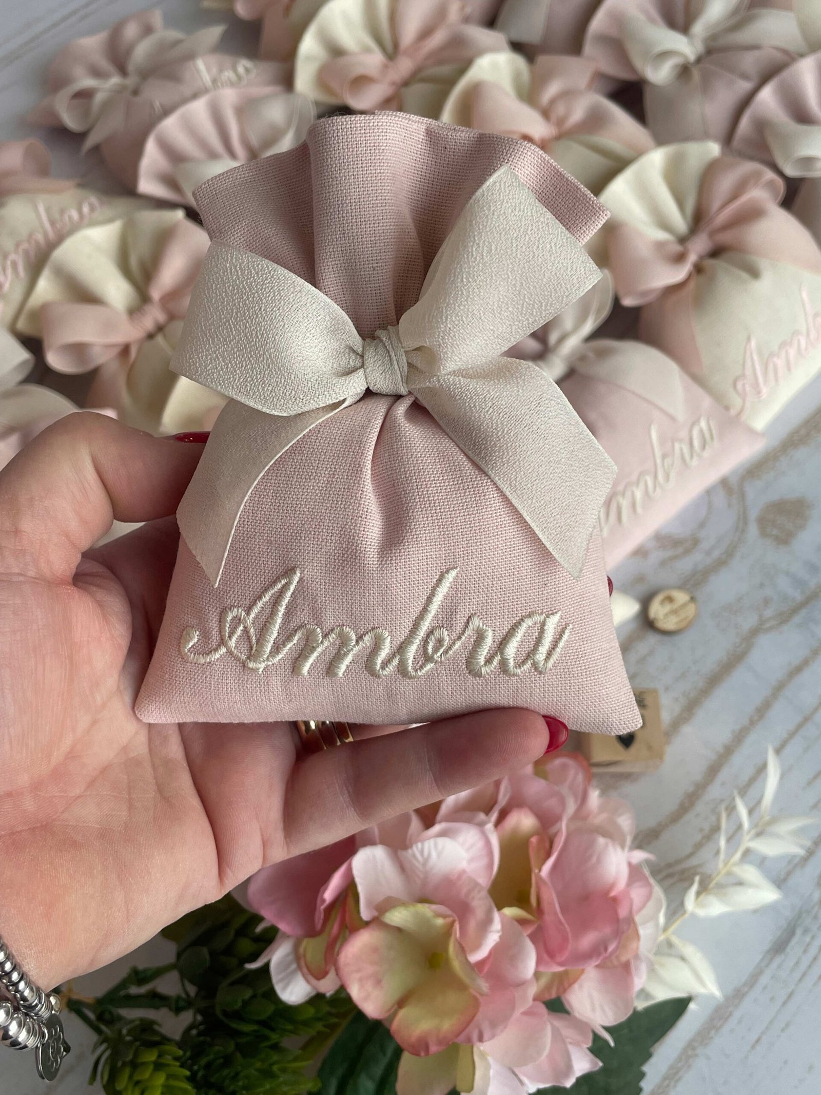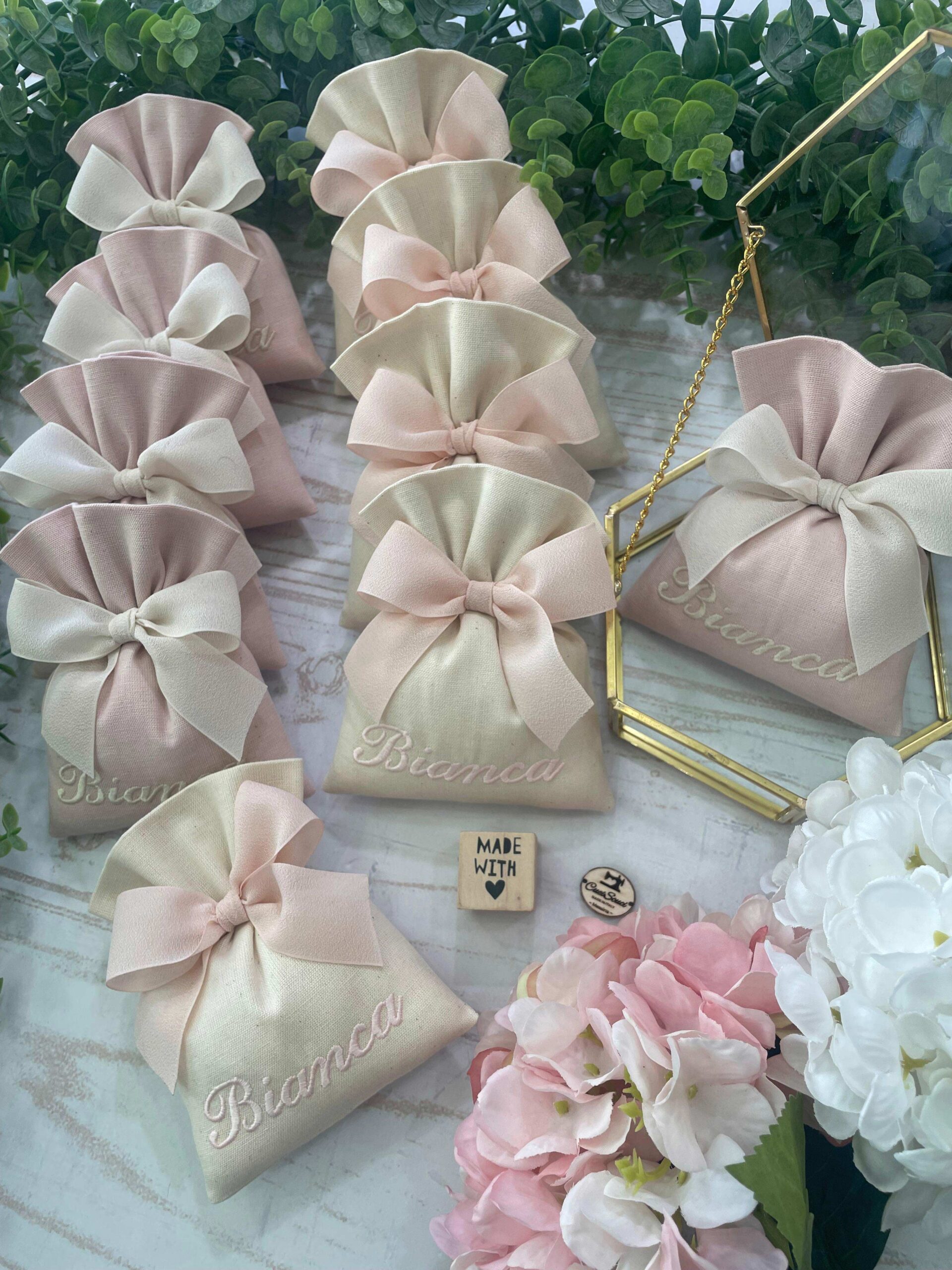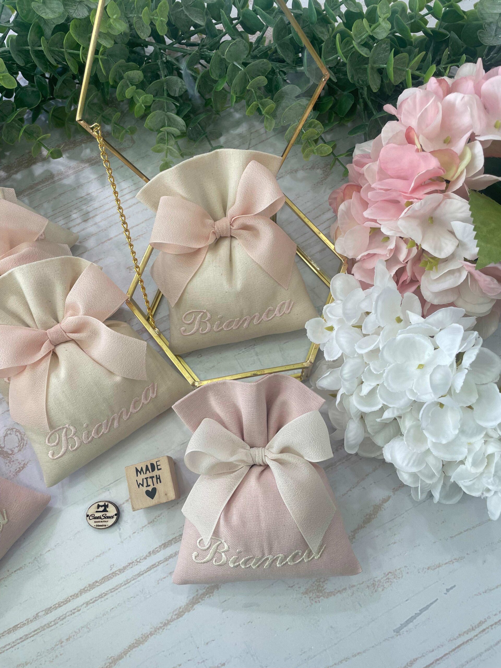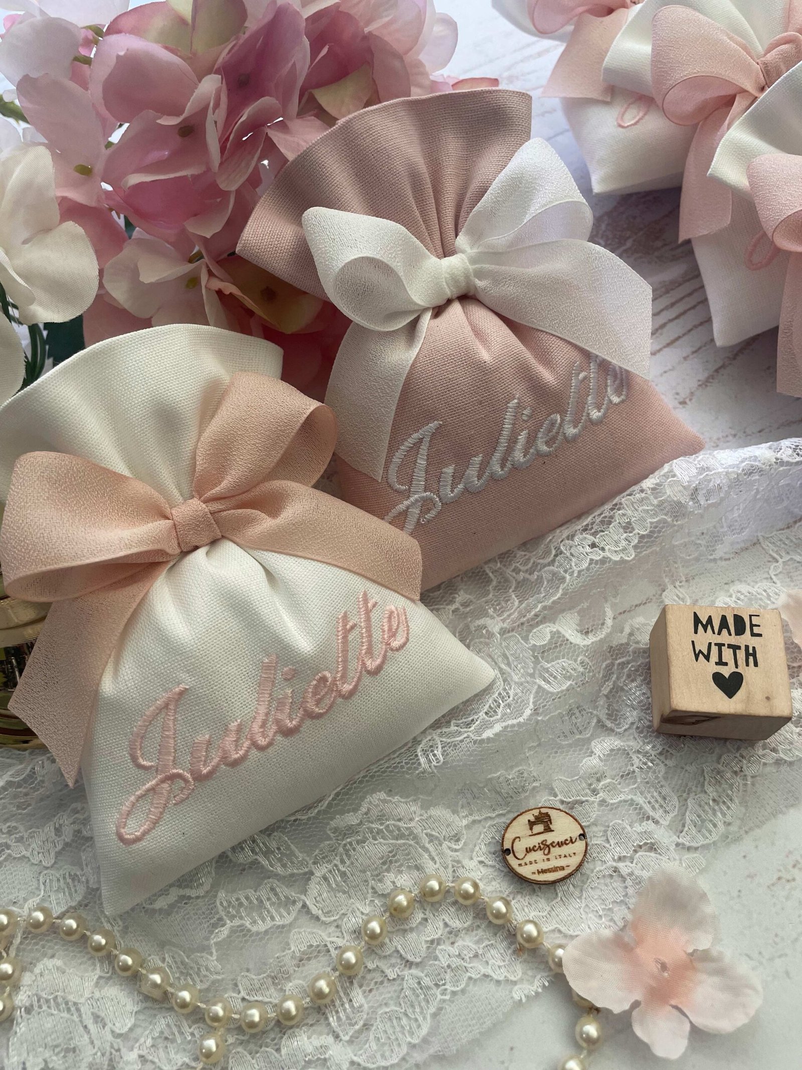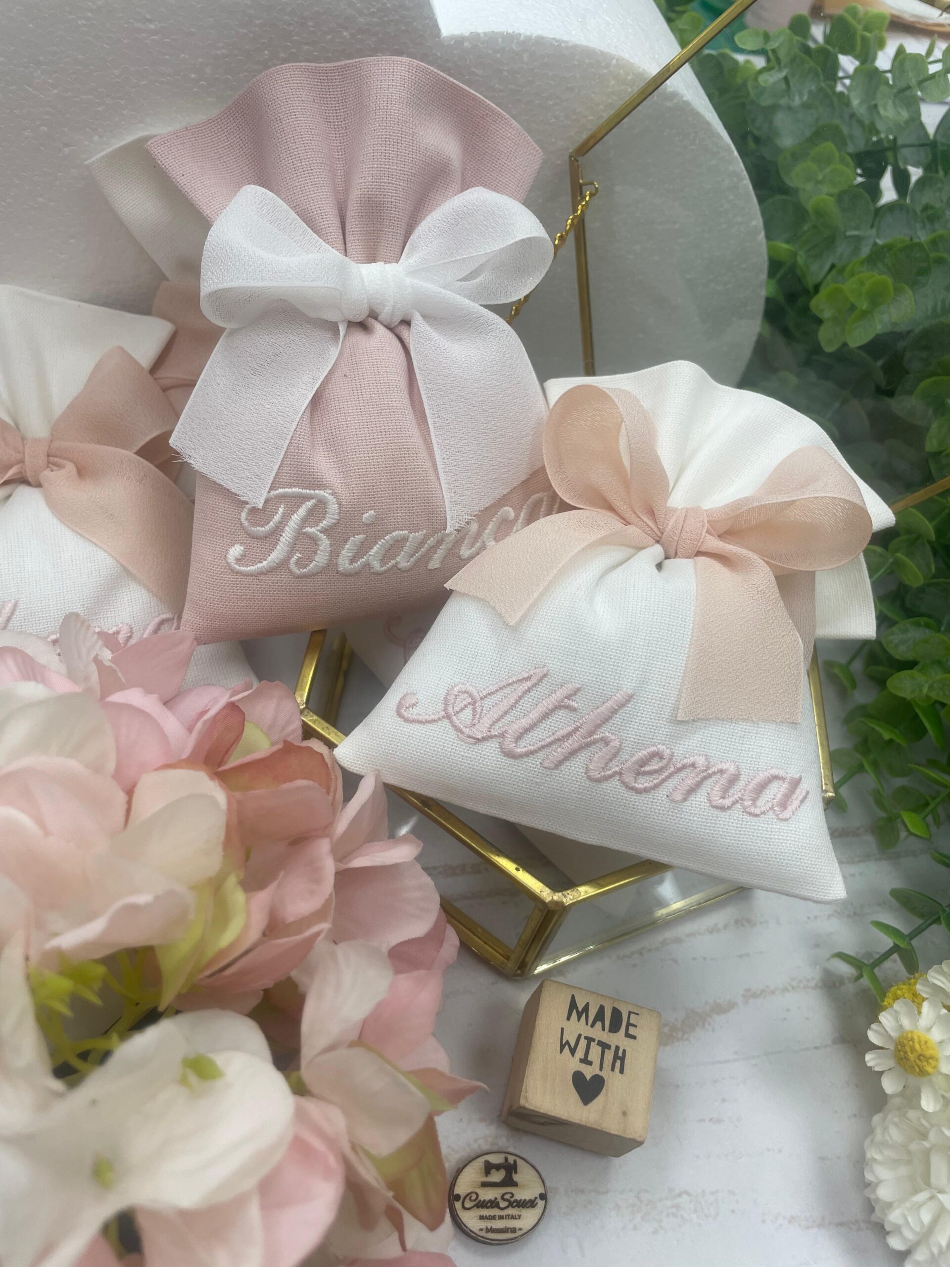 Questo sacchetto in cotone tinto filo è disponibile in due fantasie assortite (o a scelta) nei delicati toni del rosa cipria e del panna, ed è impreziosito dal ricamo personalizzato di un nome.