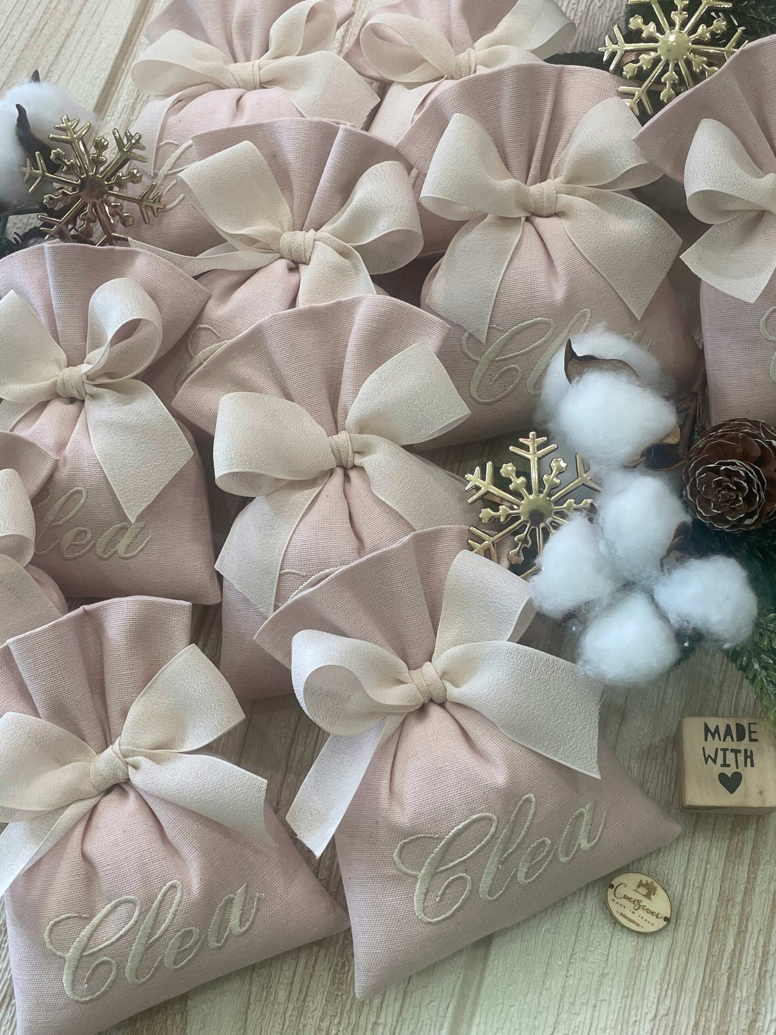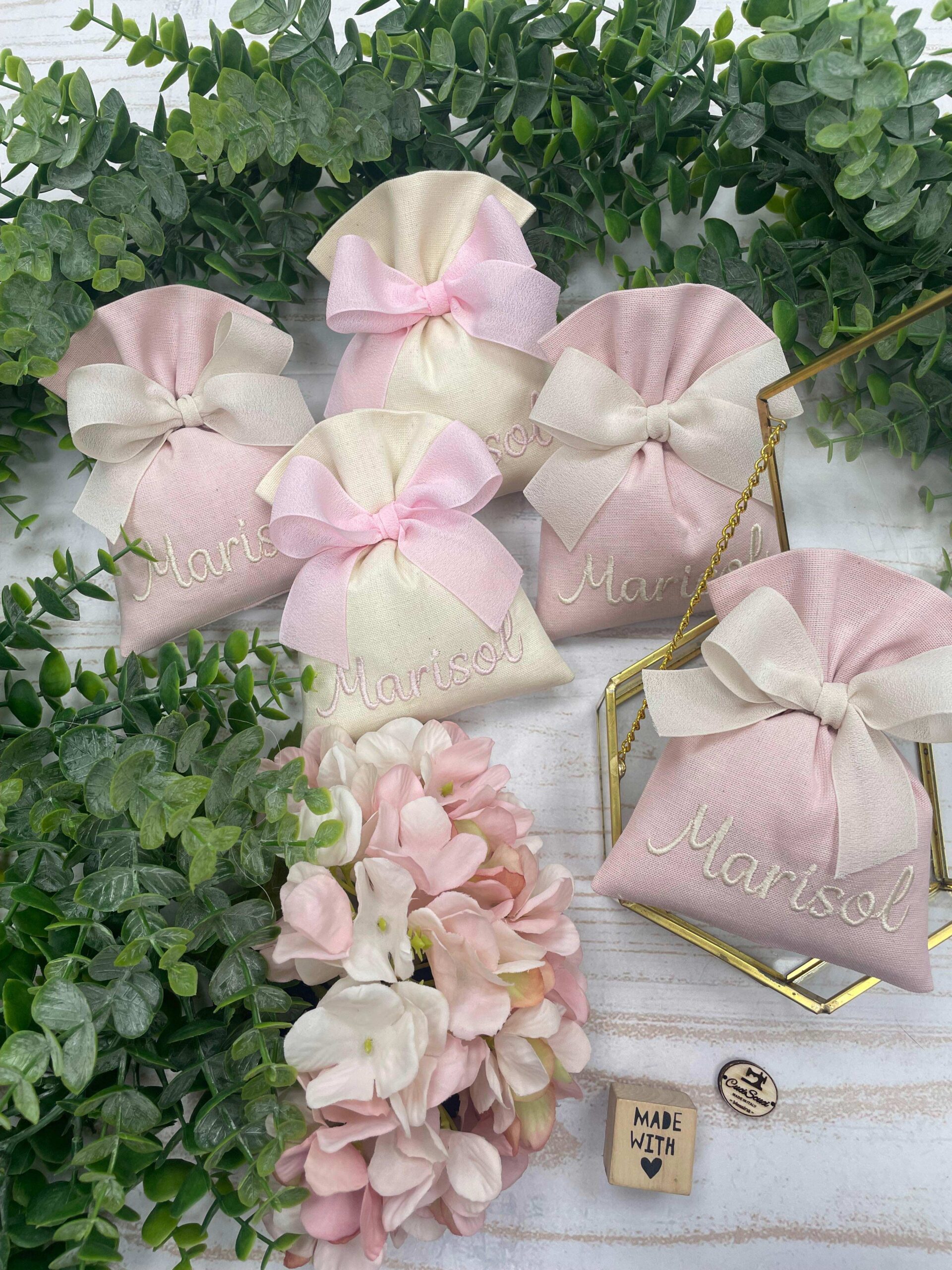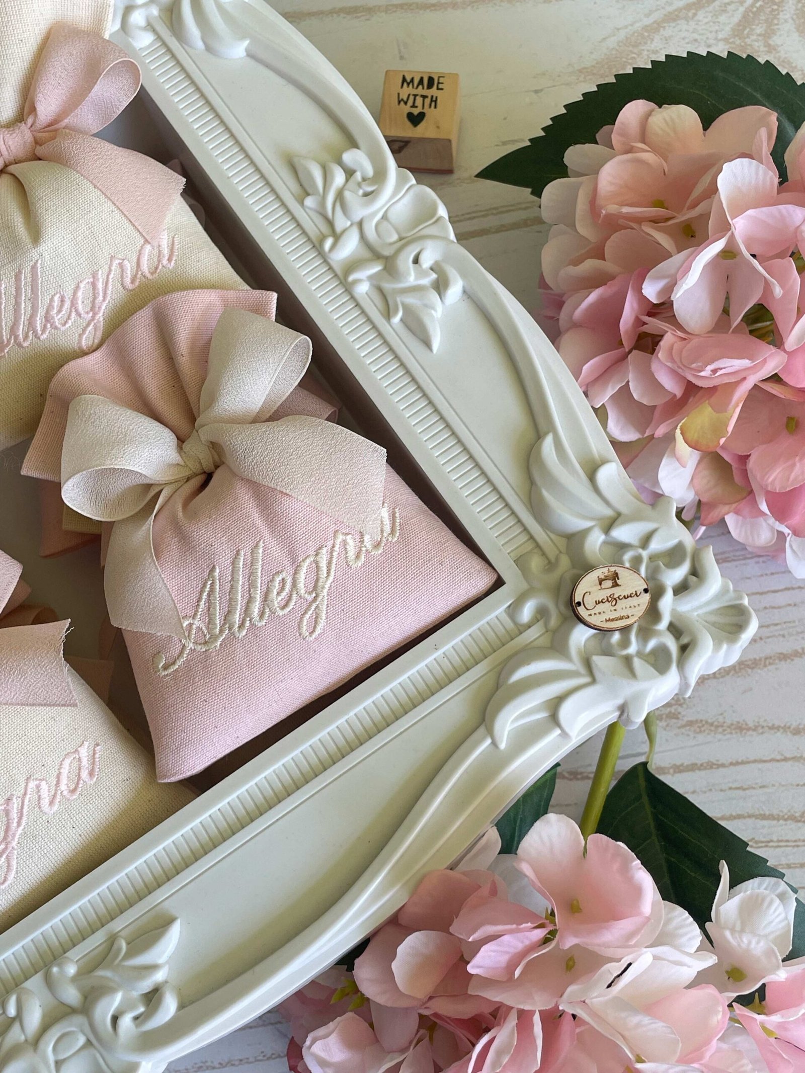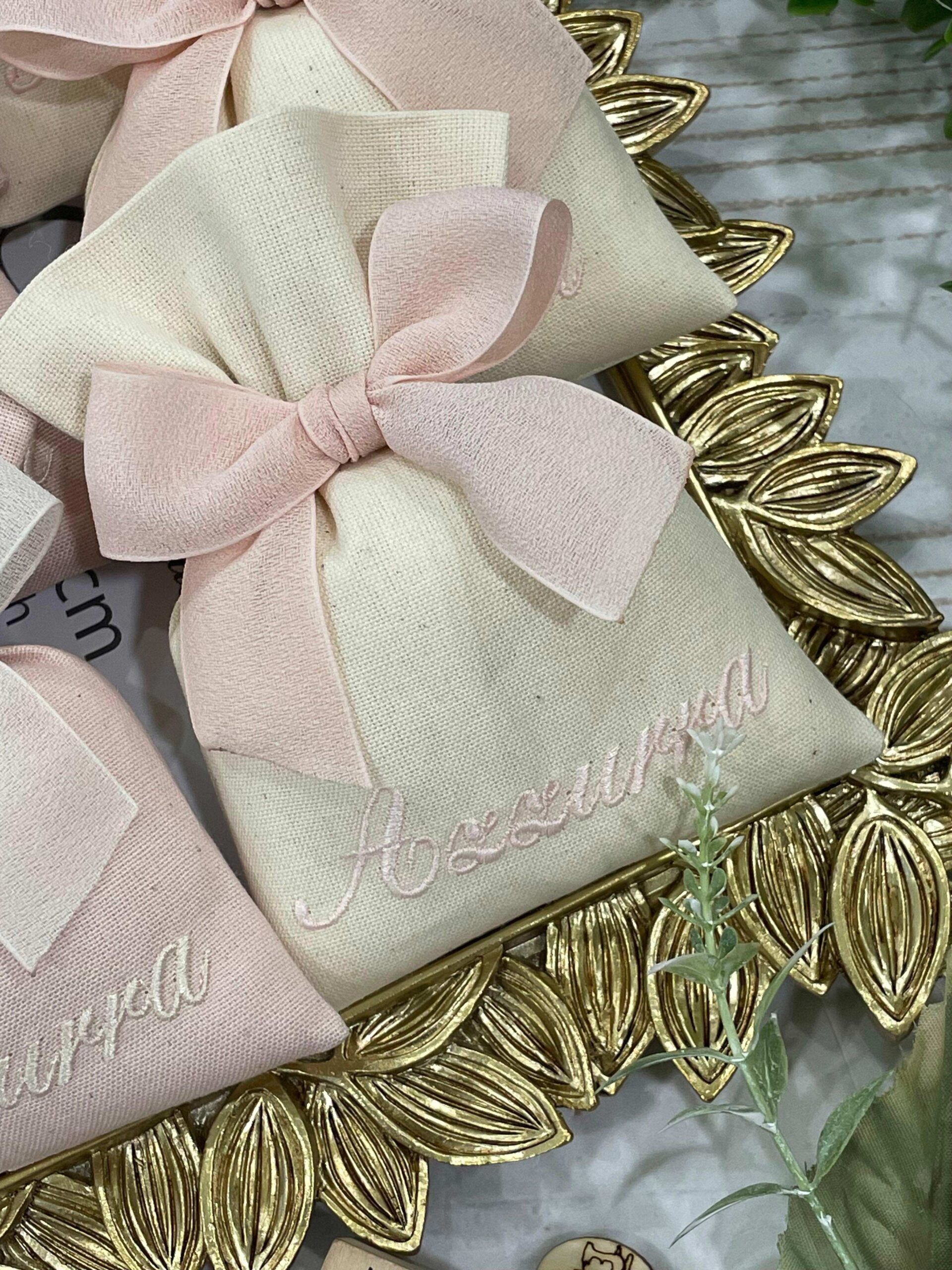 Questo sacchetto in cotone tinto filo è disponibile in due fantasie assortite (o a scelta) nei delicati toni del rosa cipria e del panna, ed è impreziosito dal ricamo personalizzato di un nome.