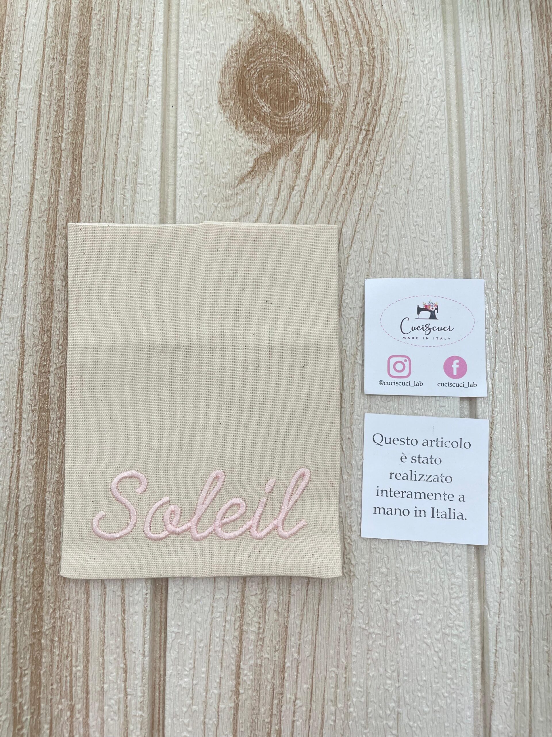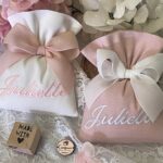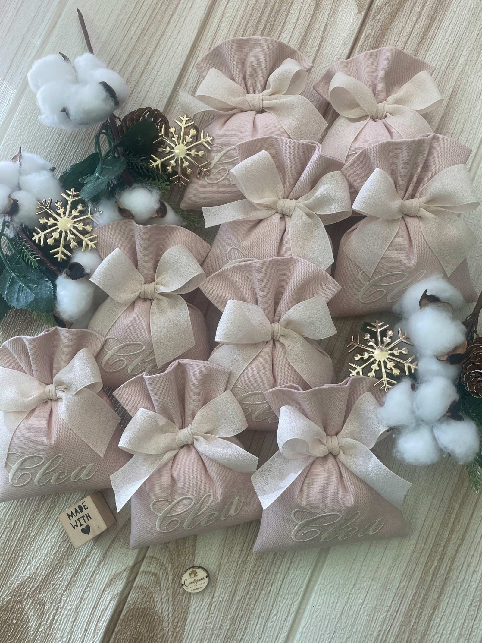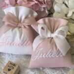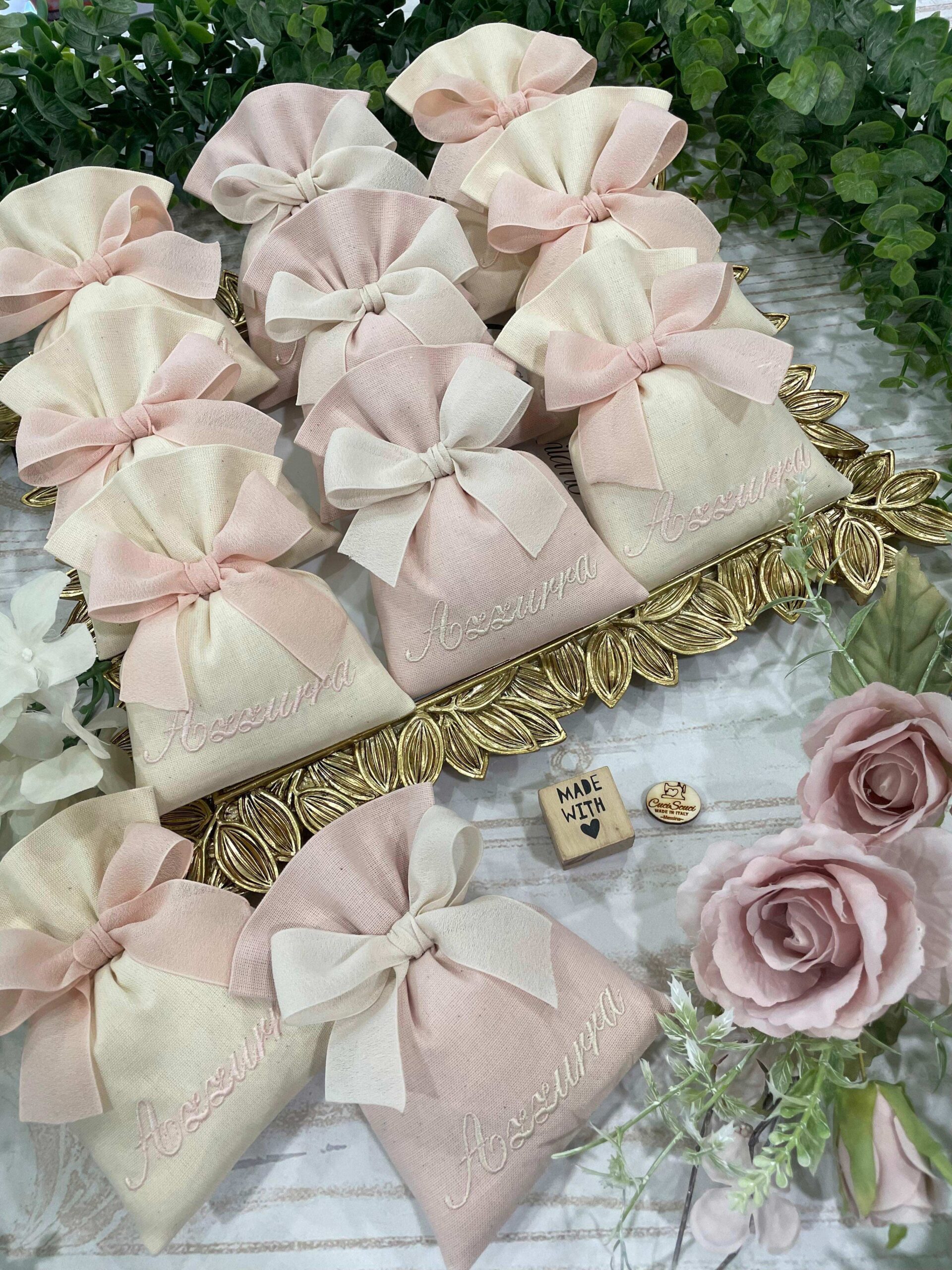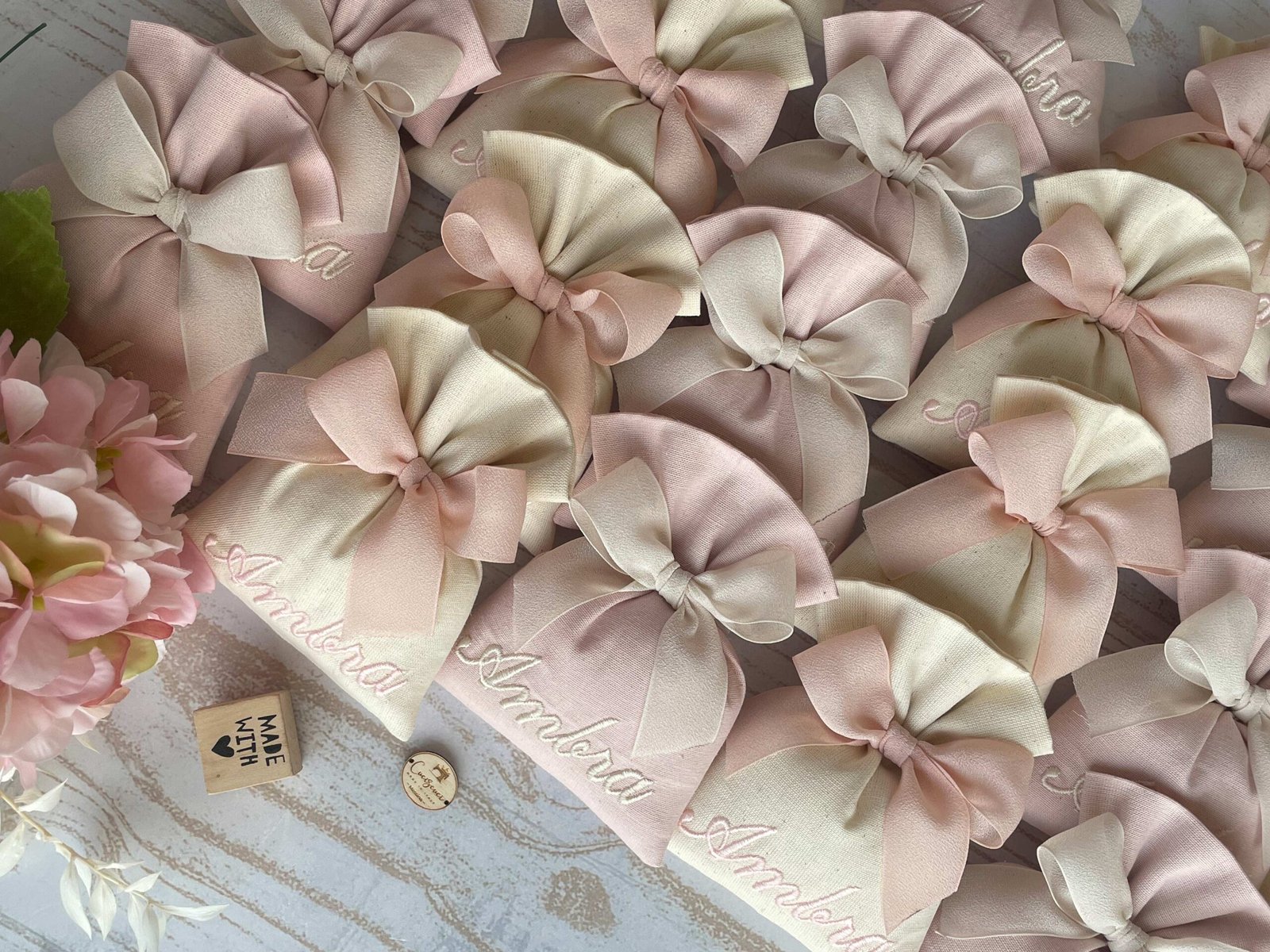 Questo sacchetto in cotone tinto filo è disponibile in due fantasie assortite (o a scelta) nei delicati toni del rosa cipria e del panna, ed è impreziosito dal ricamo personalizzato di un nome.
