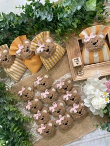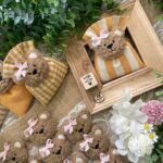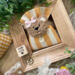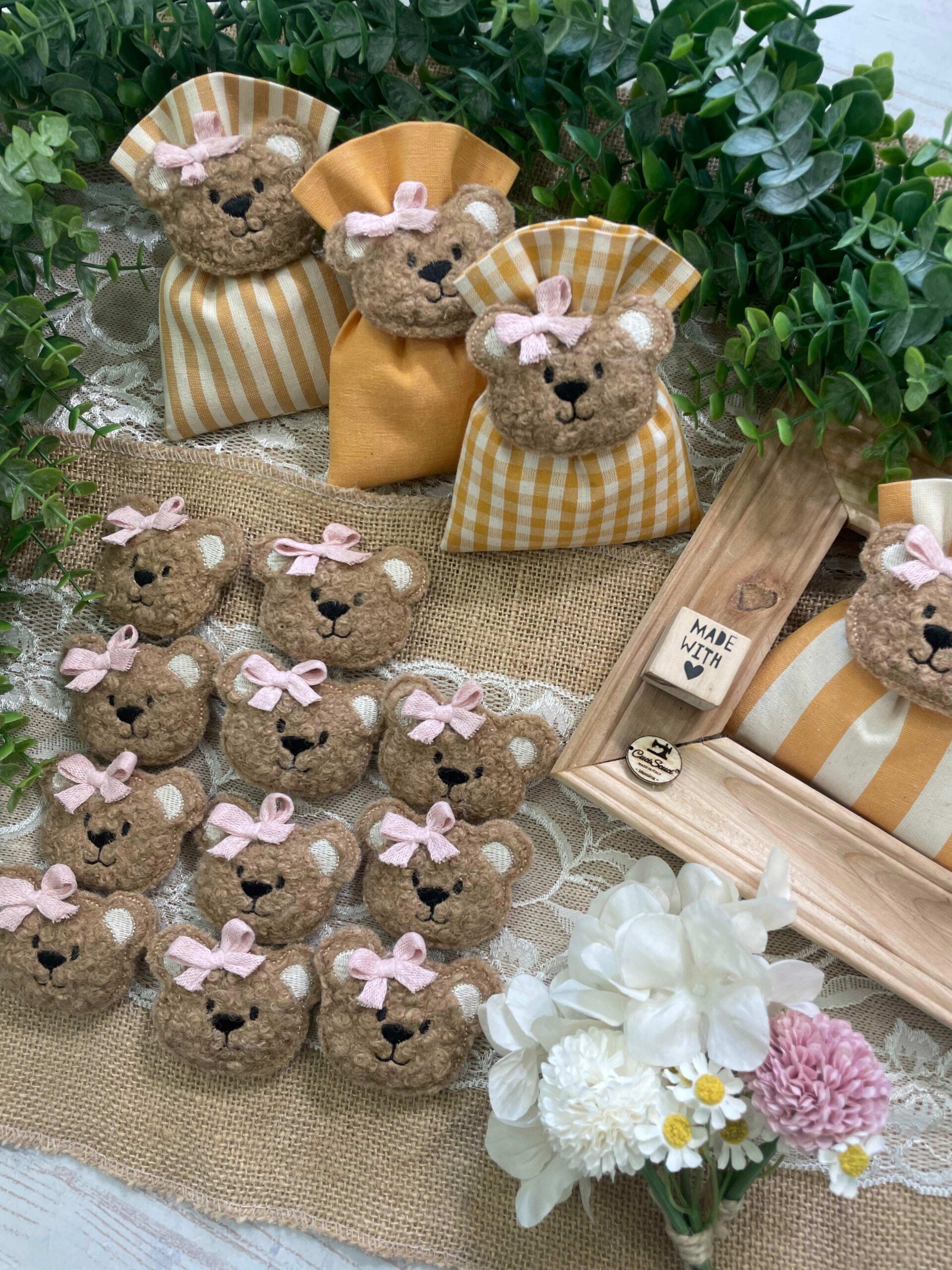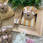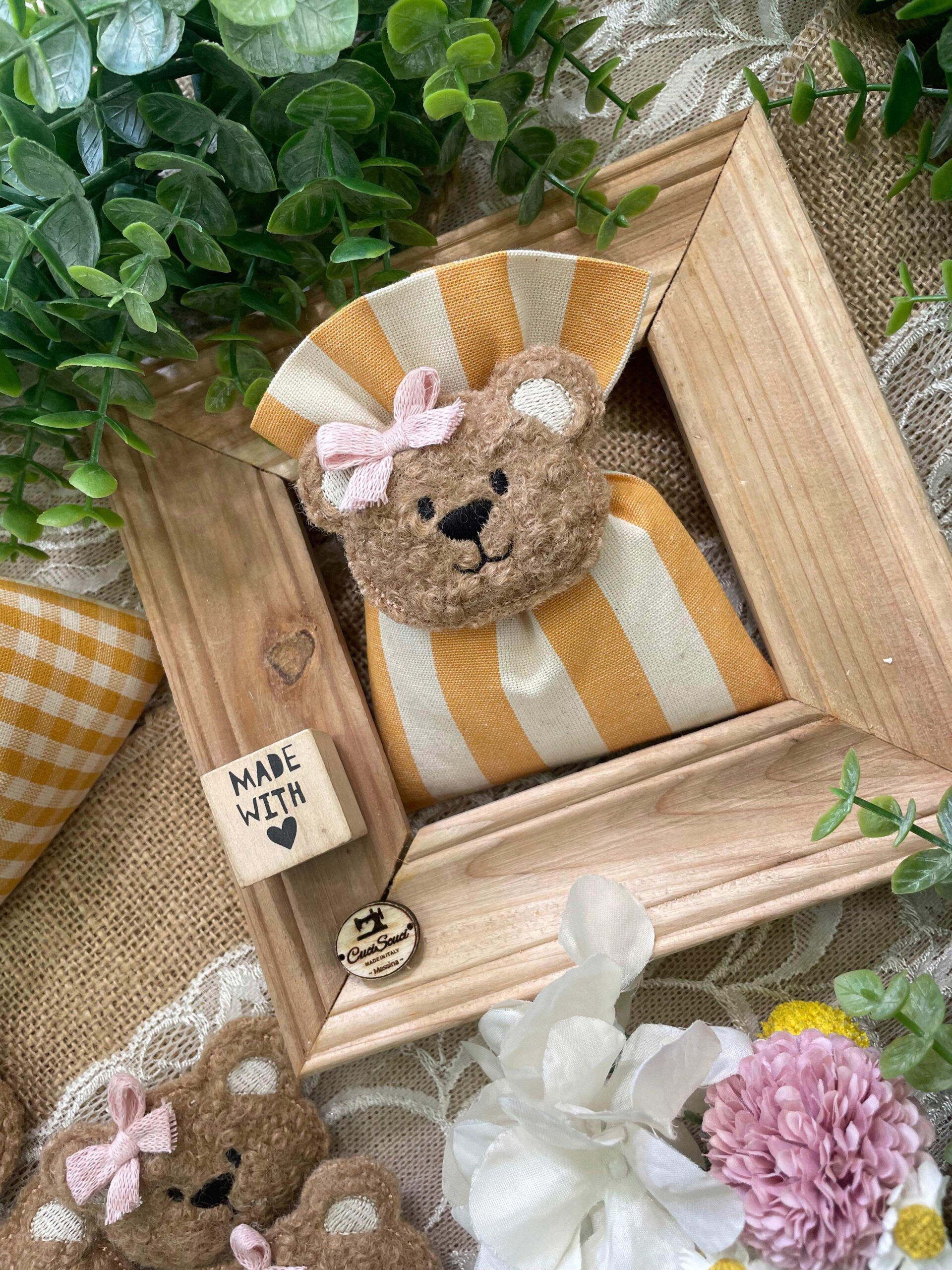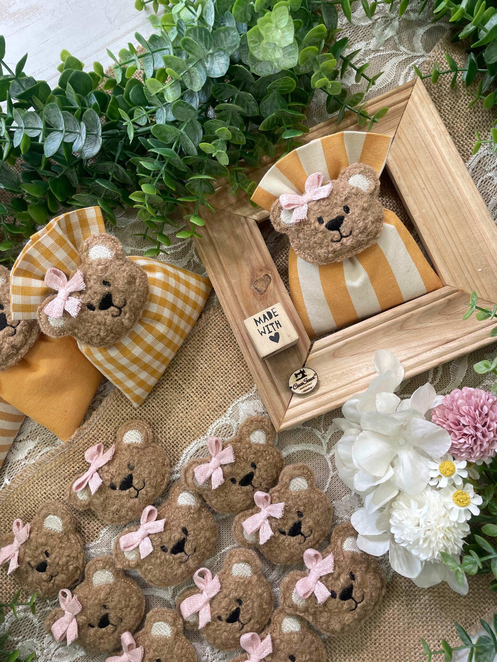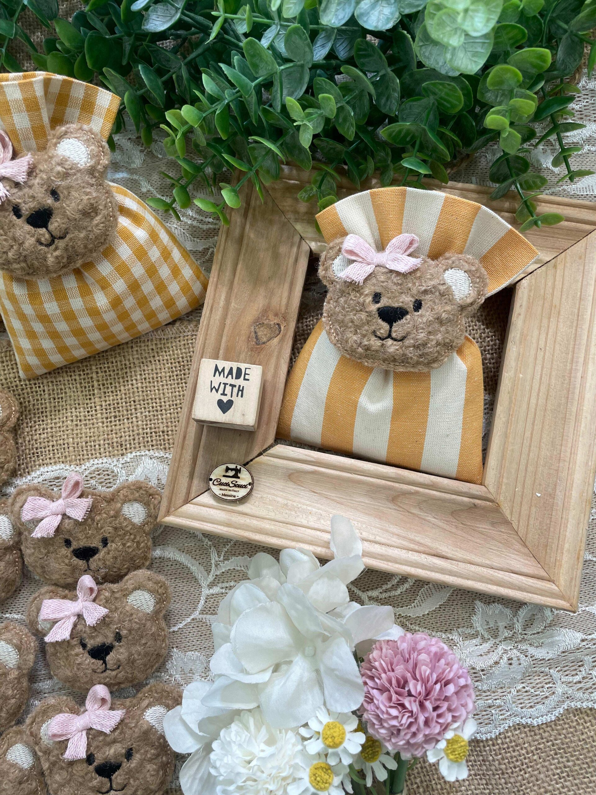 Confezionato in cotone tinto filo color senape, in fantasie assortite o a scelta, è impreziosito dall’applicazione di un tenero orsetto calamita in tessuto bouclè marrone o bianco, rifinito con un delicato fiocchetto rosa.