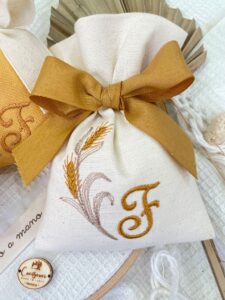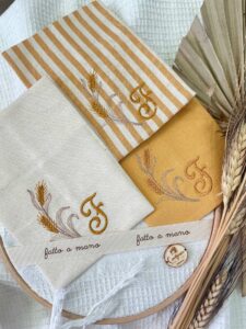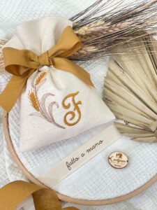 Il ricamo personalizzato con un’iniziale e una spiga di grano lo rende unico e prezioso.
