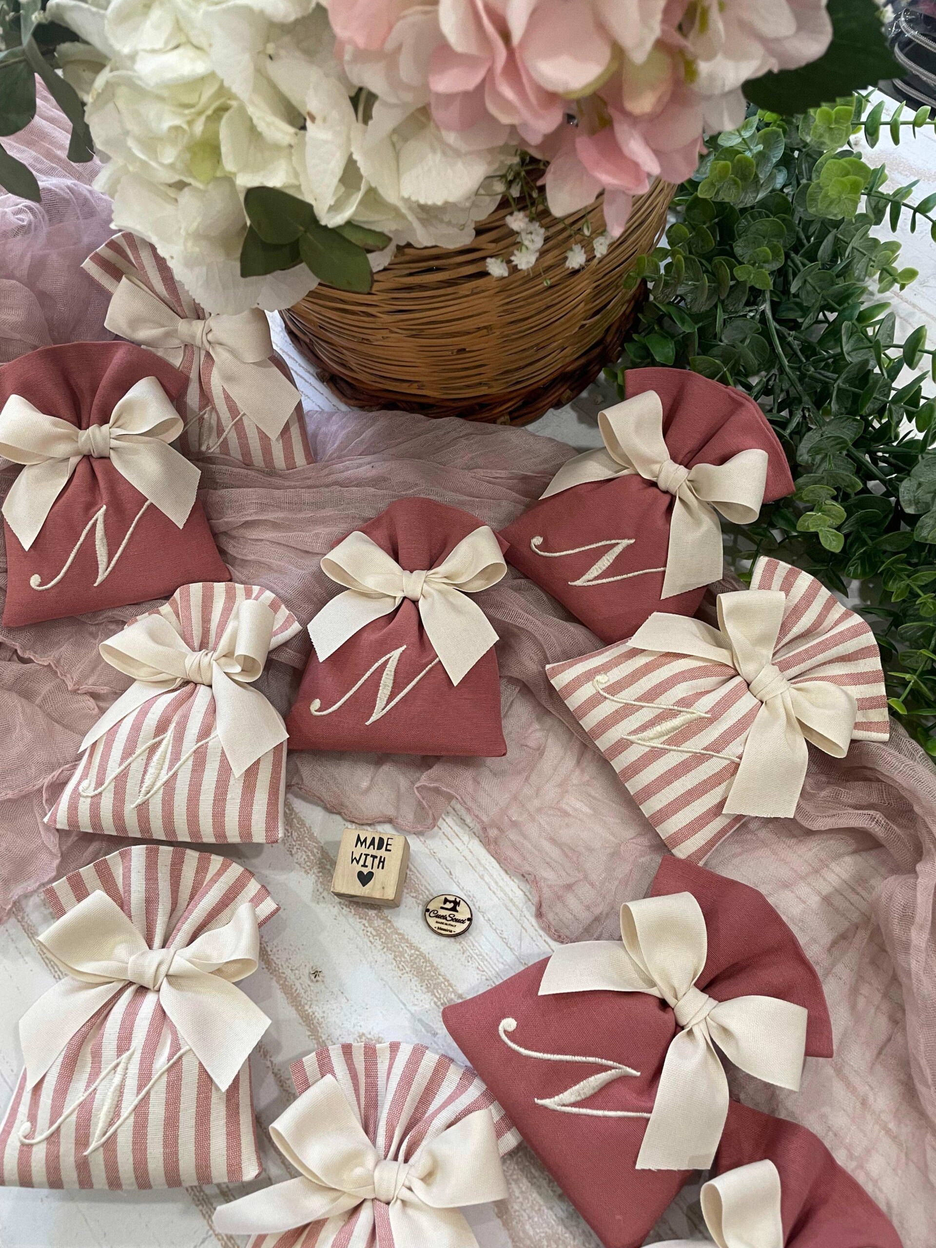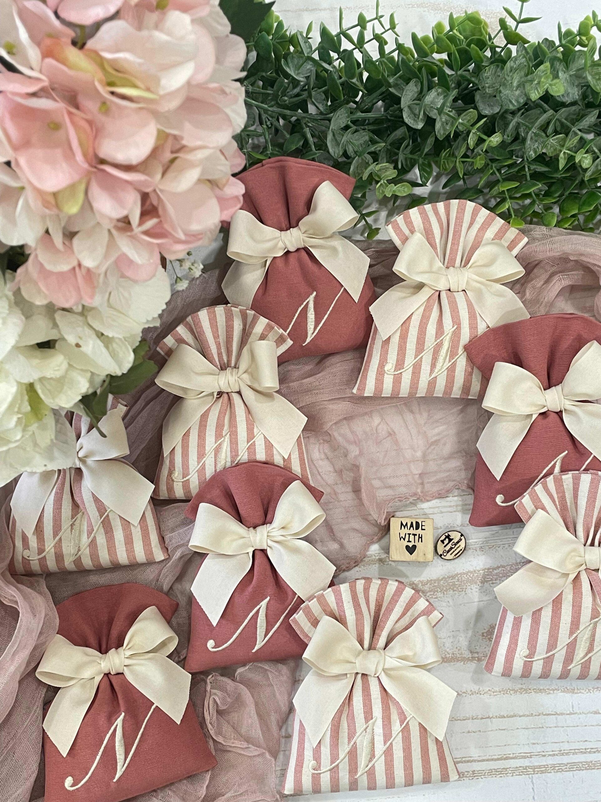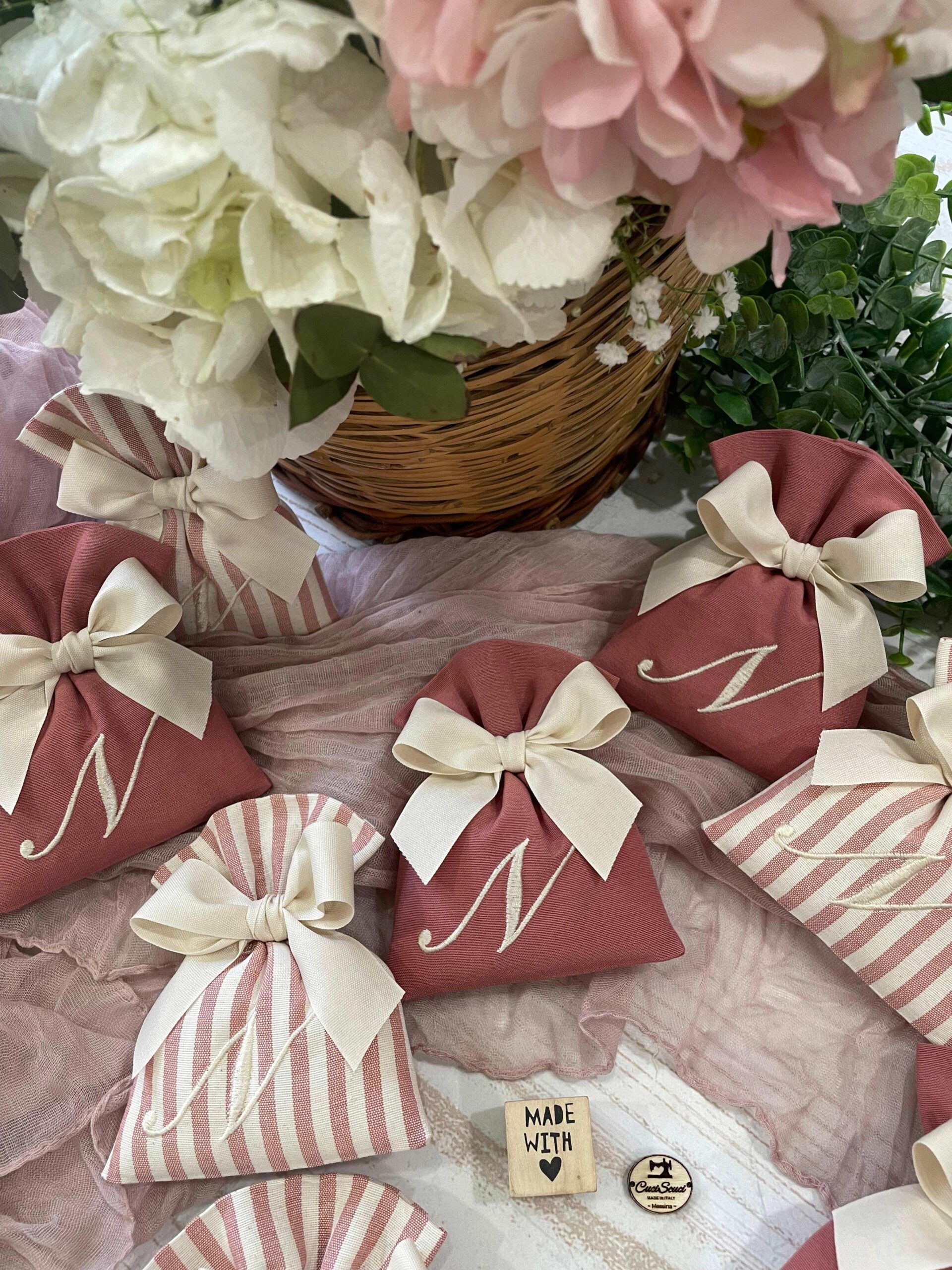 Confezionato: bomboniera pronta da donare, completa di fiocco, imbottitura e ricamo personalizzato