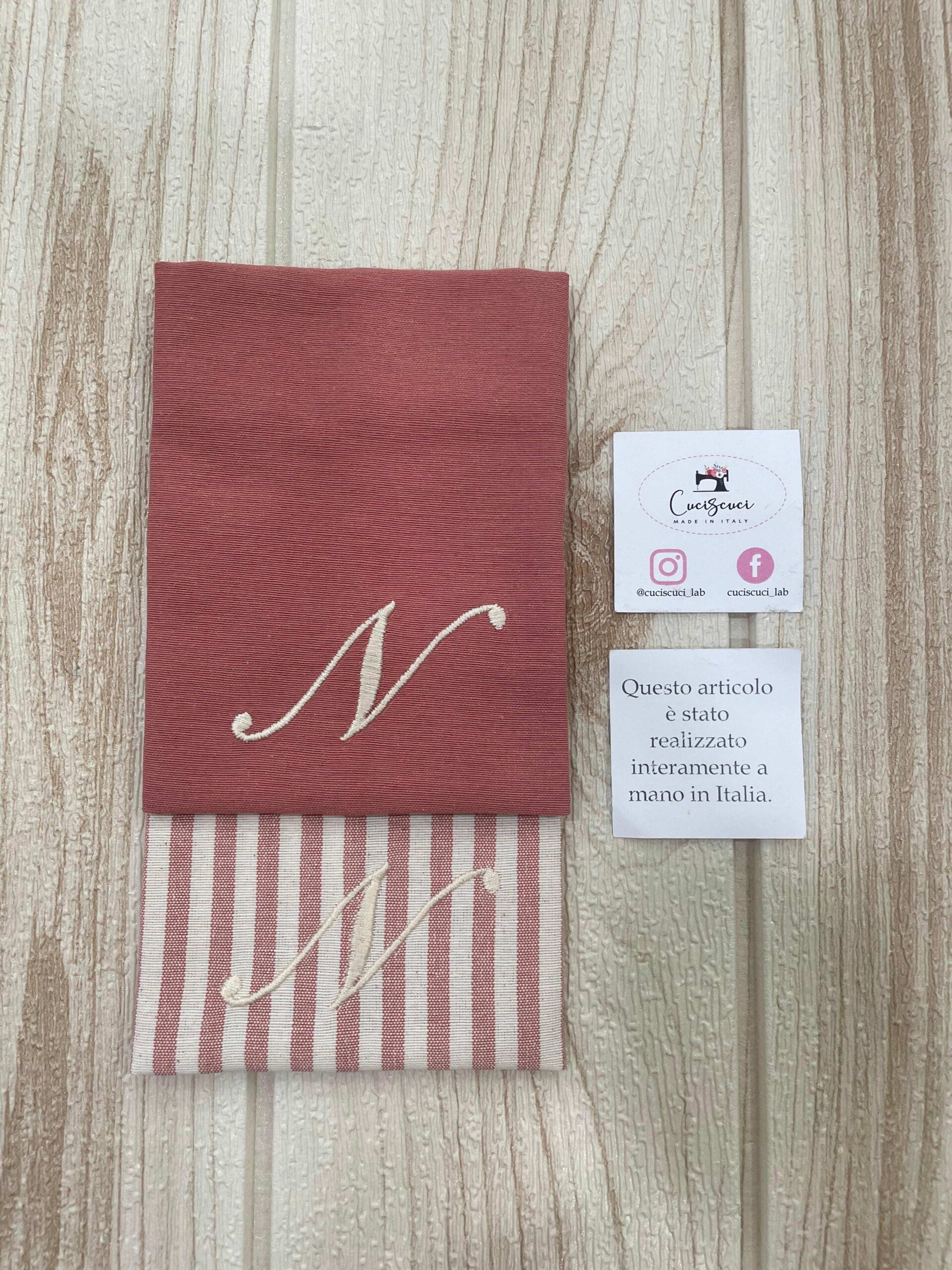 Il sacchetto in cotone tinto filo color terracotta e panna è impreziosito da un delicato ricamo a forma di iniziale, per un tocco raffinato e personalizzato.