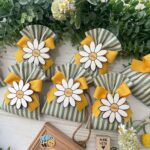 Il cotone tinto filo verde, morbido e resistente, è impreziosito da una delicata calamita personalizzata a forma di margherita con nome, che aggiunge un tocco unico e originale alla bomboniera.