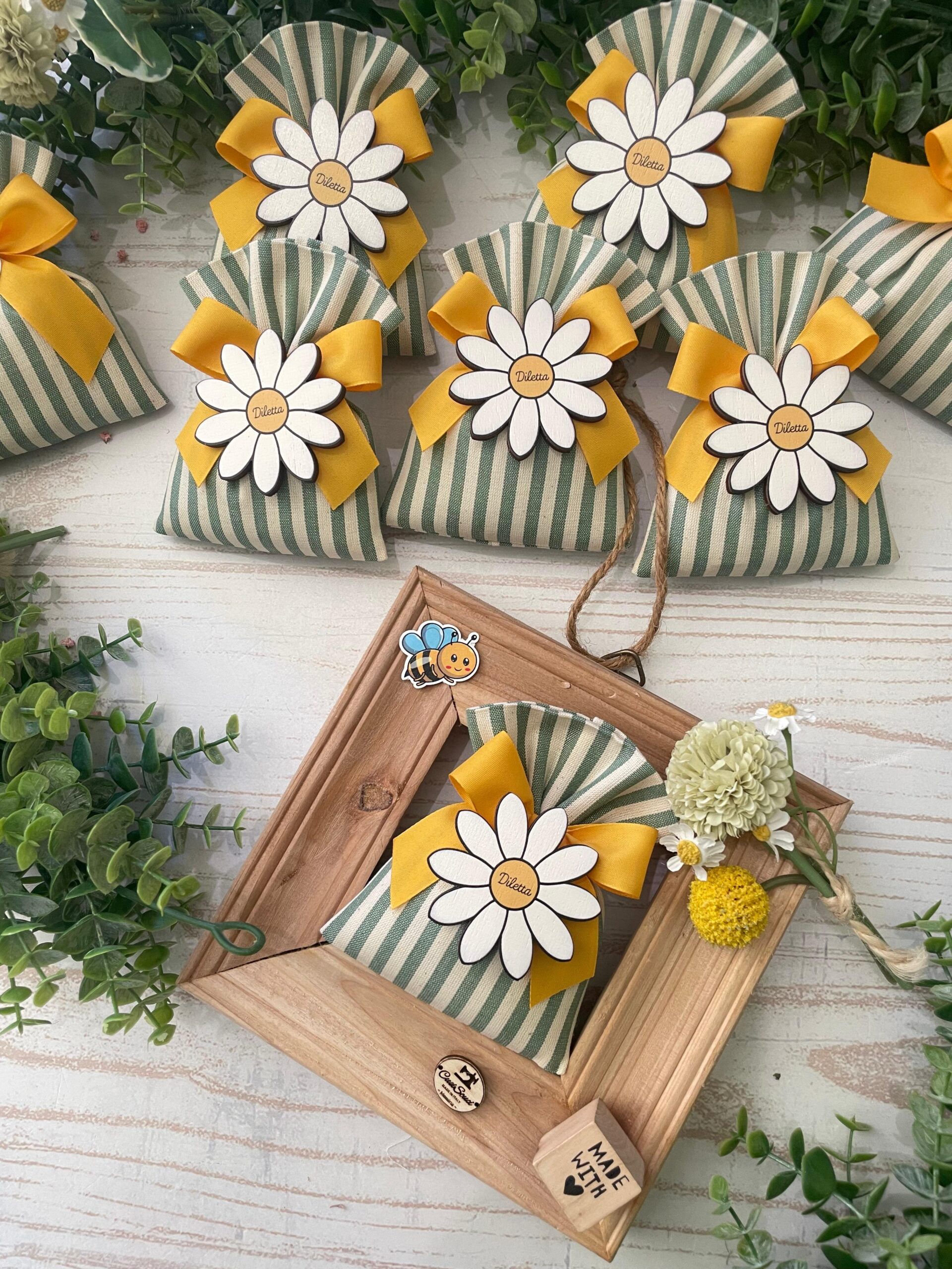 ✨ Sacchetto Artigianale in Cotone Verde con Calamita Personalizzata a Forma di Margherita ✨