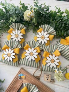 Il cotone tinto filo verde, morbido e resistente, è impreziosito da una delicata calamita personalizzata a forma di margherita con nome, che aggiunge un tocco unico e originale alla bomboniera.