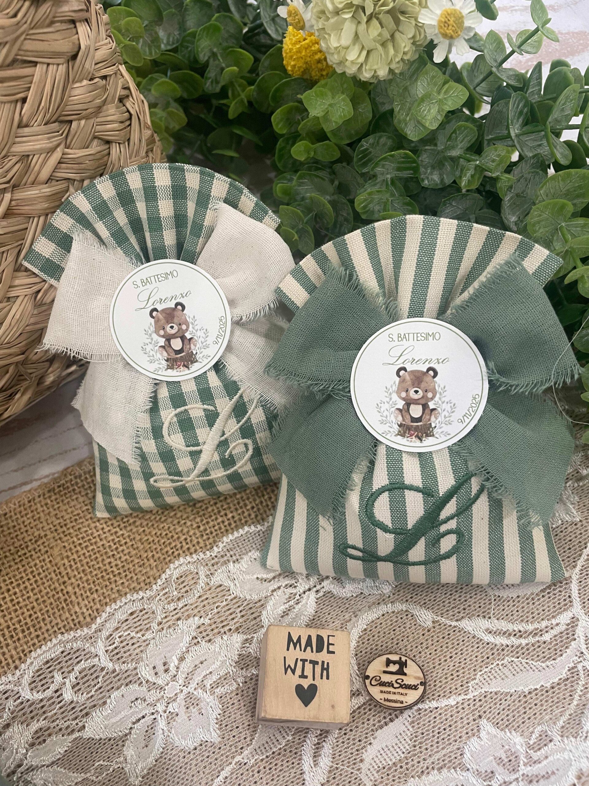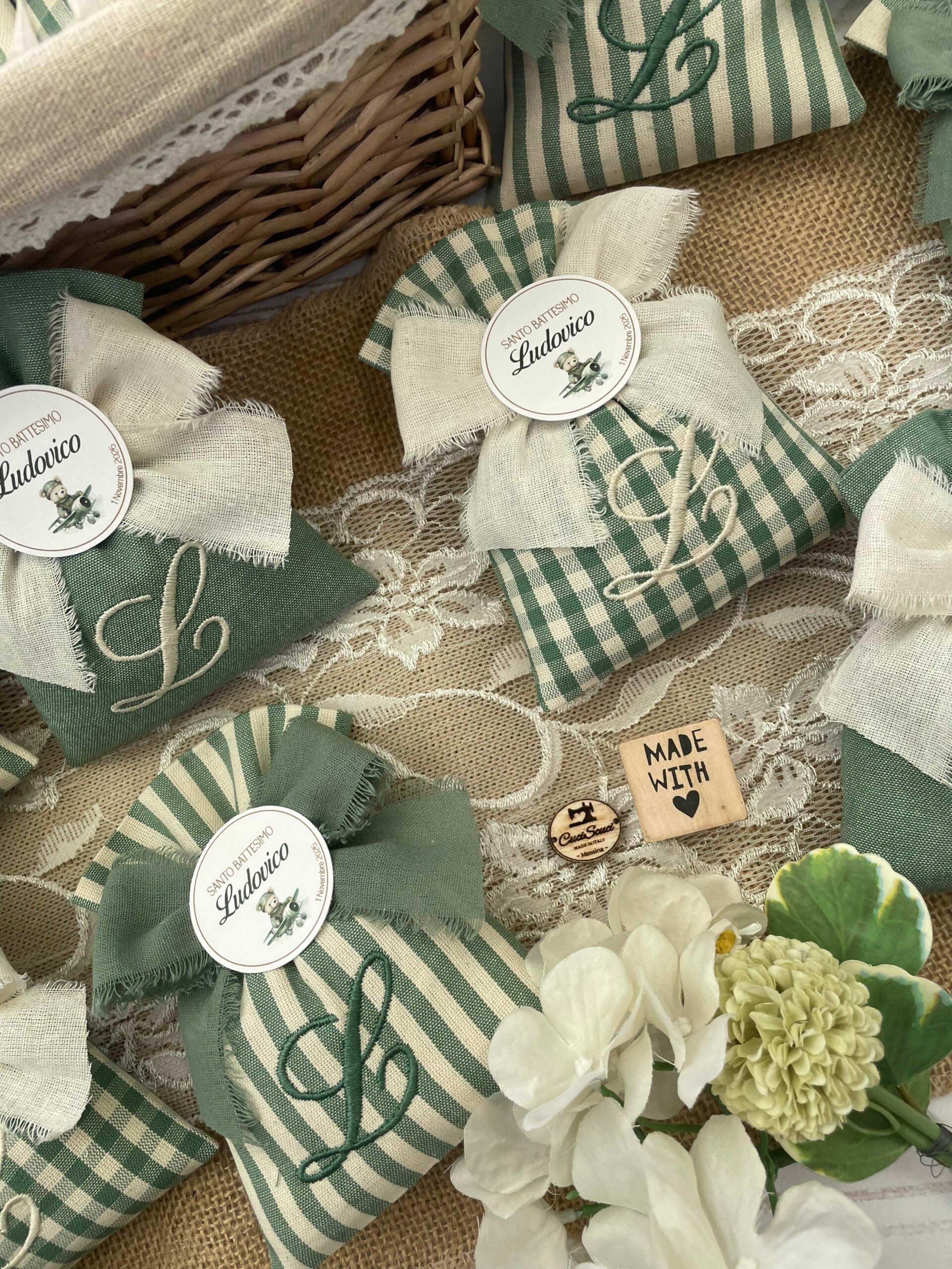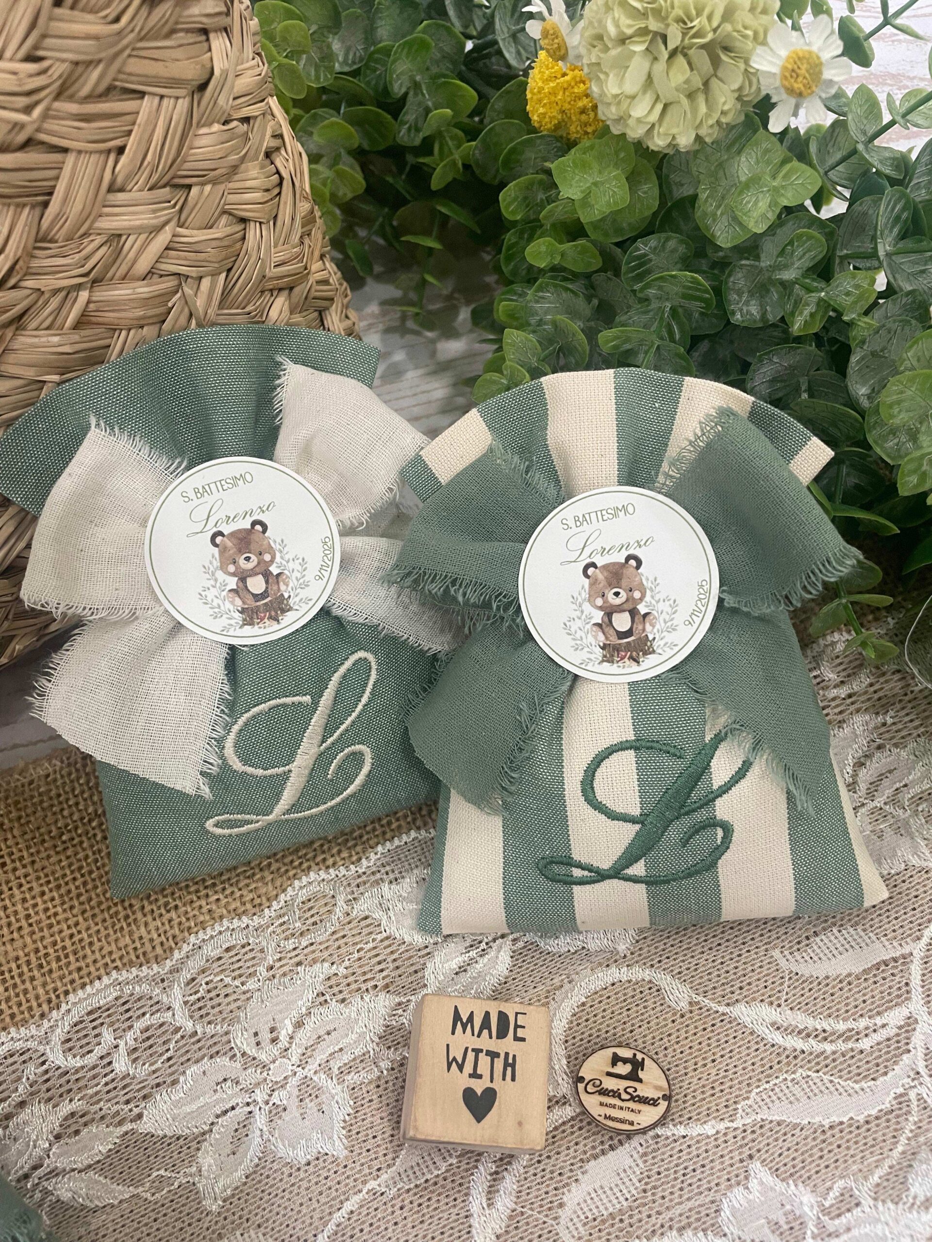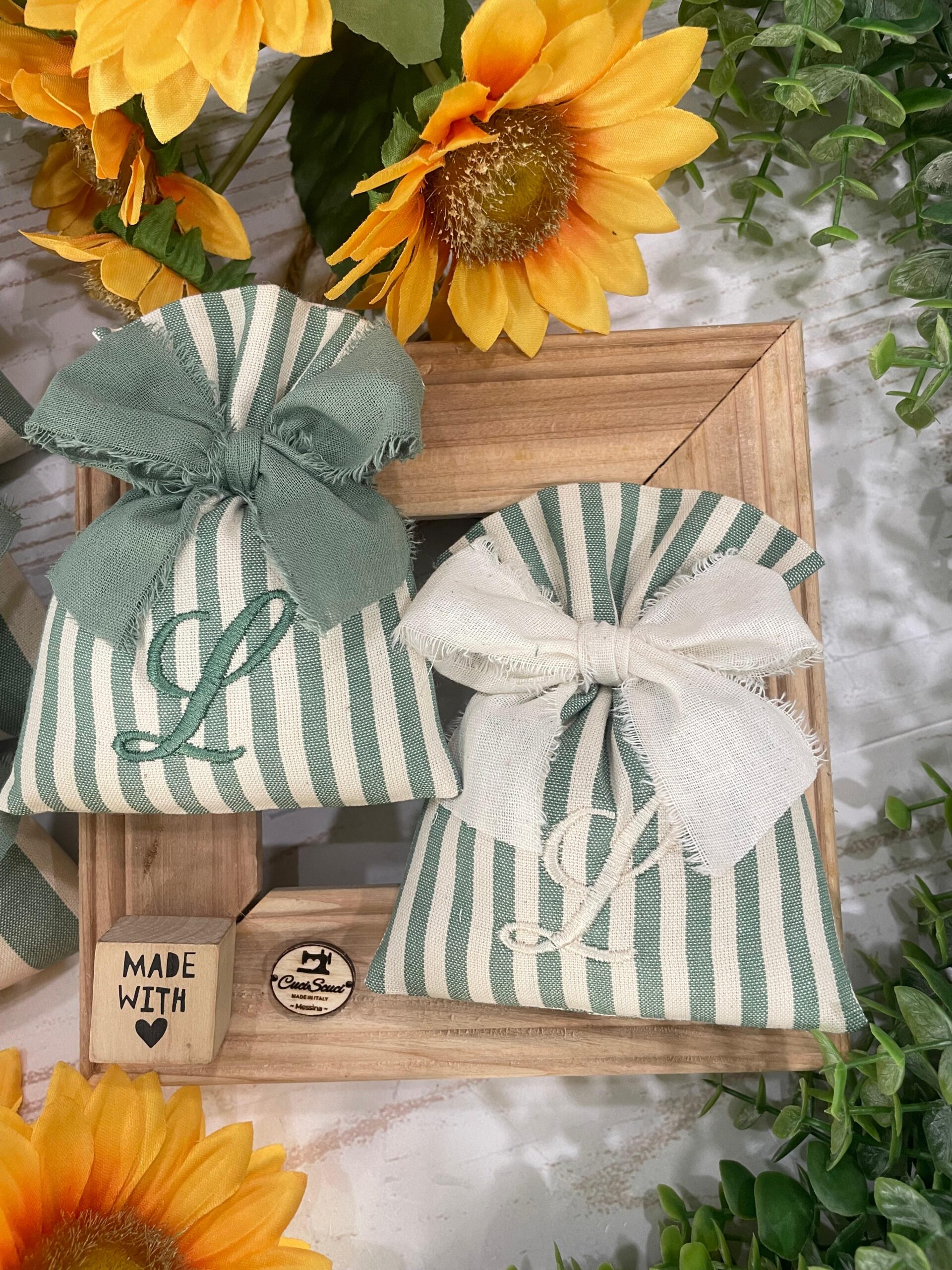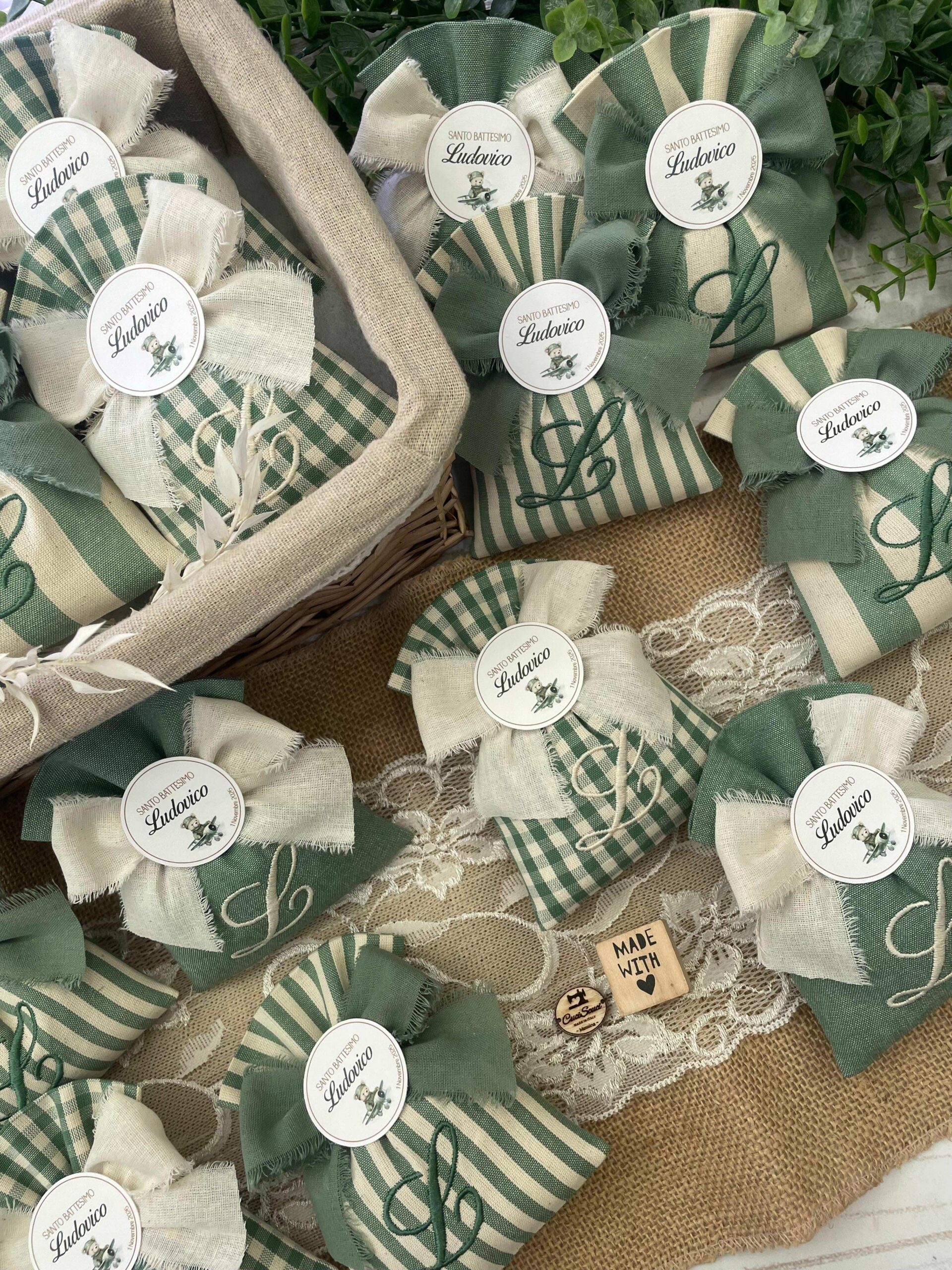 Un’elegante bomboniera artigianale, realizzata interamente a mano dalla nostra sartoria con passione e cura per i dettagli. Questo raffinato sacchetto in cotone tinto filo, nei delicati toni del verde e del panna, è impreziosito dal ricamo di un’iniziale, che lo rendono unico e speciale.