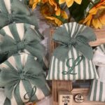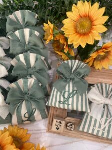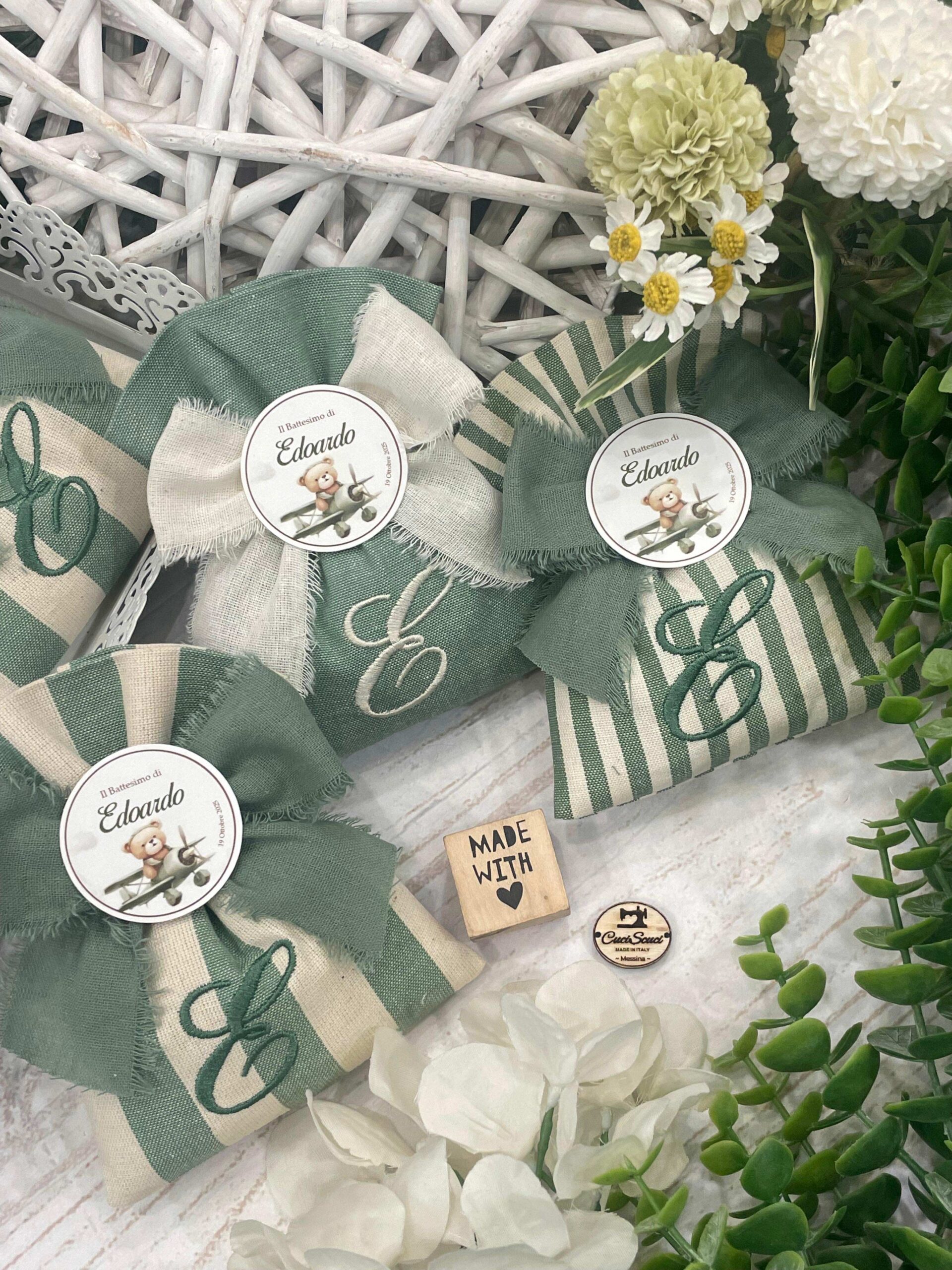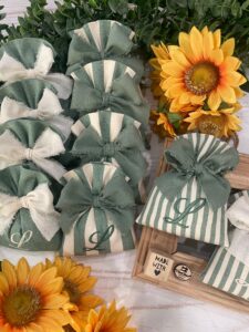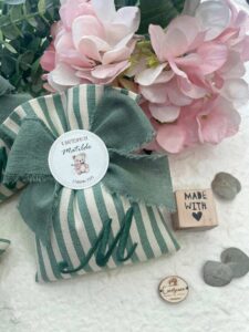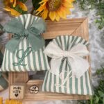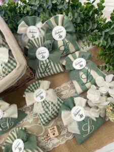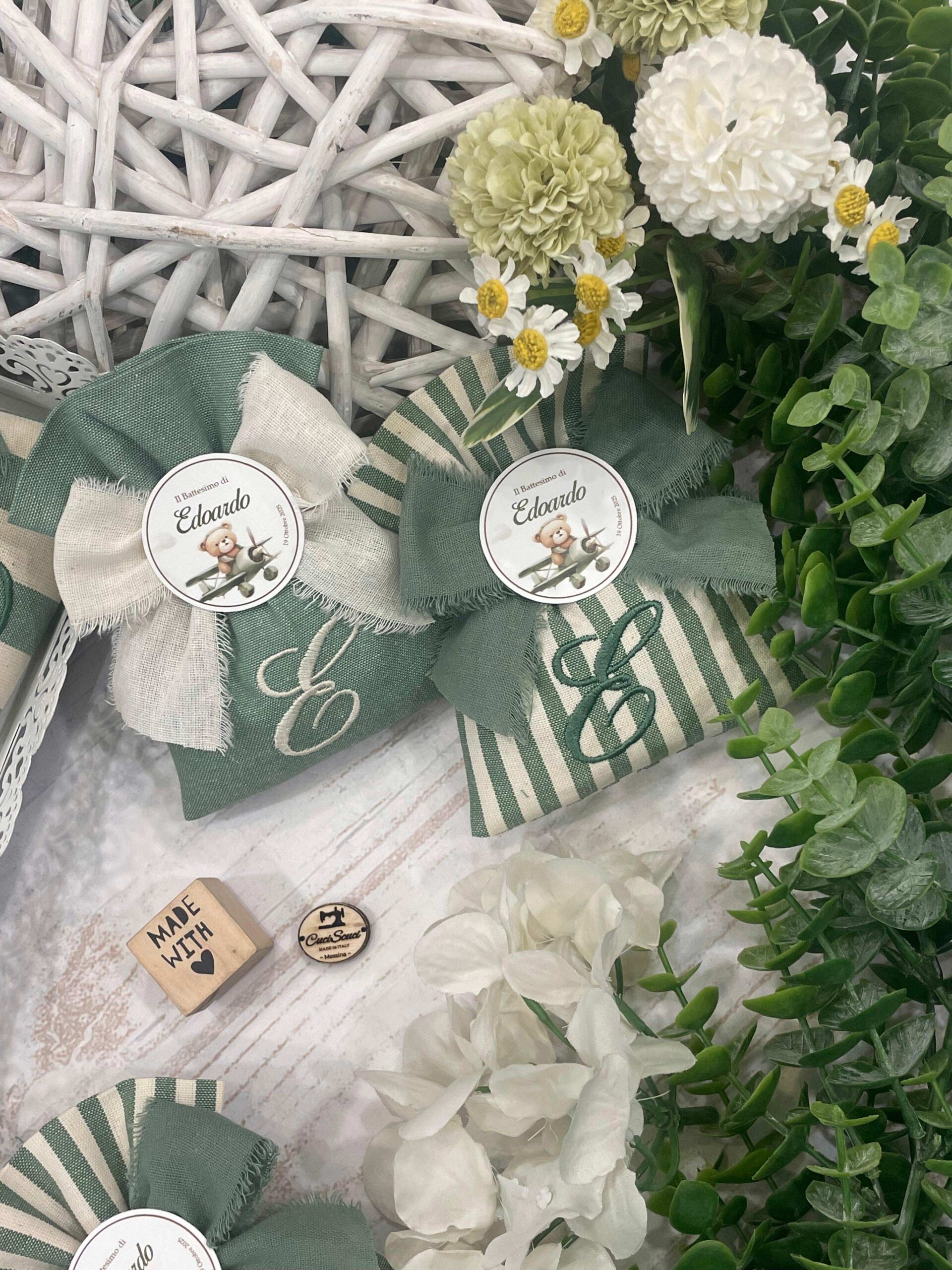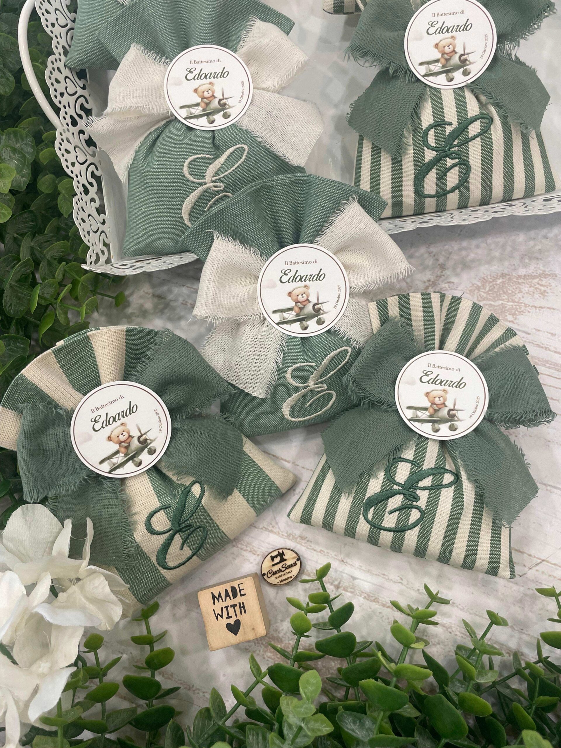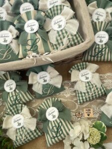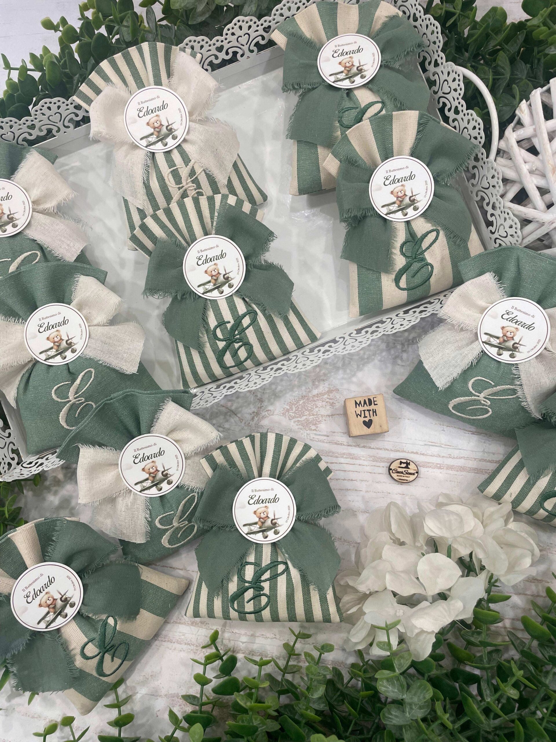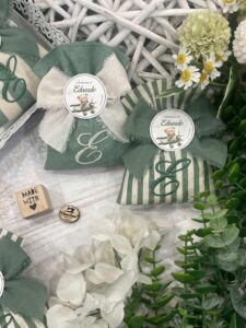 Un’elegante bomboniera artigianale, realizzata interamente a mano dalla nostra sartoria con passione e cura per i dettagli. Questo raffinato sacchetto in cotone tinto filo, nei delicati toni del verde e del panna, è impreziosito dal ricamo di un’iniziale, che lo rendono unico e speciale.