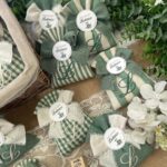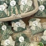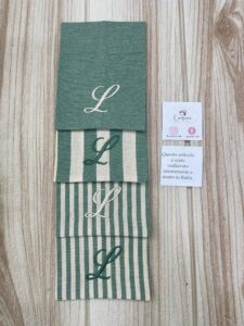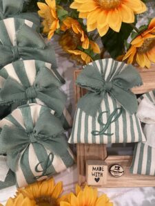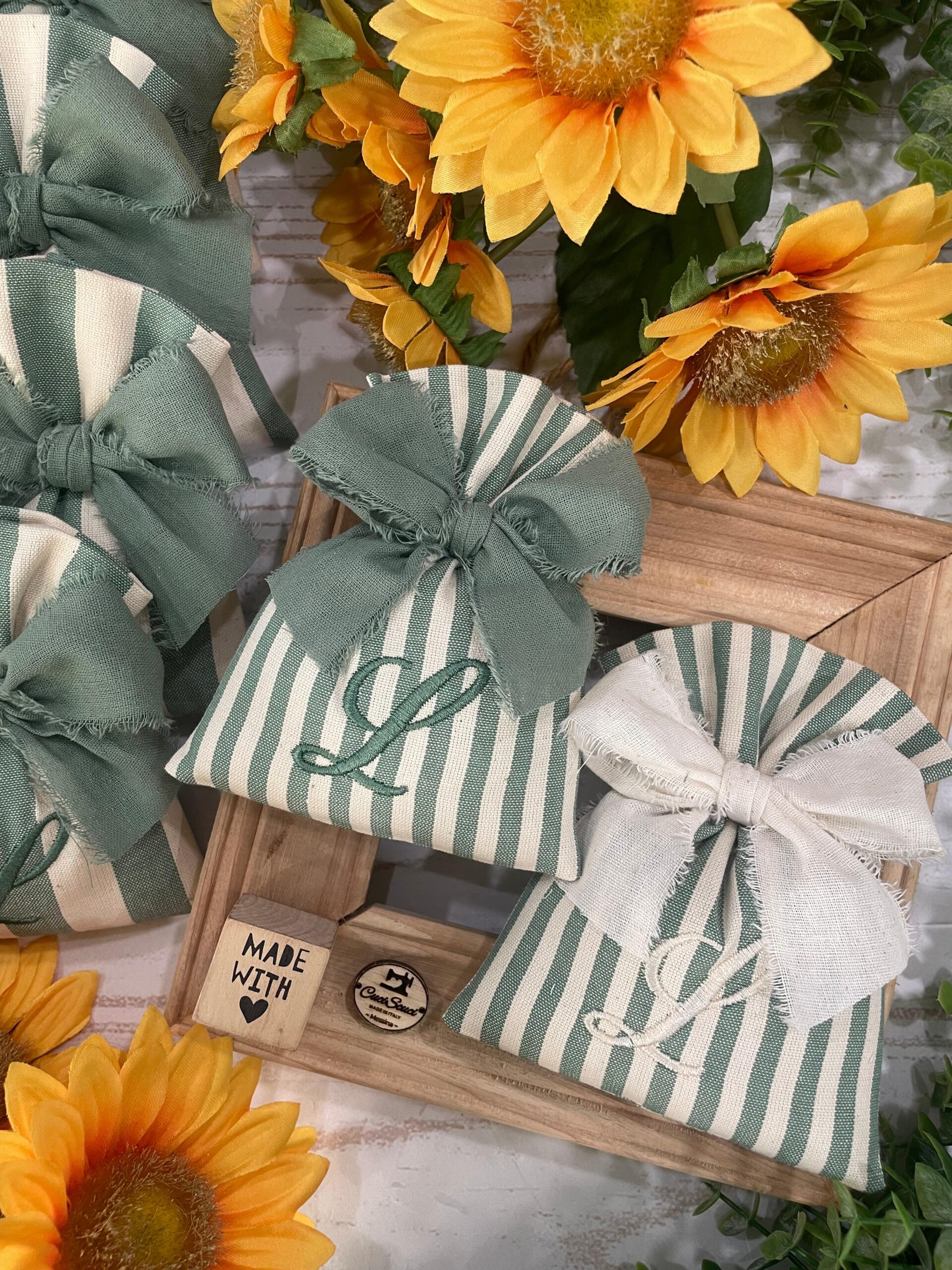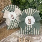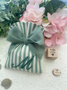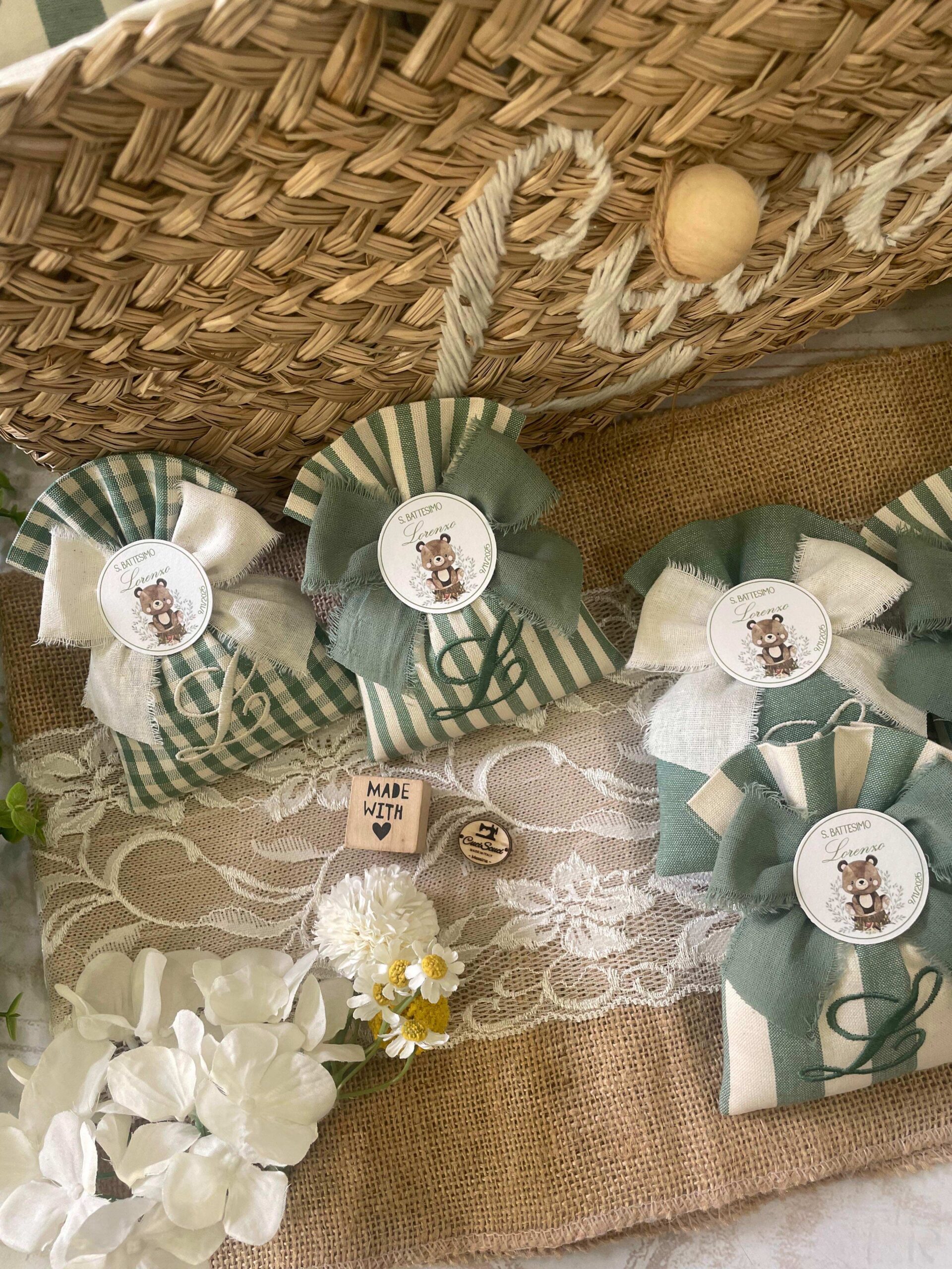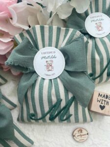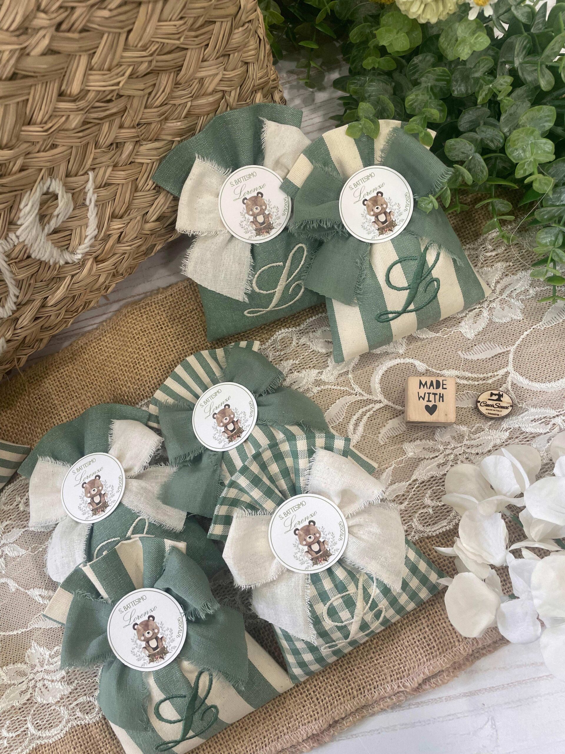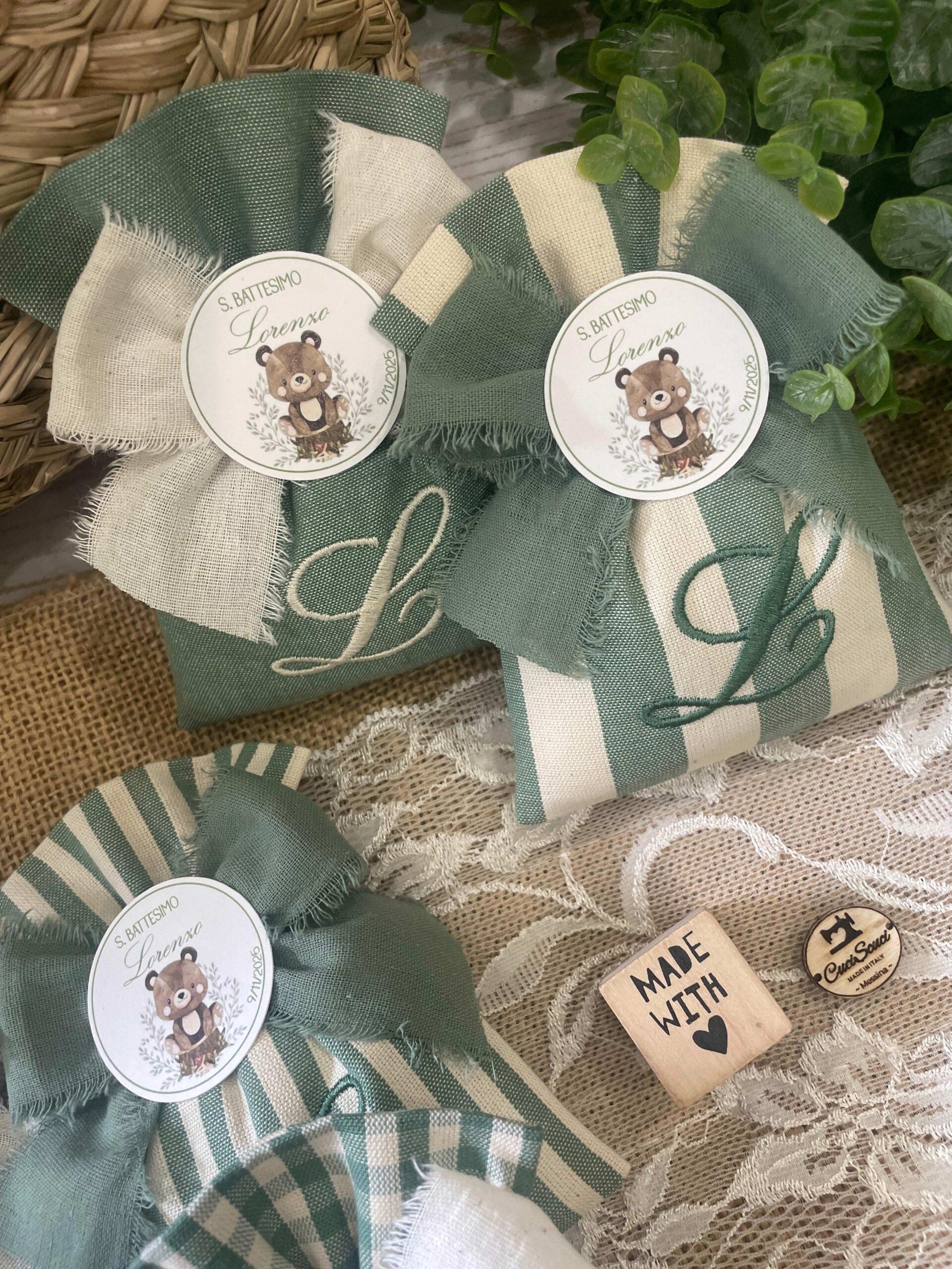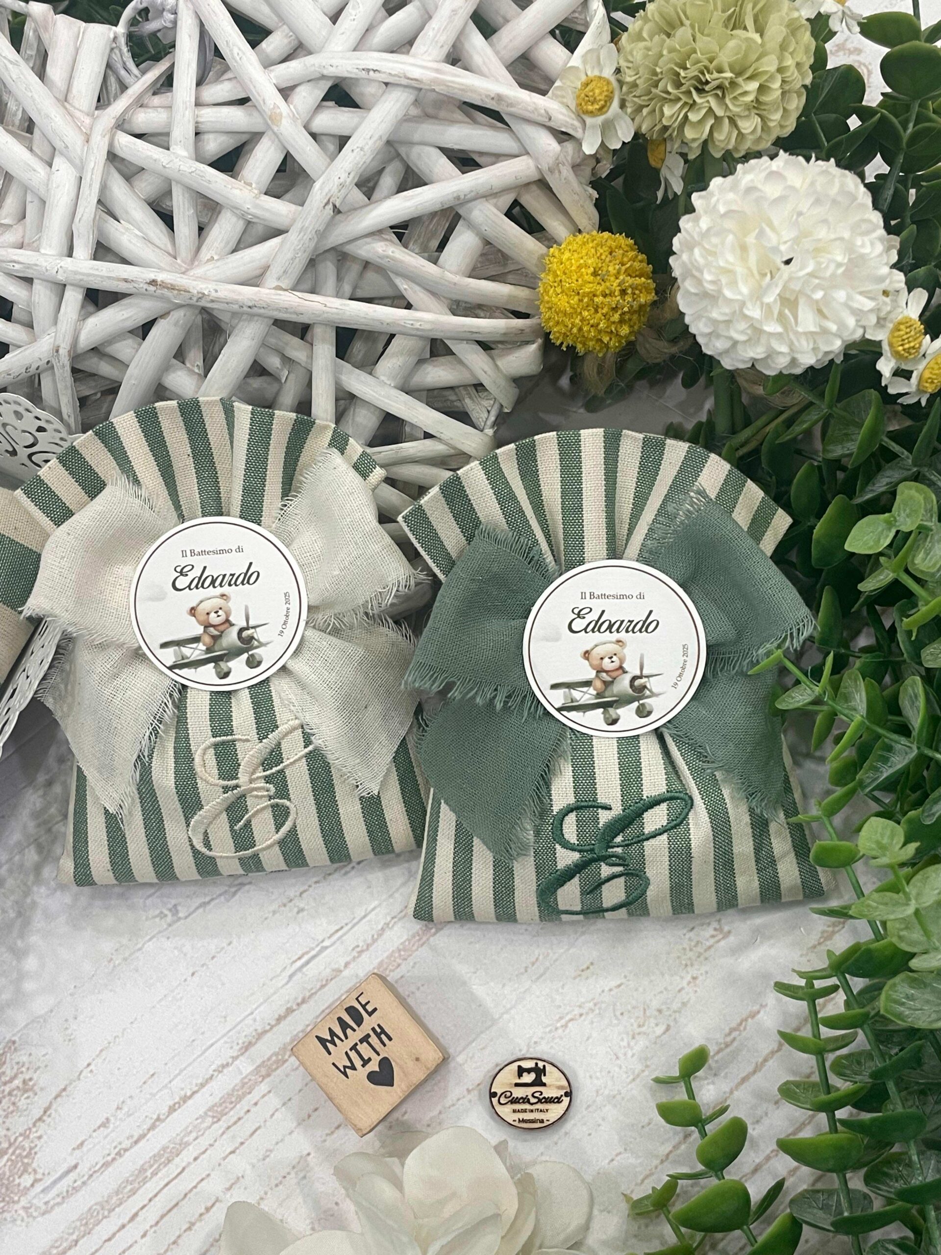 Un’elegante bomboniera artigianale, realizzata interamente a mano dalla nostra sartoria con passione e cura per i dettagli. Questo raffinato sacchetto in cotone tinto filo, nei delicati toni del verde e del panna, è impreziosito dal ricamo di un’iniziale, che lo rendono unico e speciale.