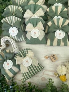Questo sacchetto in cotone tinto filo è disponibile in fantasie assortite (o a scelta) nei delicati toni del verde, per un dono raffinato e originale.