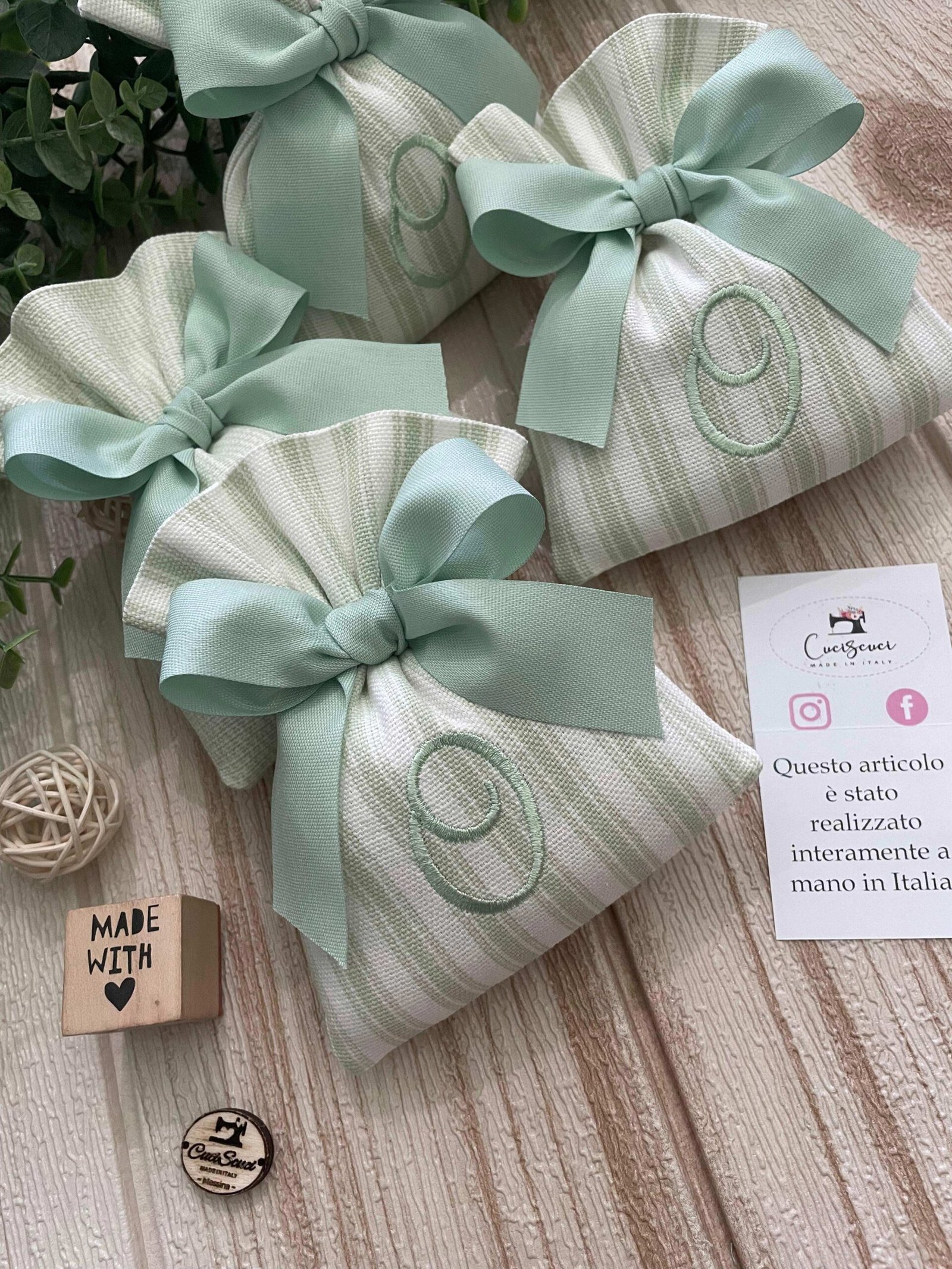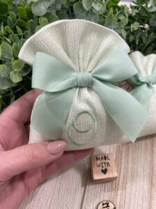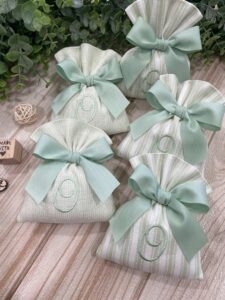 Un’elegante bomboniera, realizzata interamente a mano dalla nostra sartoria con cura e passione per i dettagli. Questo sacchetto in cotone panama è disponibile in fantasie assortite (o a scelta) nei delicati toni del verde pastello, impreziosito dal ricamo personalizzato di un’iniziale.