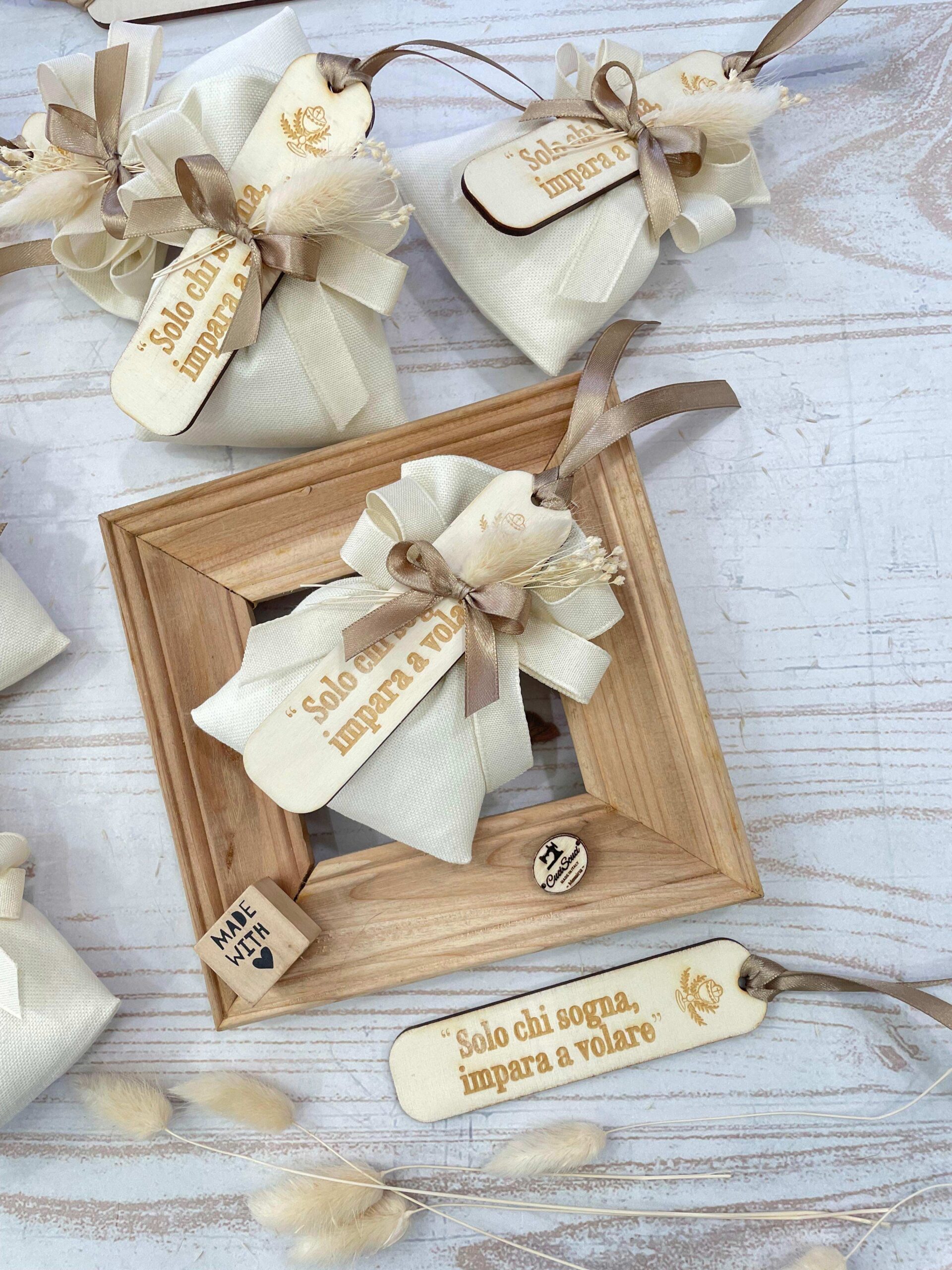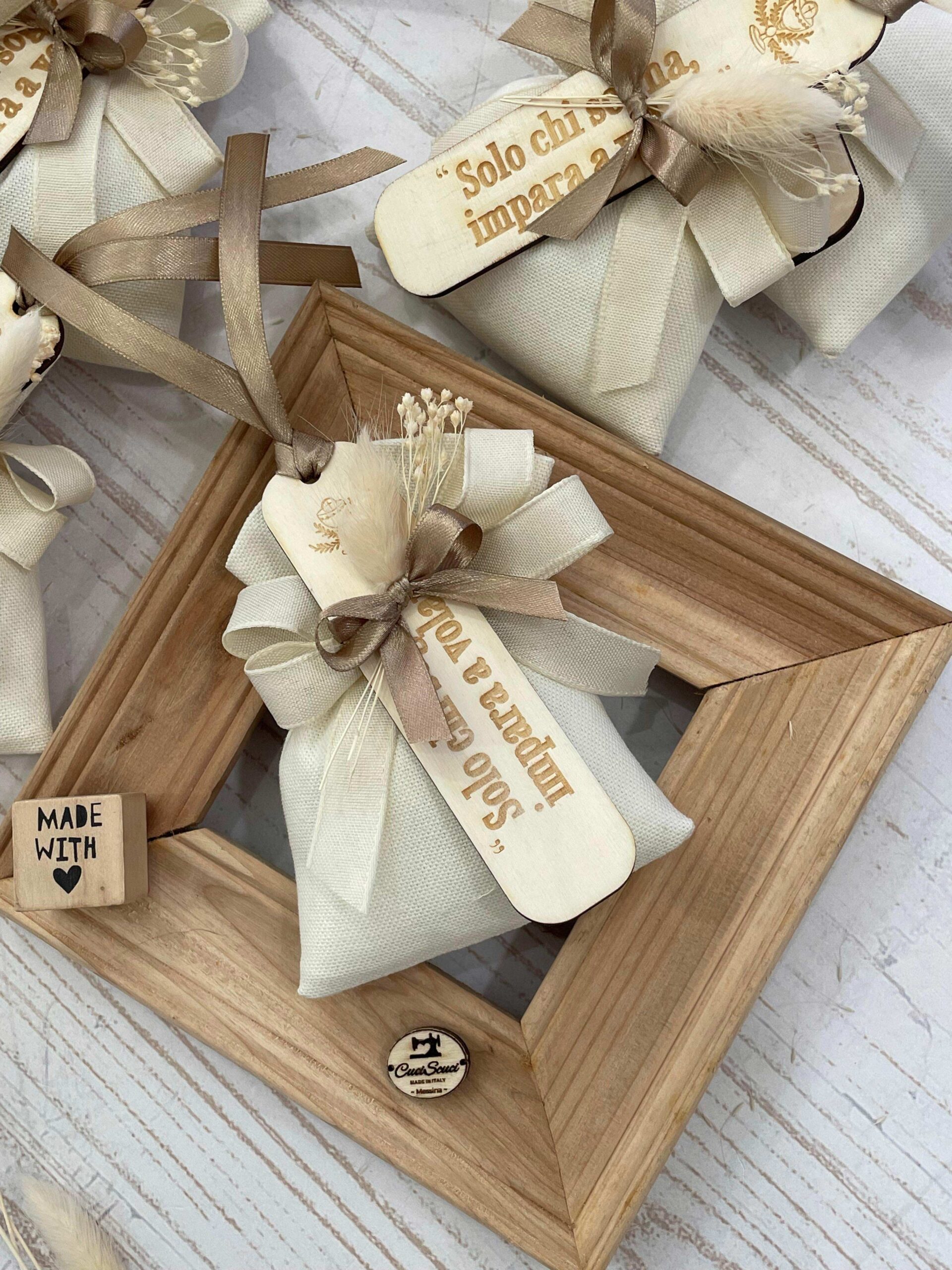 Un’elegante bomboniera sartoriale, realizzata interamente a mano con amore e cura per i dettagli.