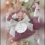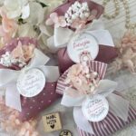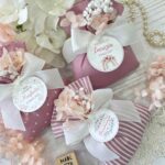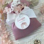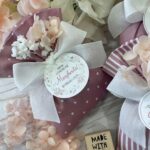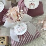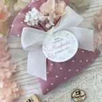 • Confezionato – bomboniera completa e pronta da donare, con sacchetto rifinito, fiocco abbinato, 5 confetti in busta sigillata e composizione floreale in coordinato