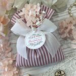 Il rigatino di cotone nei delicati toni del rosa antico si unisce alla grazia dei fiori di ortensia e gypsophila, dando vita a una bomboniera raffinata e romantica.