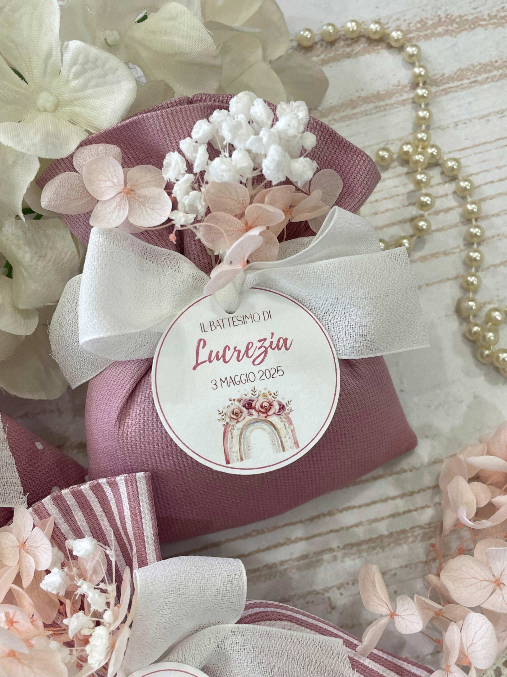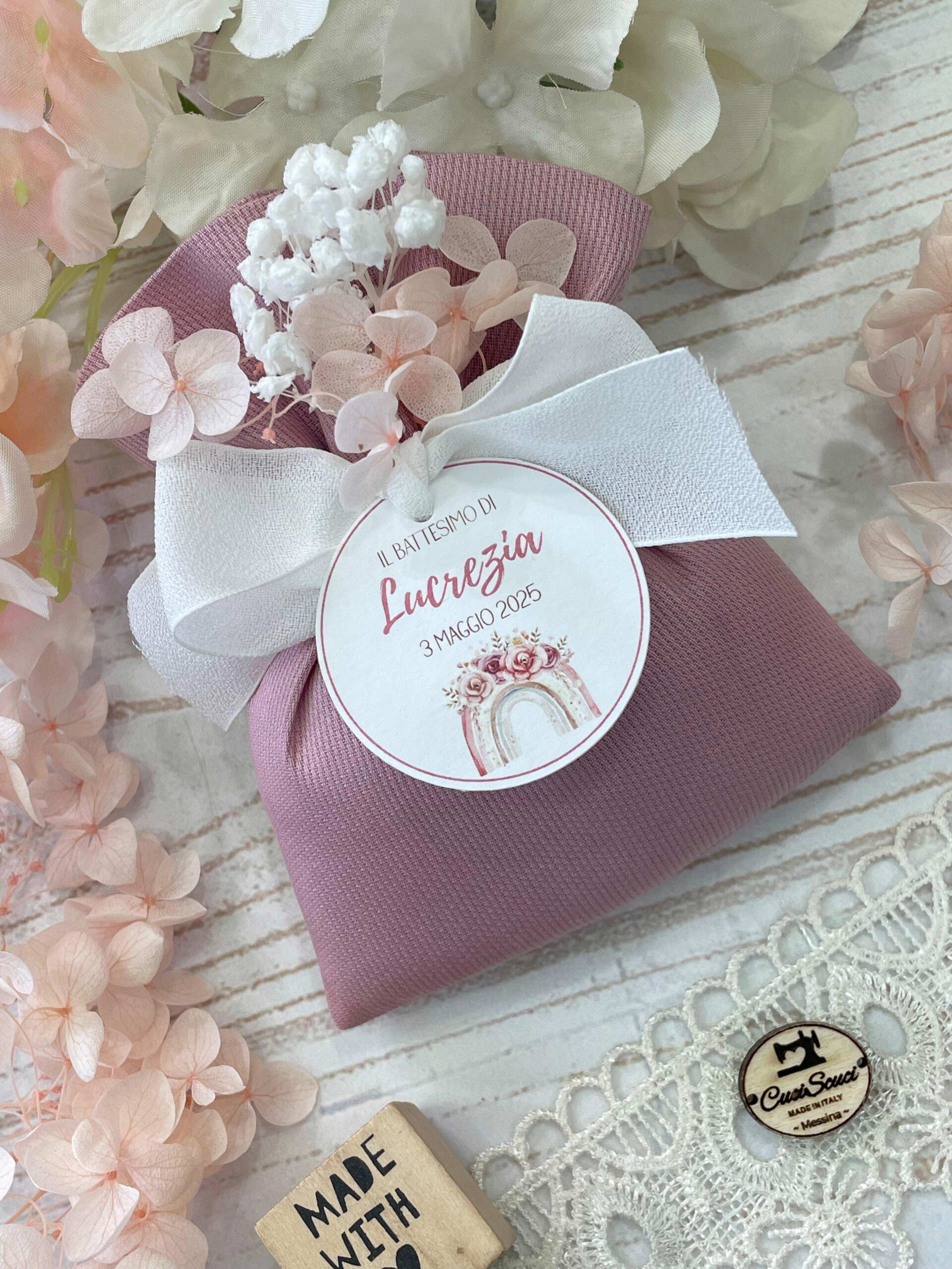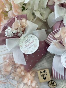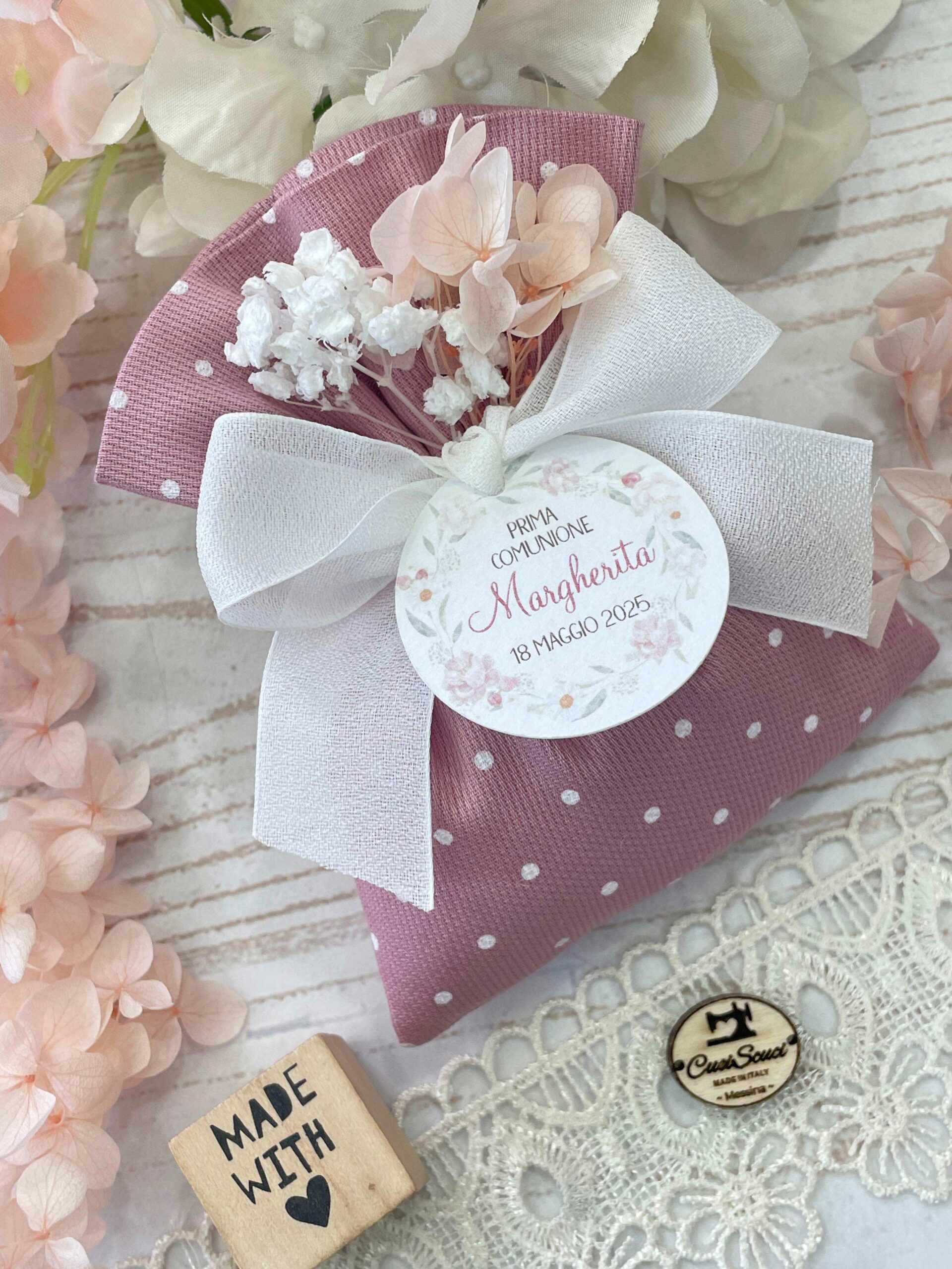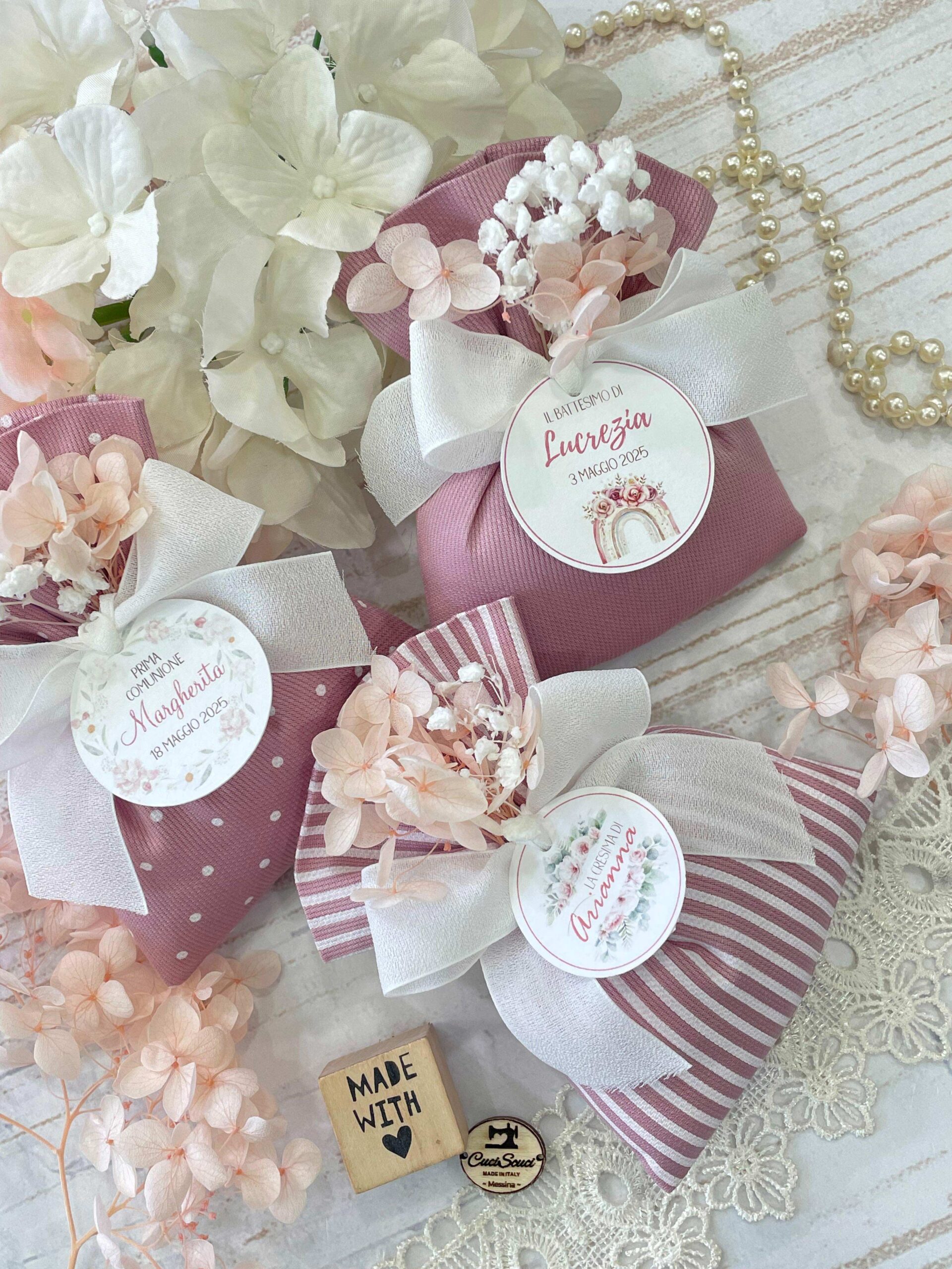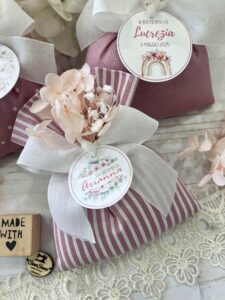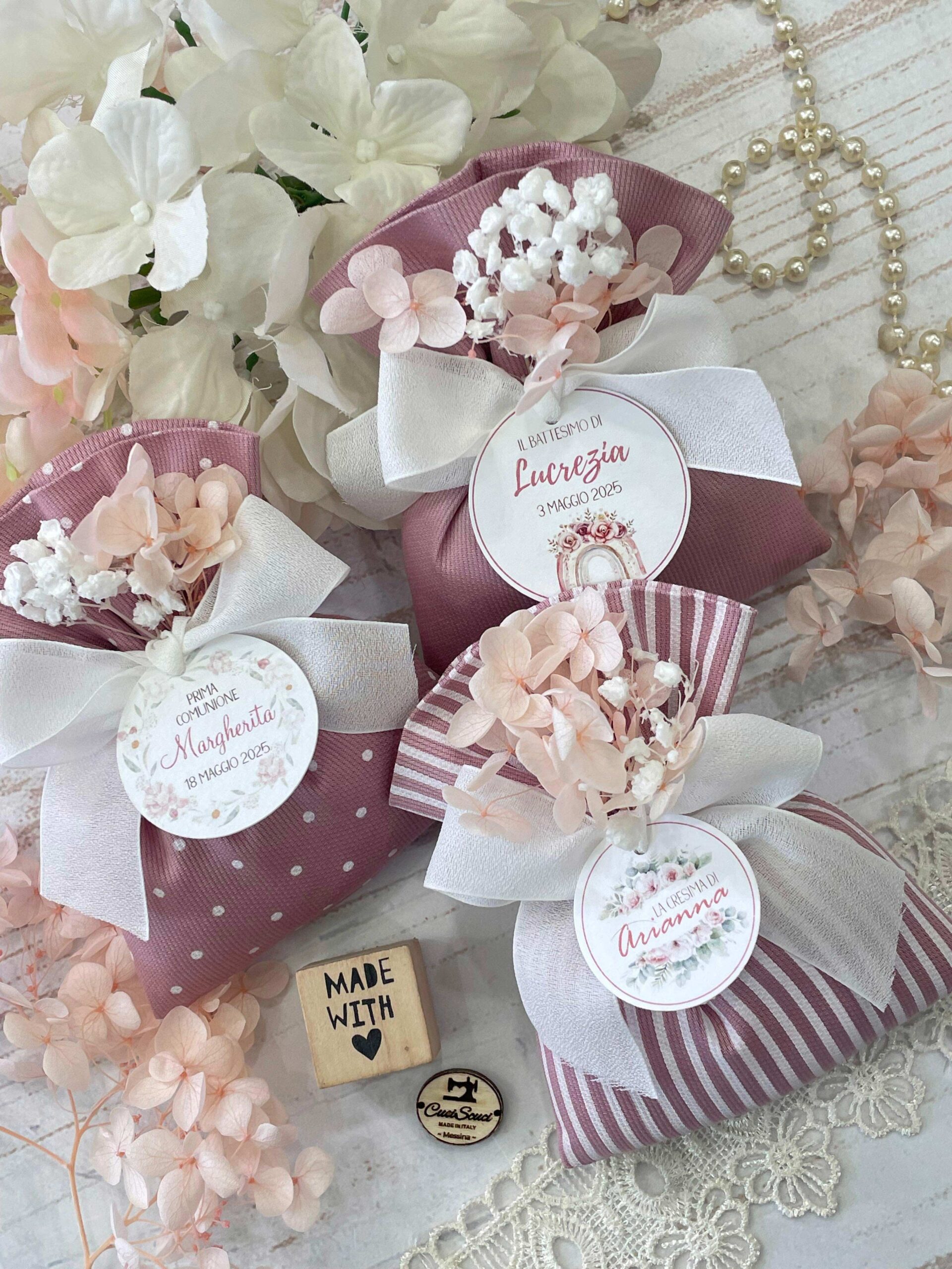 • Confezionato – bomboniera completa e pronta da donare, con sacchetto rifinito, fiocco abbinato, 5 confetti in busta sigillata e composizione floreale in coordinato