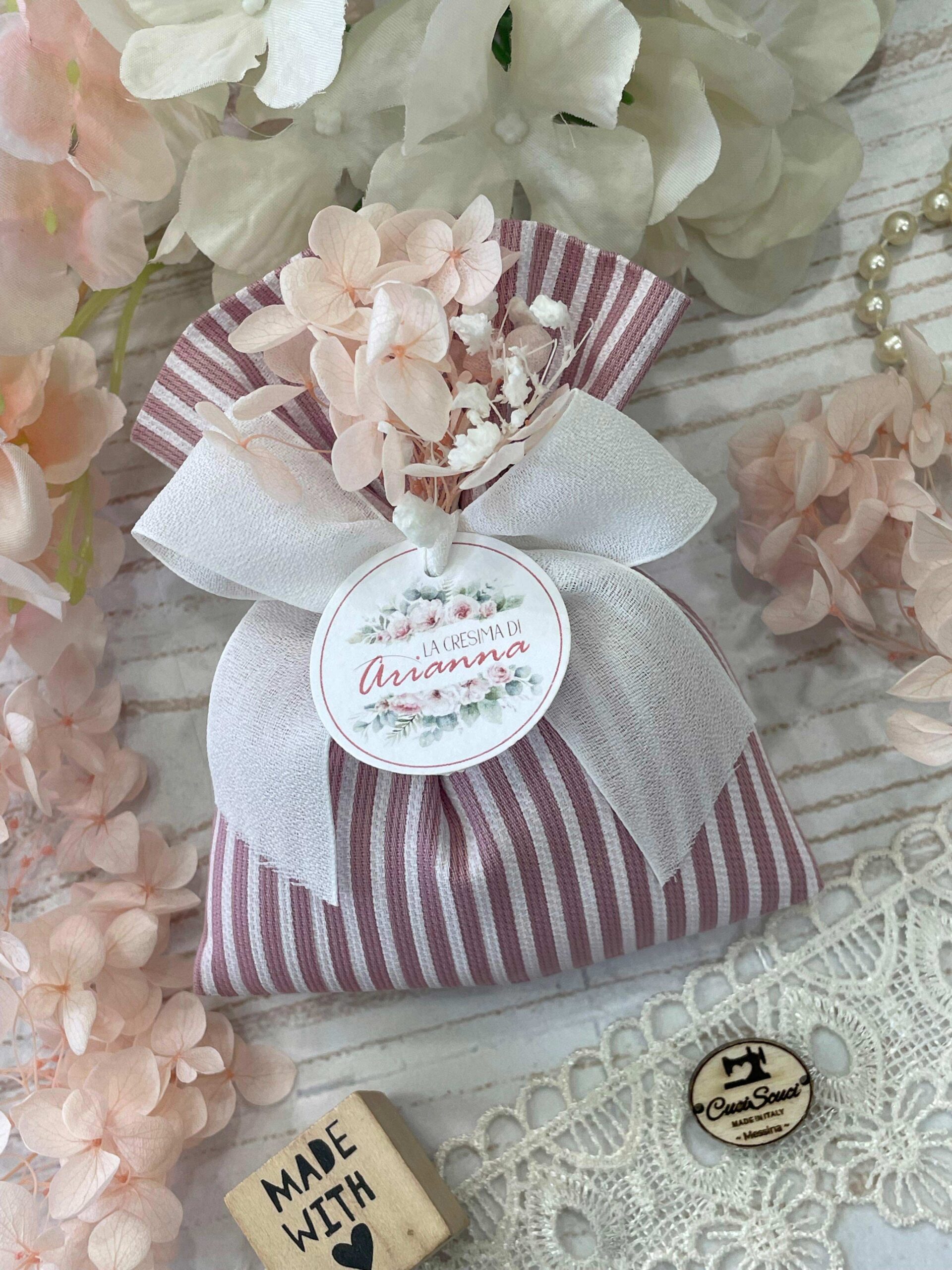 ✨ Sacchetto Artigianale in Rigatino di Cotone Rosa Antico con Fiori di Ortensia e Gypsophila ✨