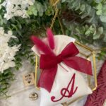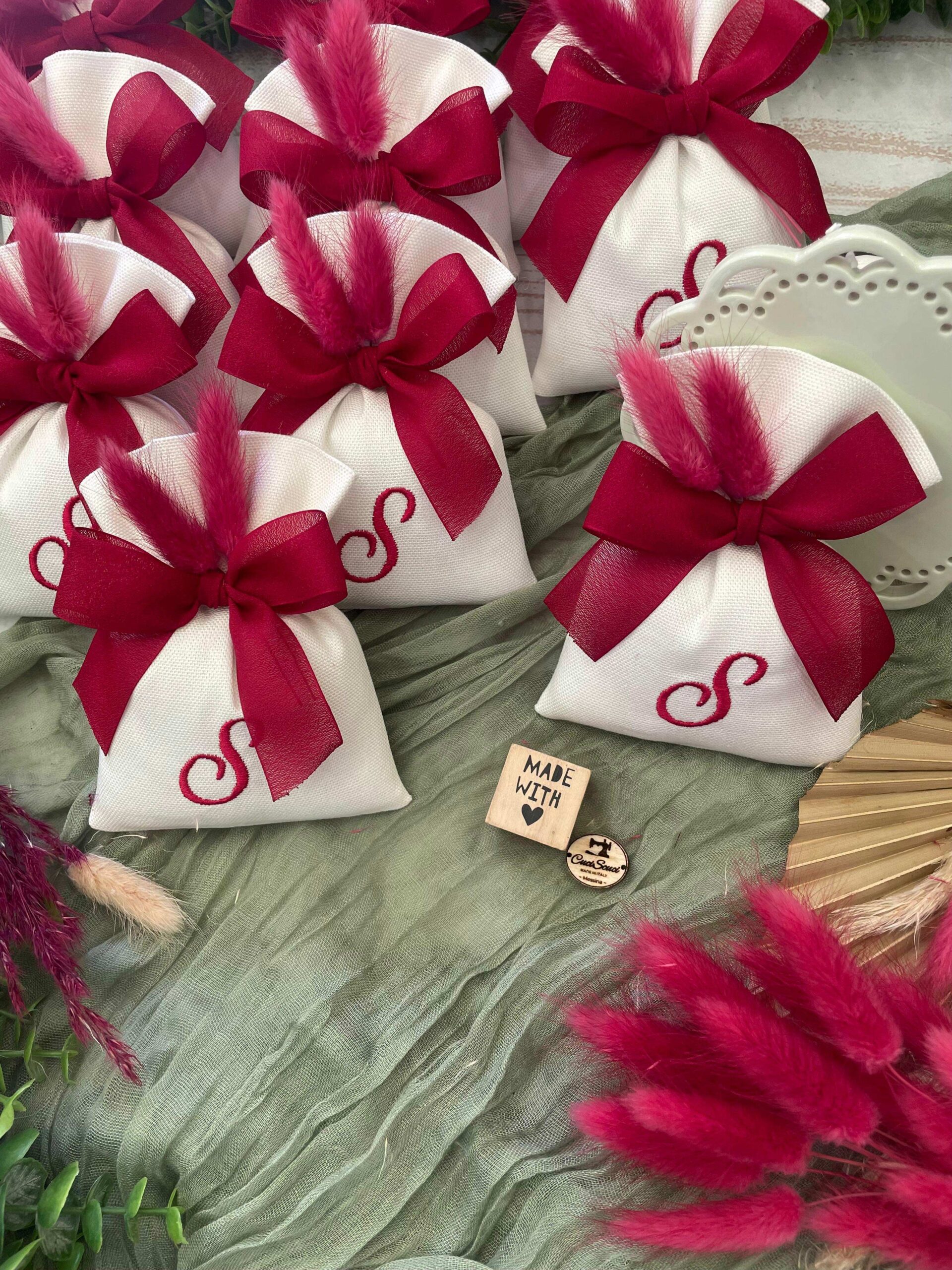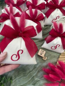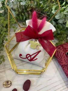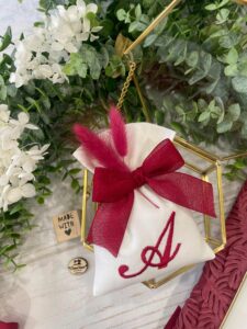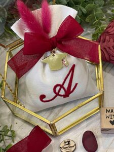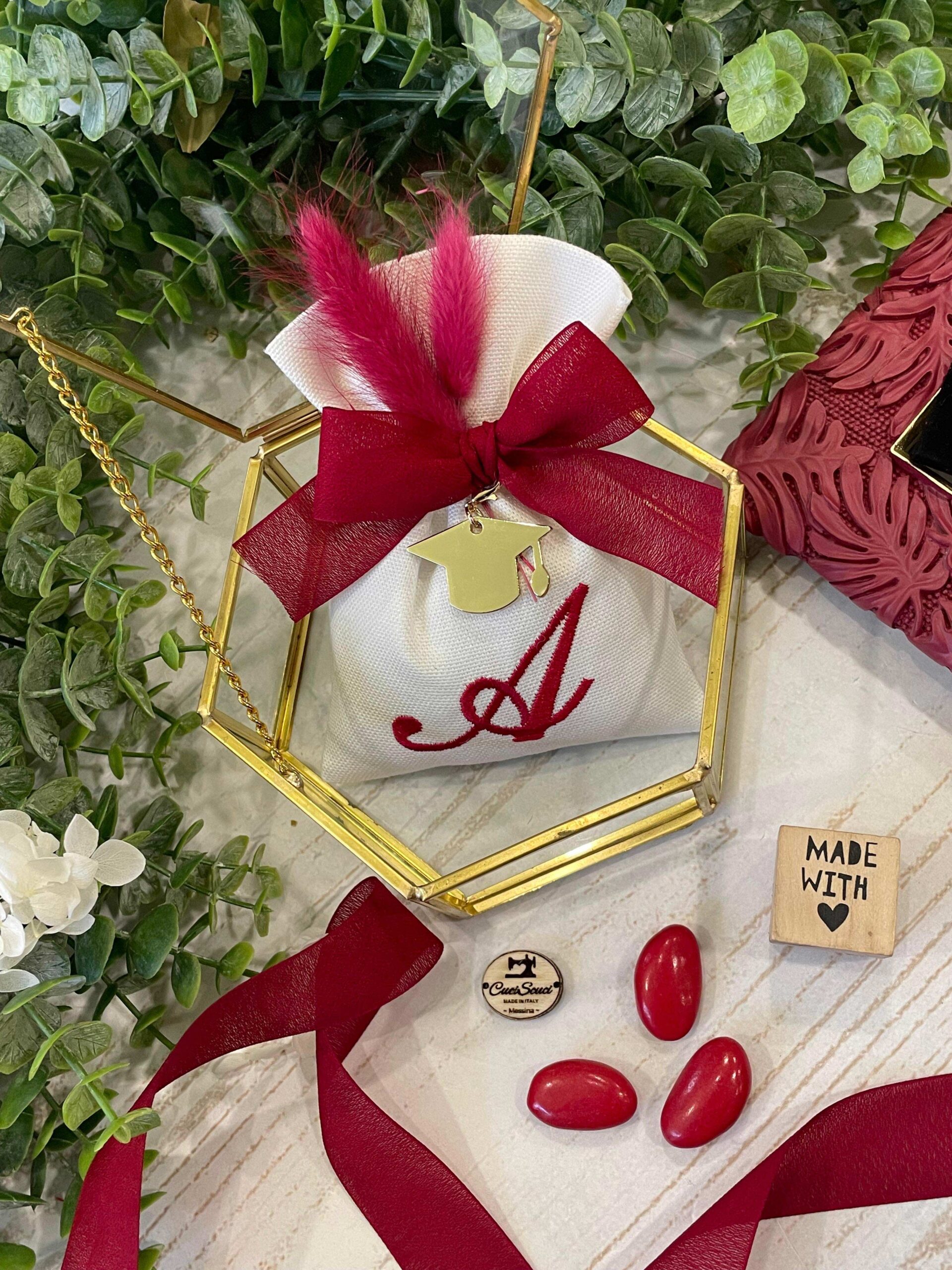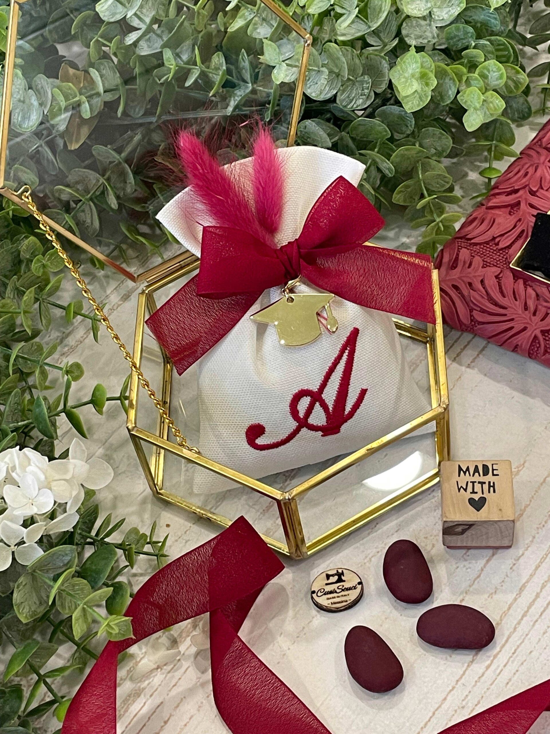 Un sacchetto artigianale elegante e curato nei dettagli, realizzato con cotone panama color seta e arricchito da un ricamo con iniziale rossa. Le codine di volpe conferiscono un tocco raffinato e scenografico, mentre il ciondolo laurea — opzionale — aggiunge un dettaglio simbolico perfetto per celebrare questo importante traguardo.