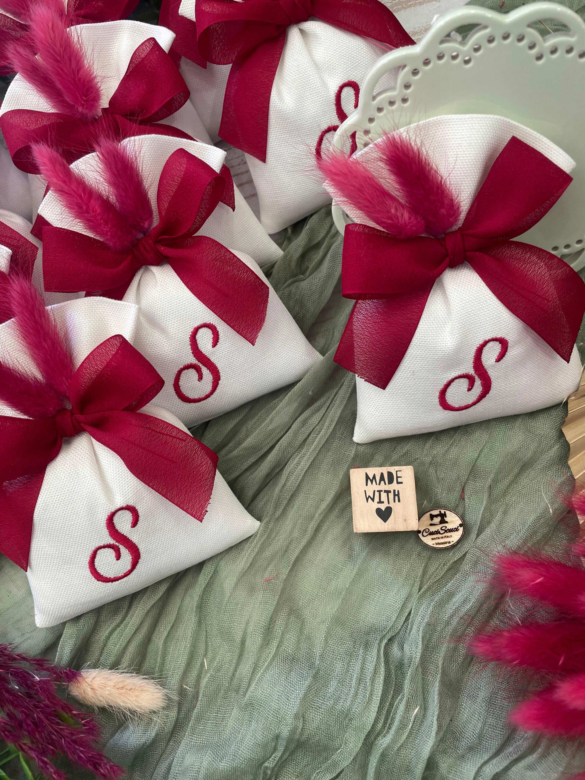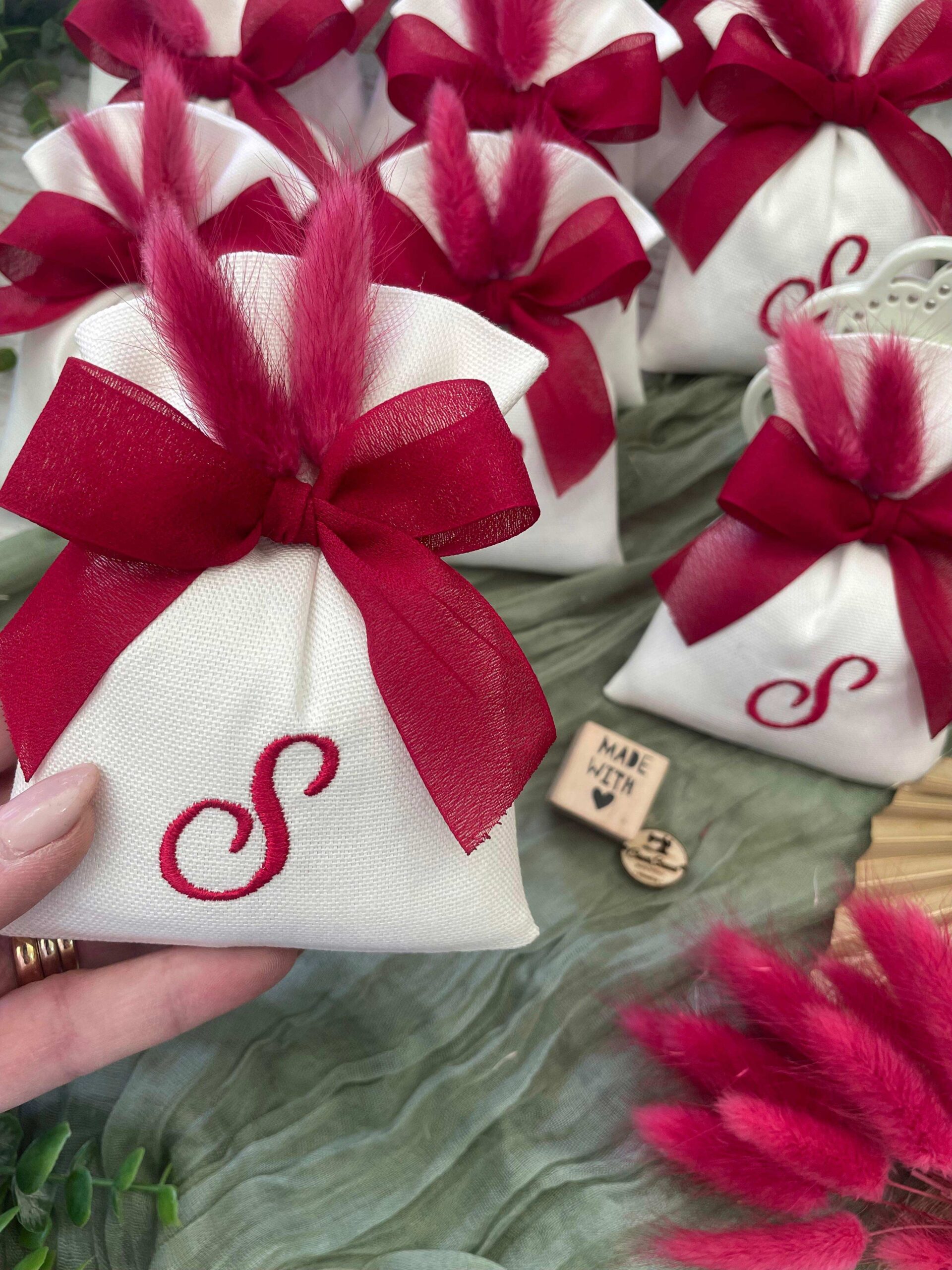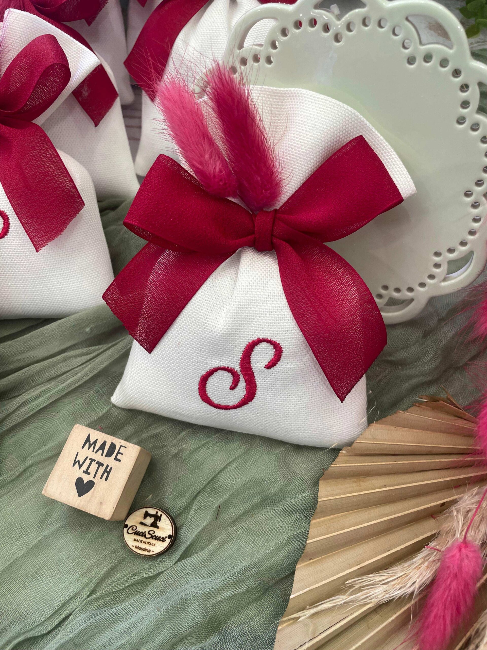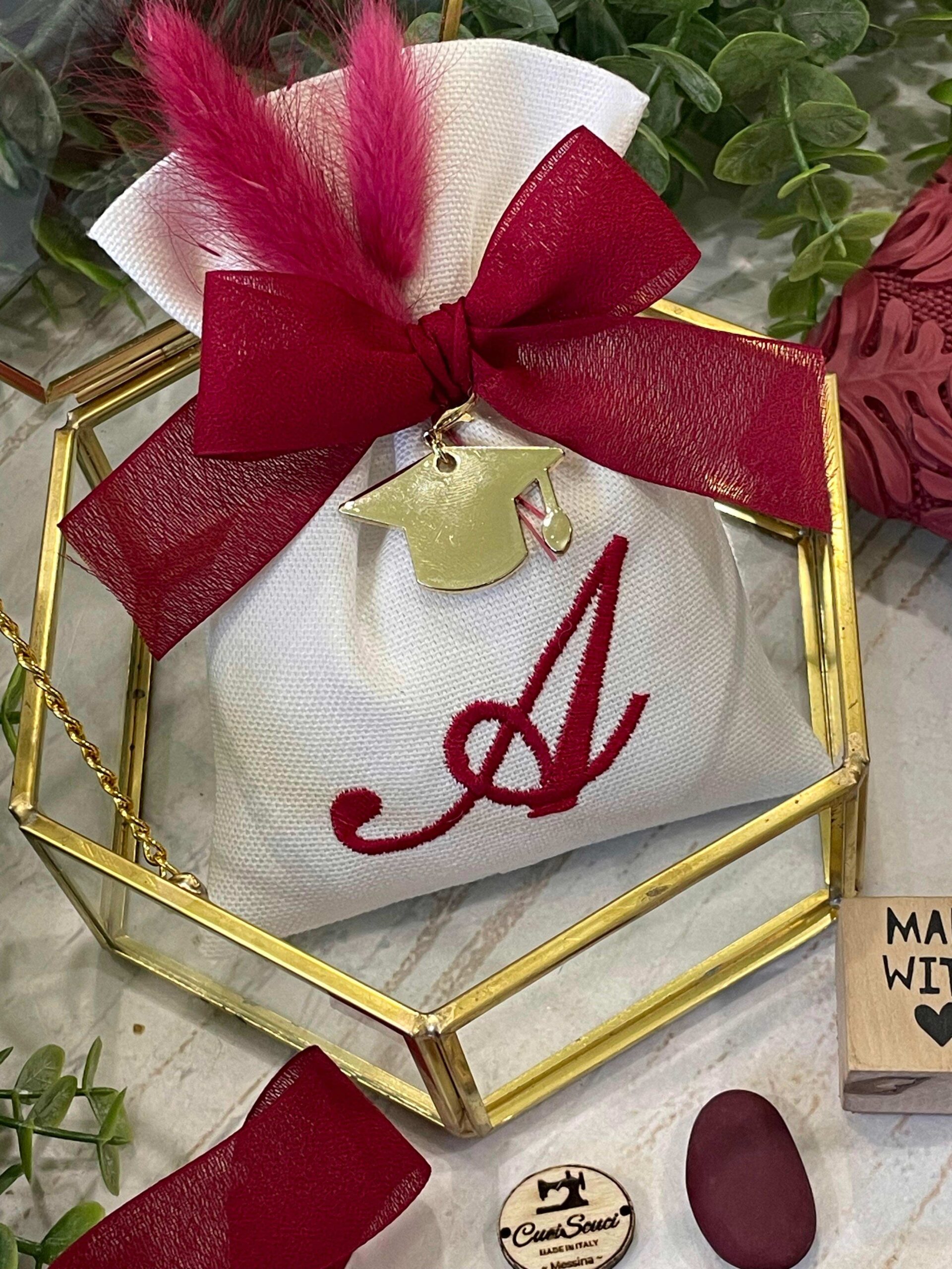 Sacchetto Artigianale in Cotone Seta con Iniziale Rossa, Codine di Volpe e Ciondolo Laurea