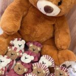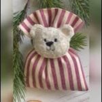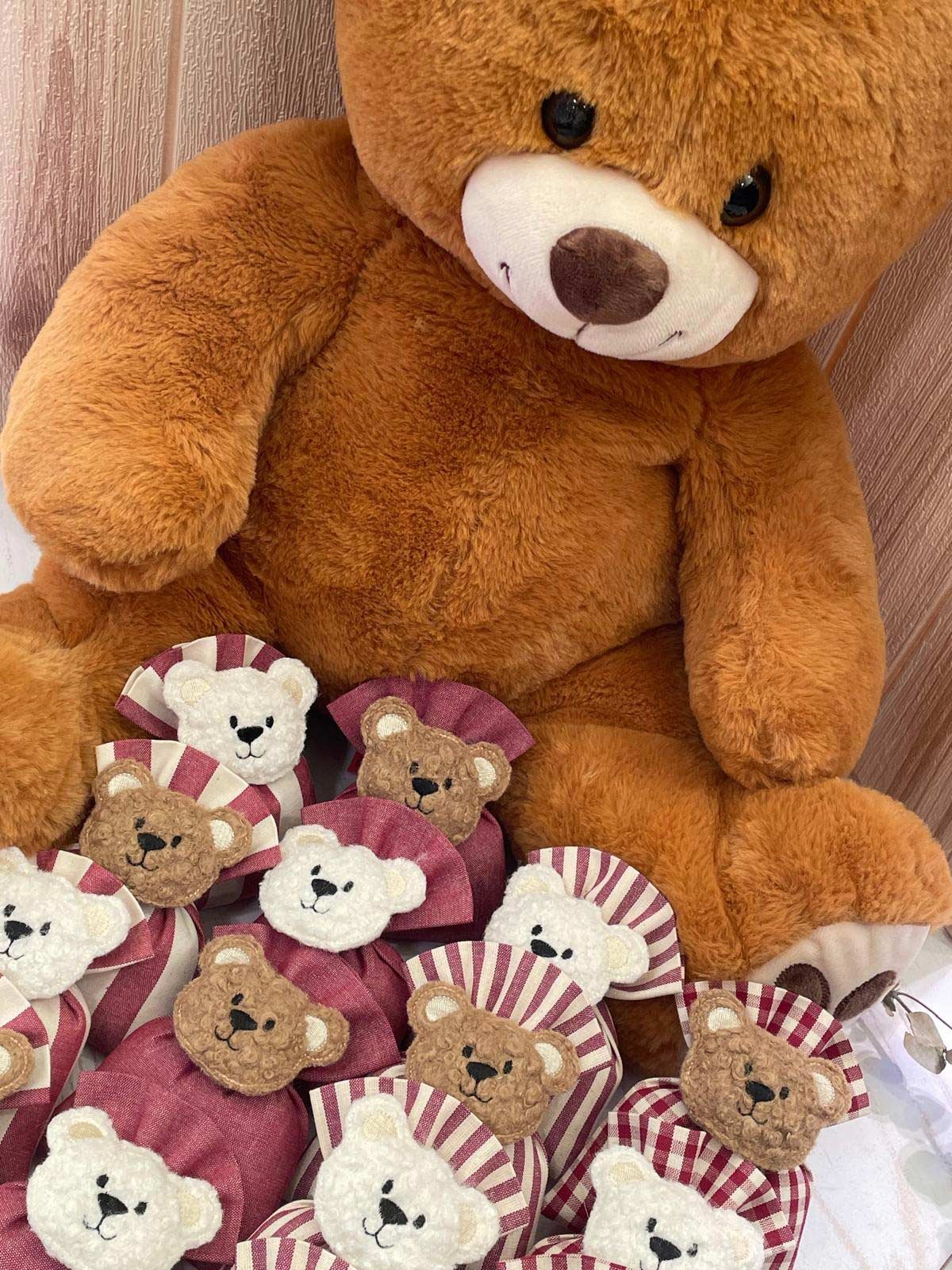 Confezionato: bomboniera pronta da donare, con imbottitura in ovatta, fiocco abbinato, 5 confetti sigillati e applicazione dell’orsetto.
