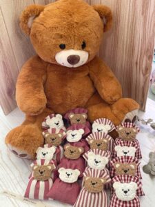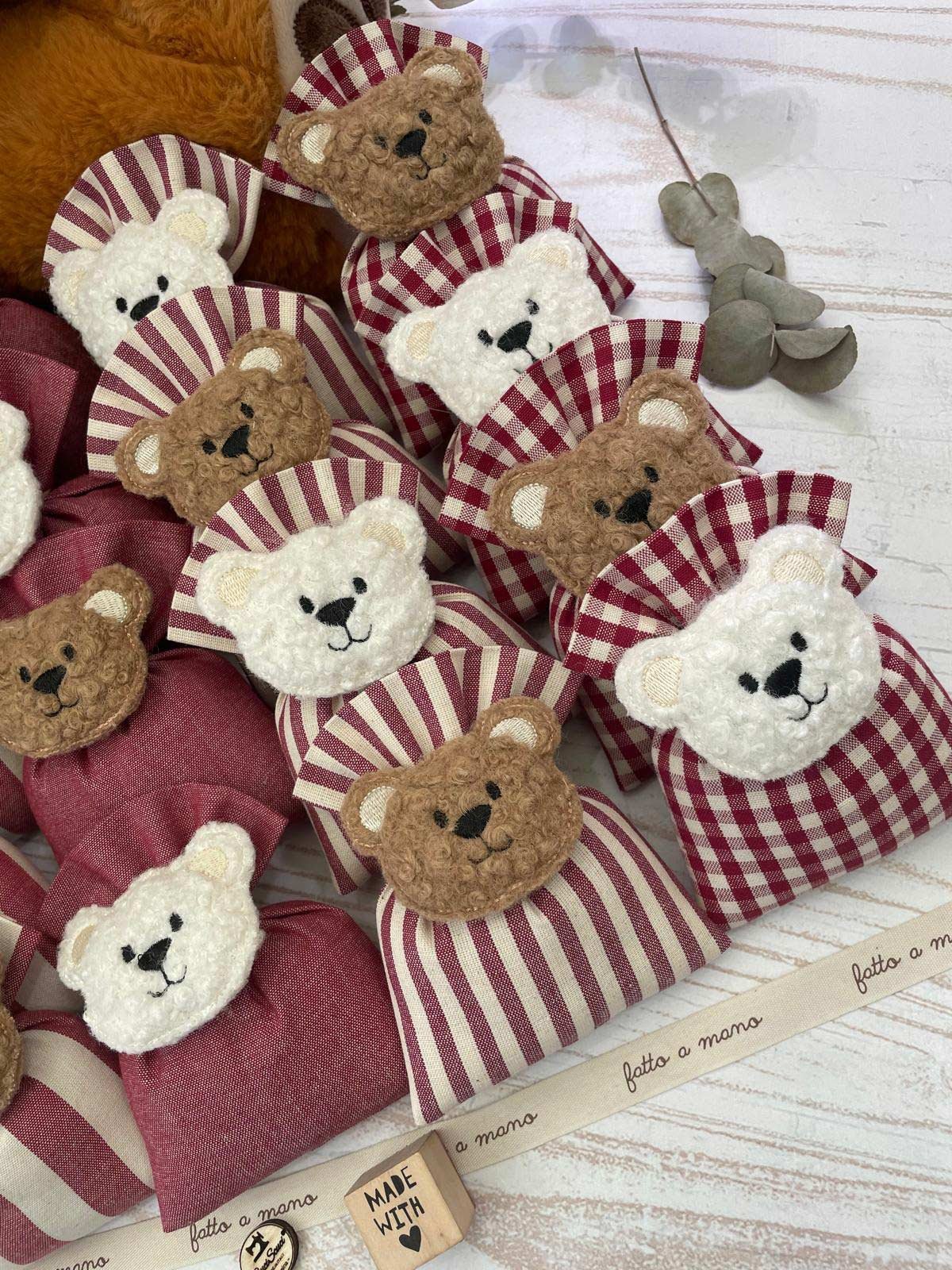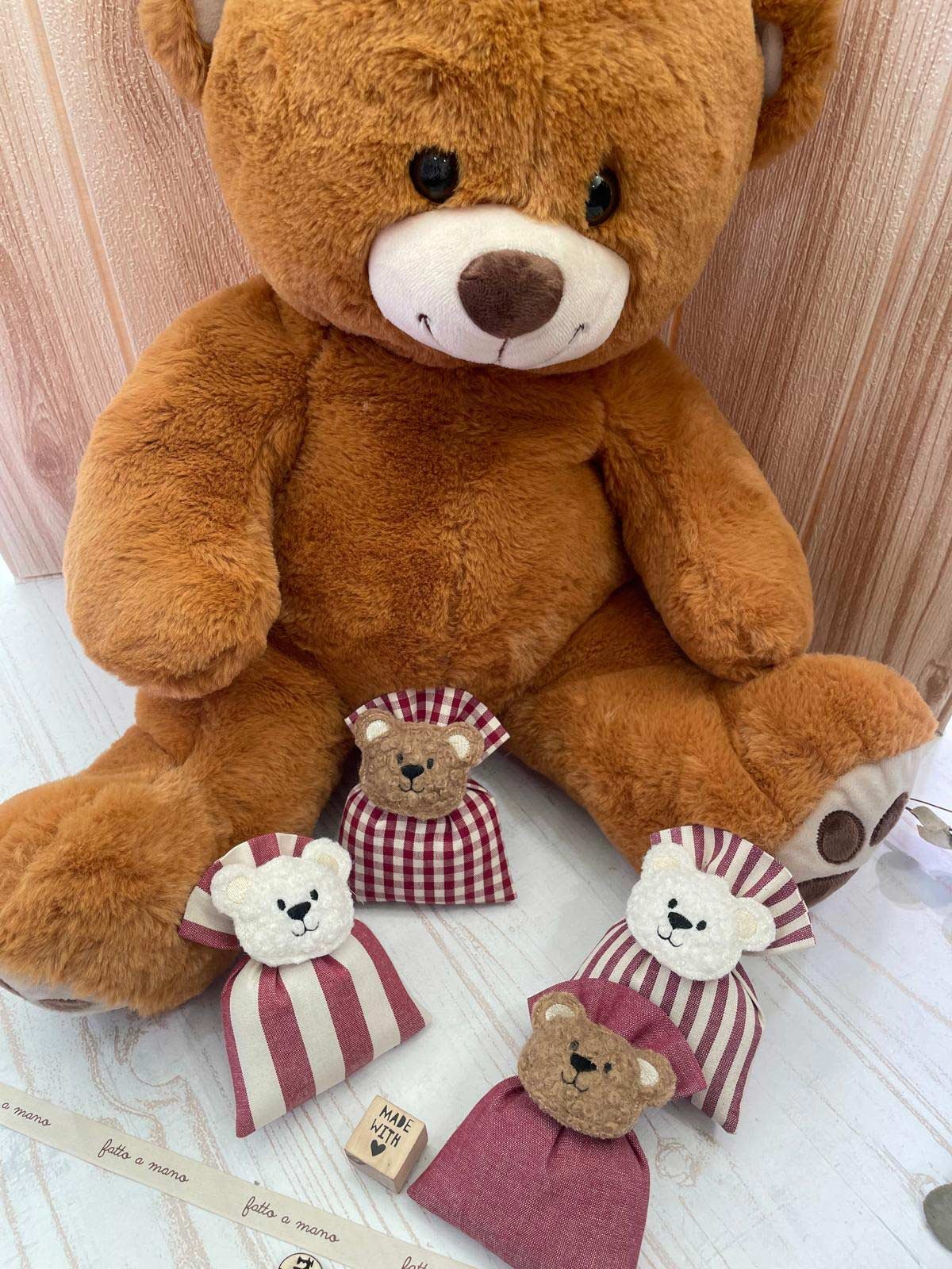 • Confezionato: bomboniera pronta da donare, con imbottitura in ovatta, fiocco abbinato, 5 confetti sigillati e applicazione dell’orsetto.