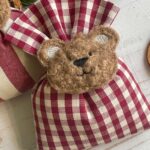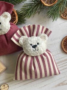 Questo sacchetto in cotone tinto filo nei delicati toni dell’amarena è impreziosito dall’applicazione di un orsetto calamita in tessuto bouclè, disponibile nei colori marrone o bianco, rendendolo un dono unico e speciale.