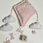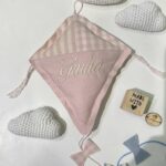 Creato in cotone tinto filo nei delicati toni del rosa cipria, con il nome della bimba ricamato, è una bomboniera elegante e raffinata, ideale per celebrare con dolcezza i momenti più speciali.