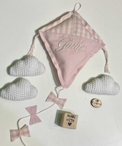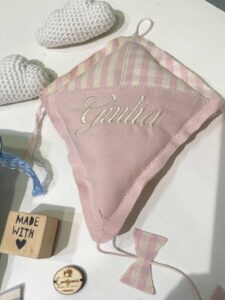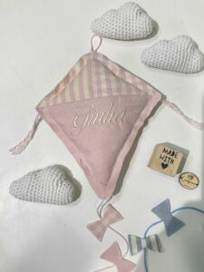Creato in cotone tinto filo nei delicati toni del rosa cipria, con il nome della bimba ricamato, è una bomboniera elegante e raffinata, ideale per celebrare con dolcezza i momenti più speciali.