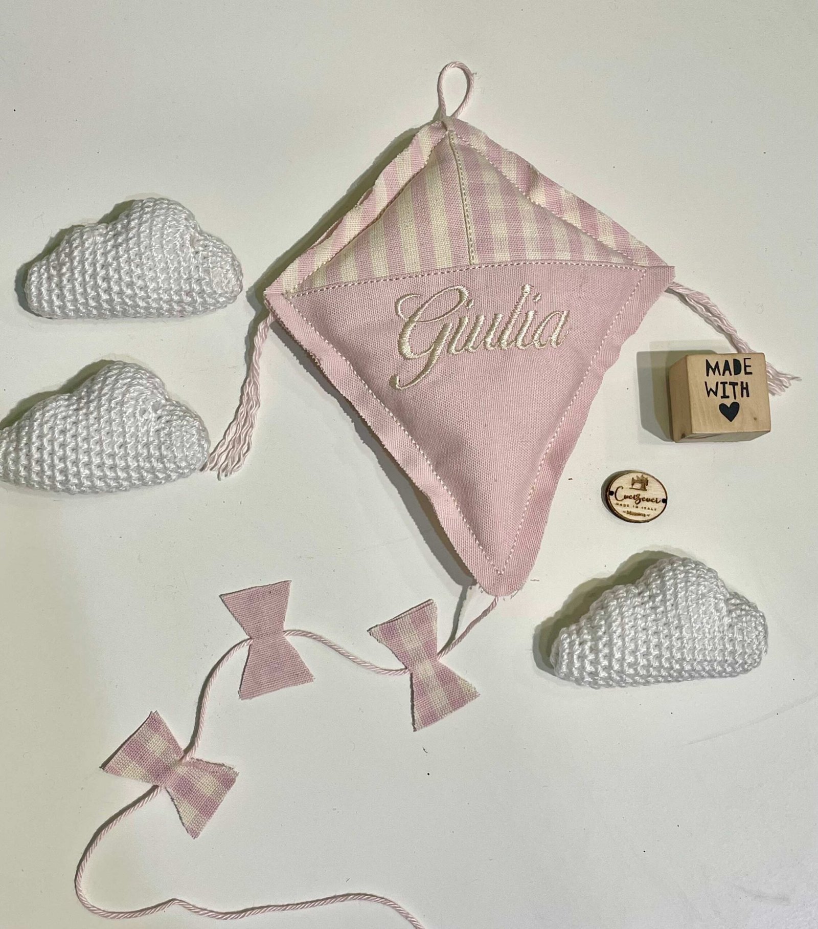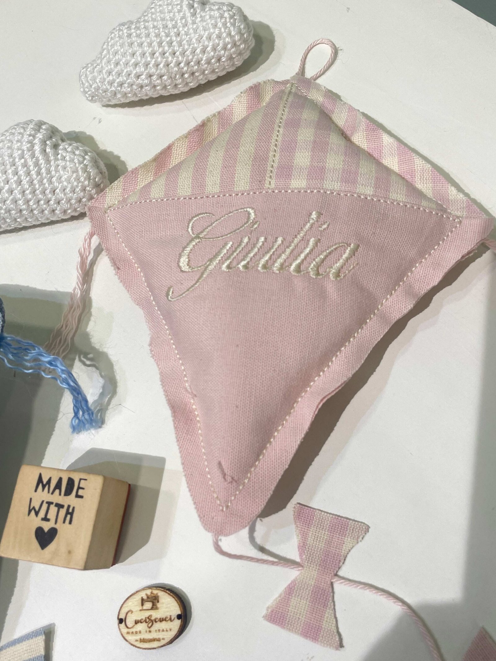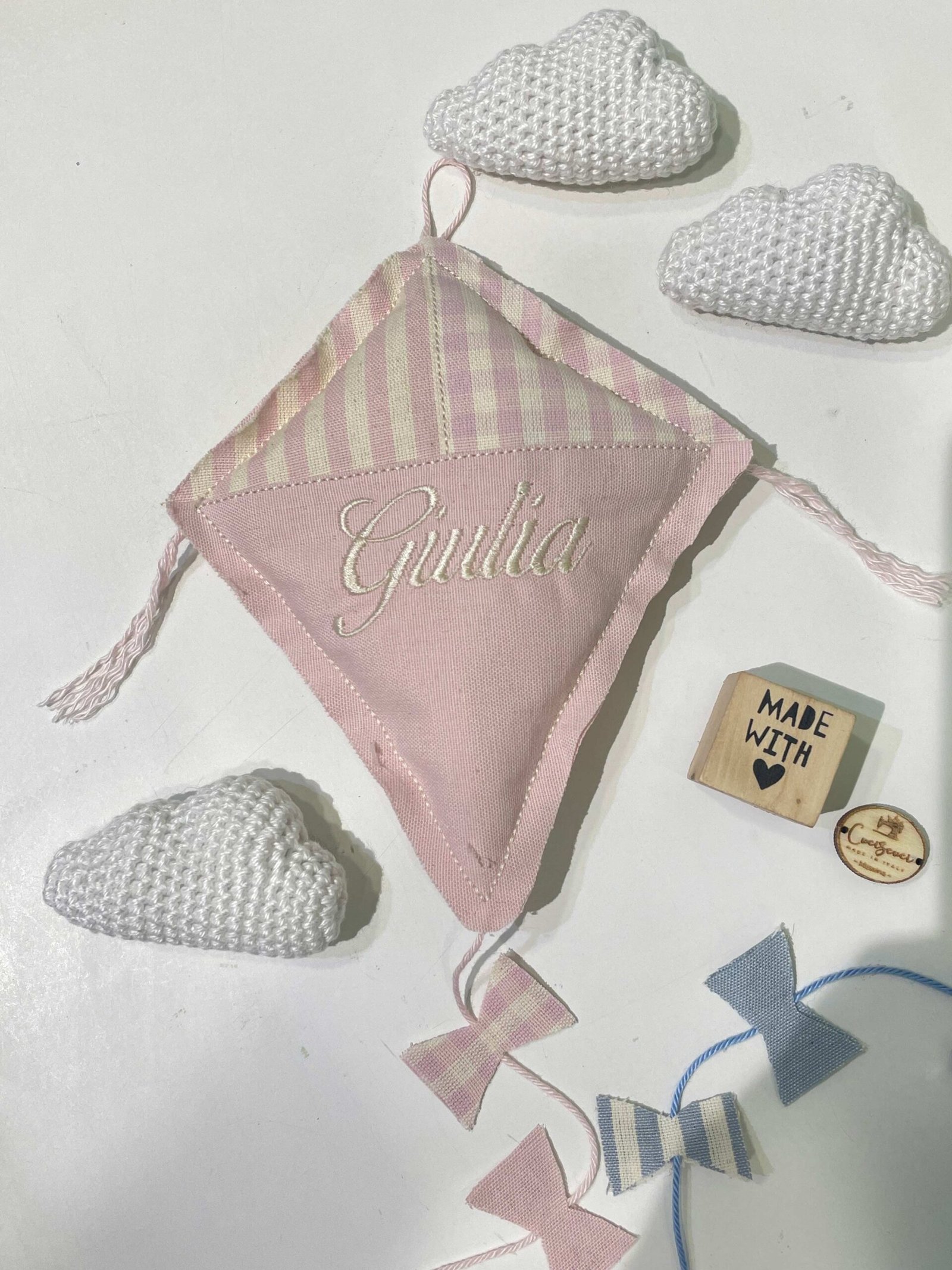 • Forma di aquilone, realizzato artigianalmente in cotone tinto filo rosa cipria