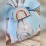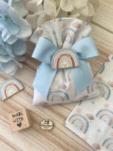 Il sacchetto, in tessuto di cotone bianco con fantasia arcobaleni celesti, è impreziosito dall’applicazione di una calamita in legno personalizzata.