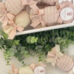 Il sacchetto è confezionato in cotone tinto filo, disponibile in fantasie assortite (o a scelta) nei toni delicati del rosa cipria e del panna, arricchito dal ricamo di un’iniziale.