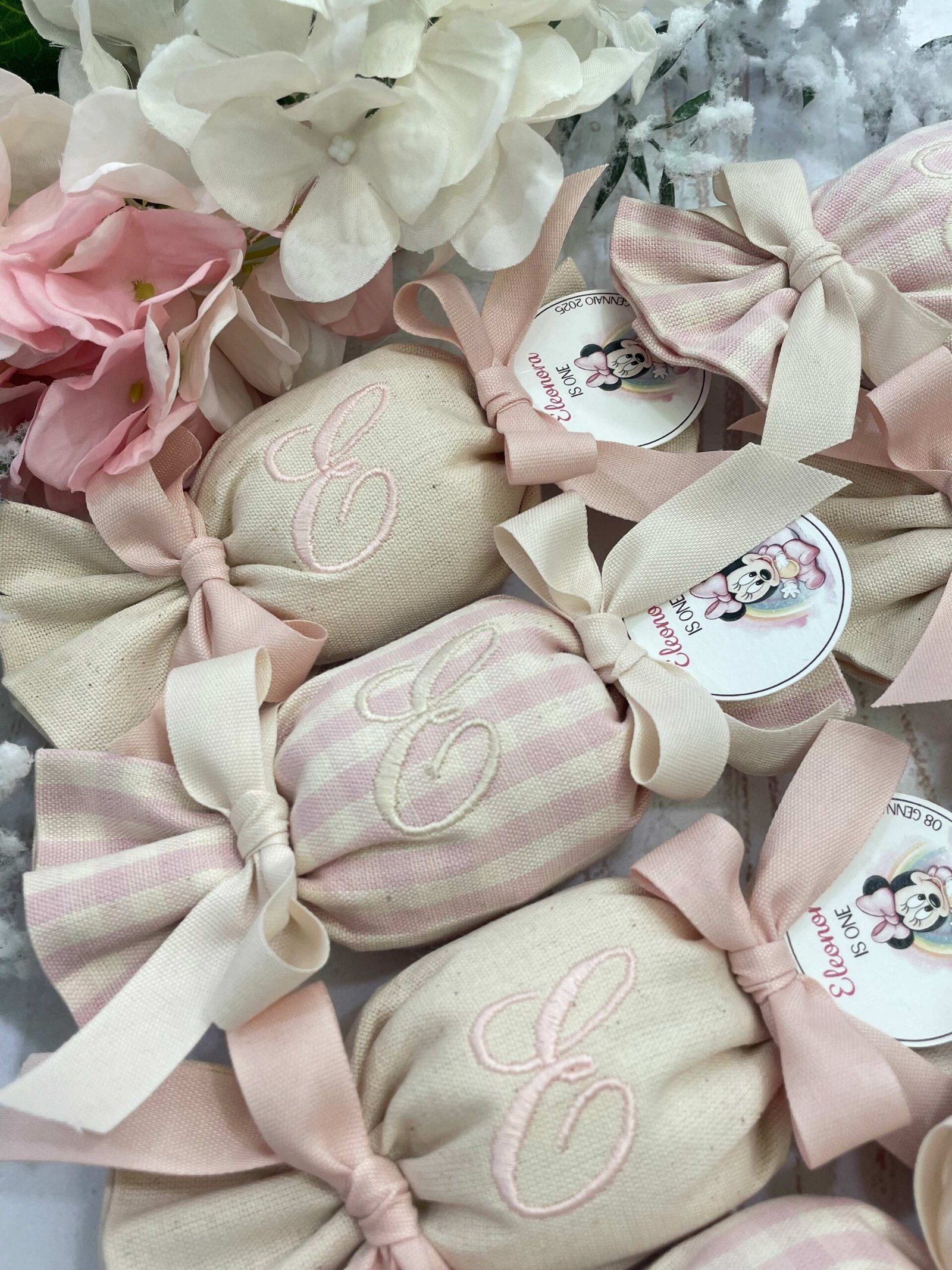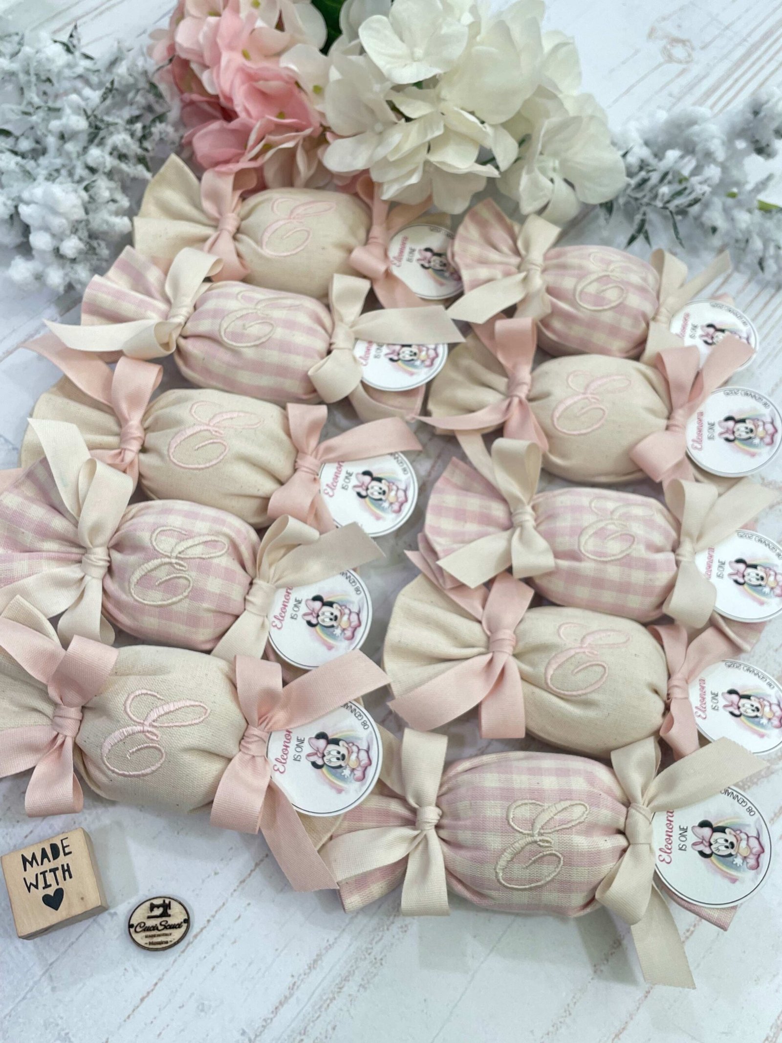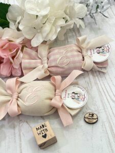 Il sacchetto è confezionato in cotone tinto filo, disponibile in fantasie assortite (o a scelta) nei toni delicati del rosa cipria e del panna, arricchito dal ricamo di un’iniziale.
